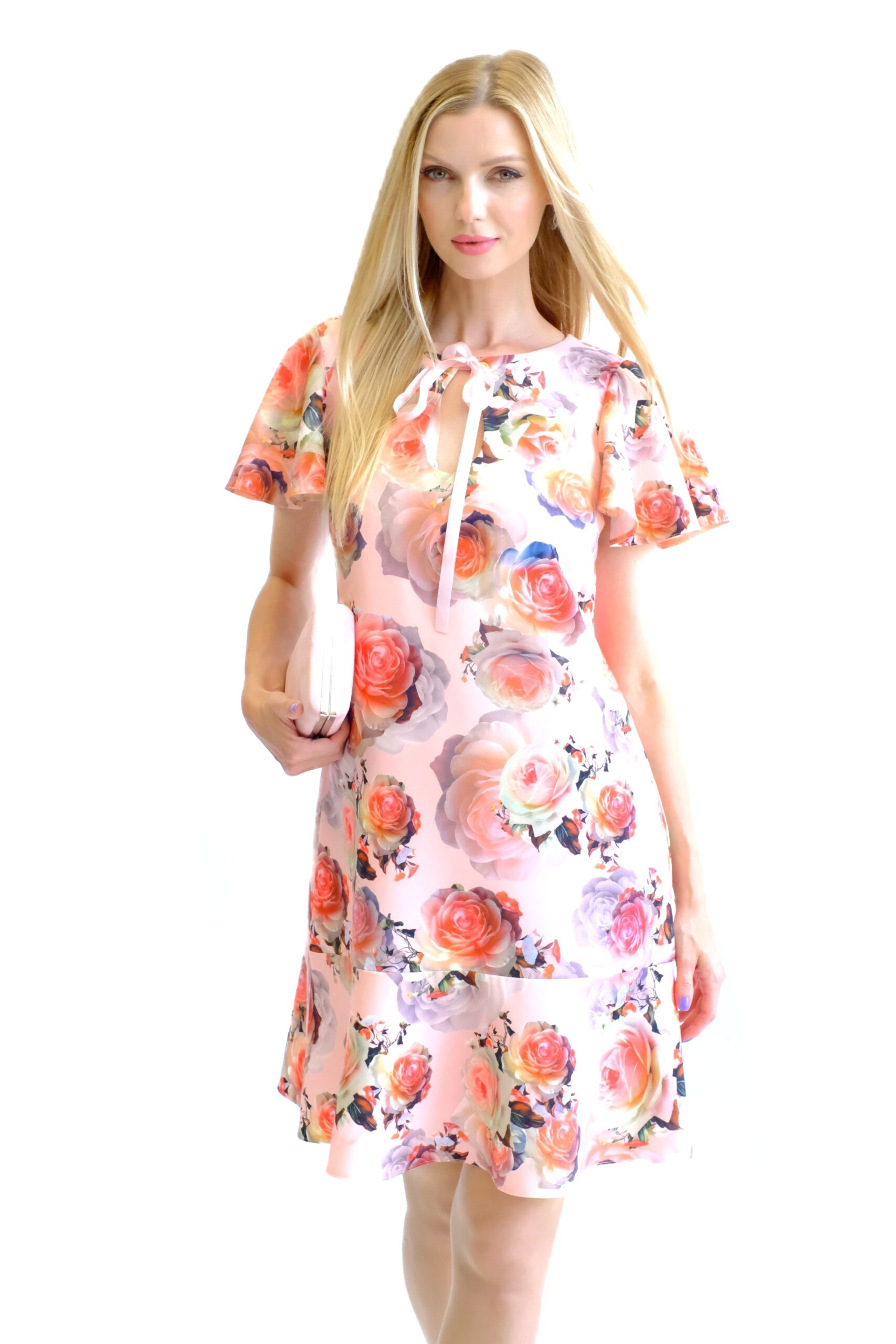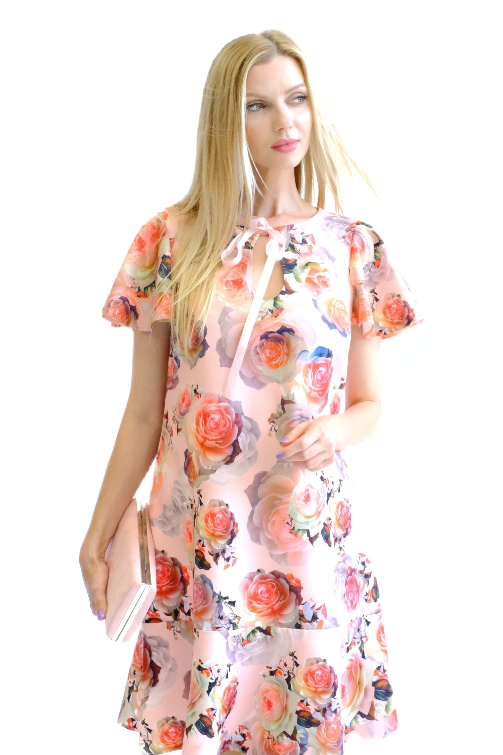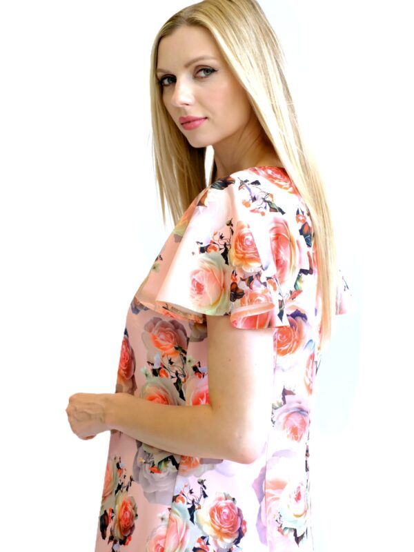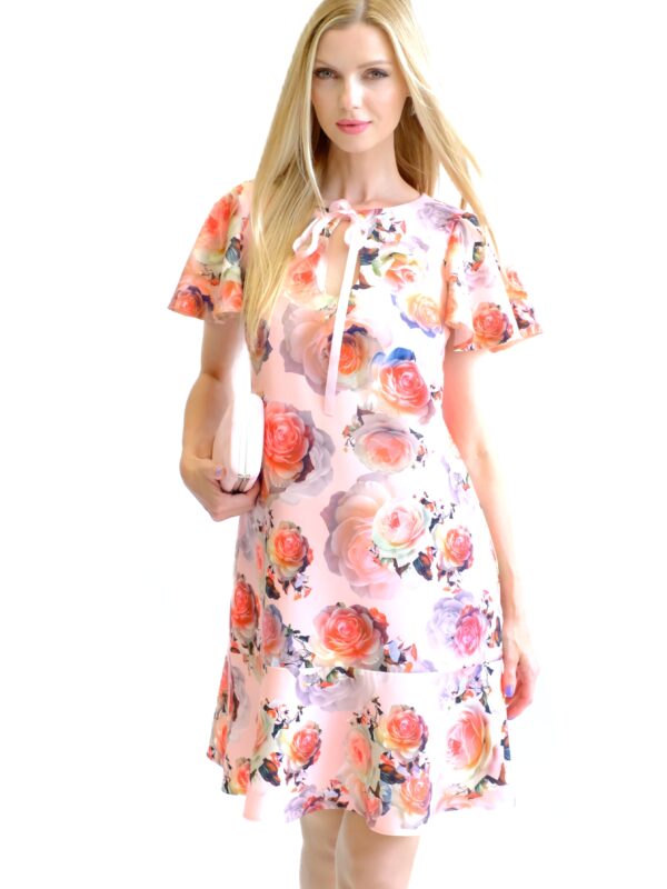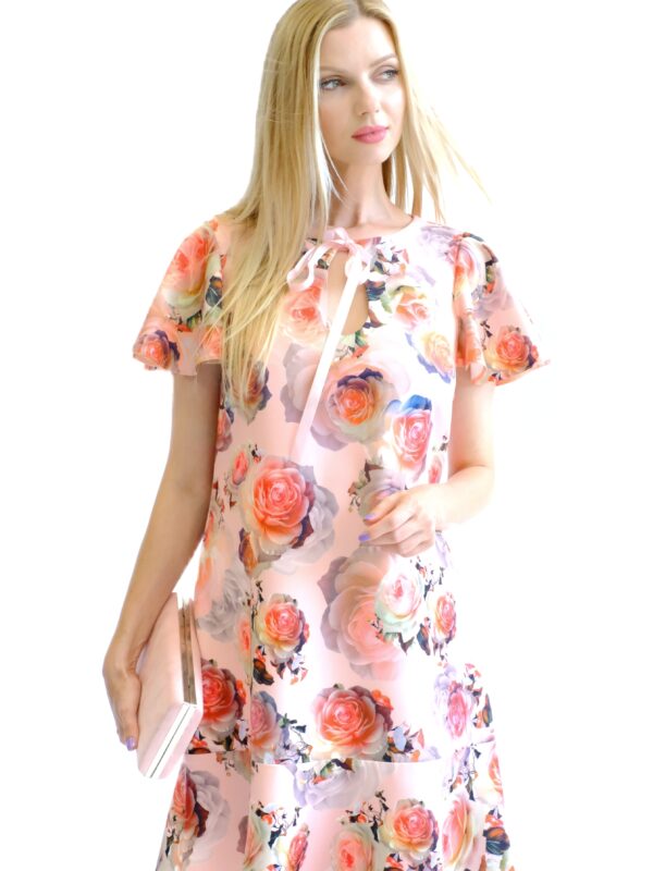Šaty sú navrhnuté v pohodlnom pozvoľna sa rozširujúcom strihu, ktorý výborne sadne na každý typ postavy. Šaty sú ušité z pevnejšieho stojatého materiálu, ktorý dovolí naplno vyniknúť volánovým efektom na šatách. Zaujímavým detailom na šatách je mašlička vo výstrihu. Šaty majú nenápadný, avšak krásny vzor ruží na pastelovo ružovom podklade. Šaty budú váš ideálny spoločník, na akúkoľvek letnú príležitosť. Kombinujte s pastelovými doplnkami ako naša stylistka.