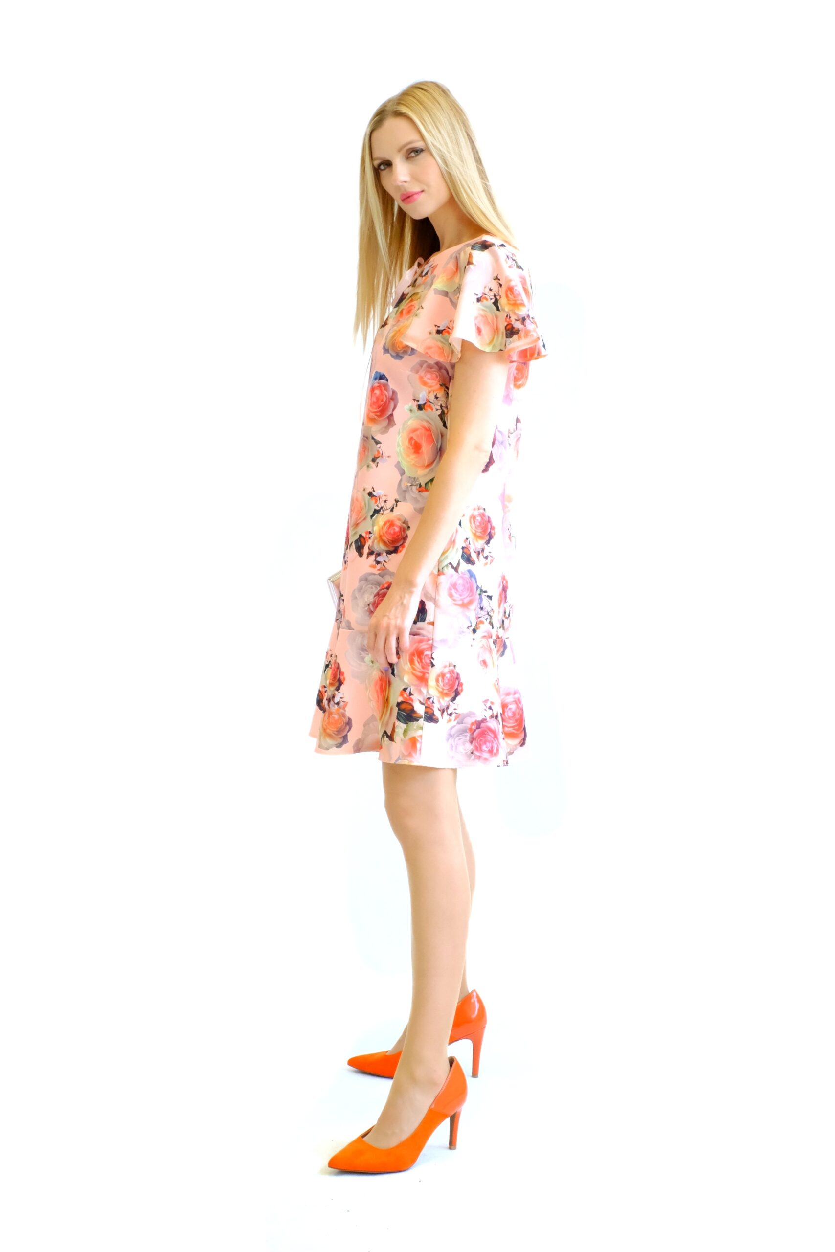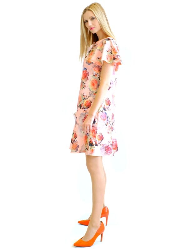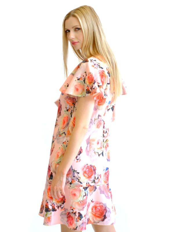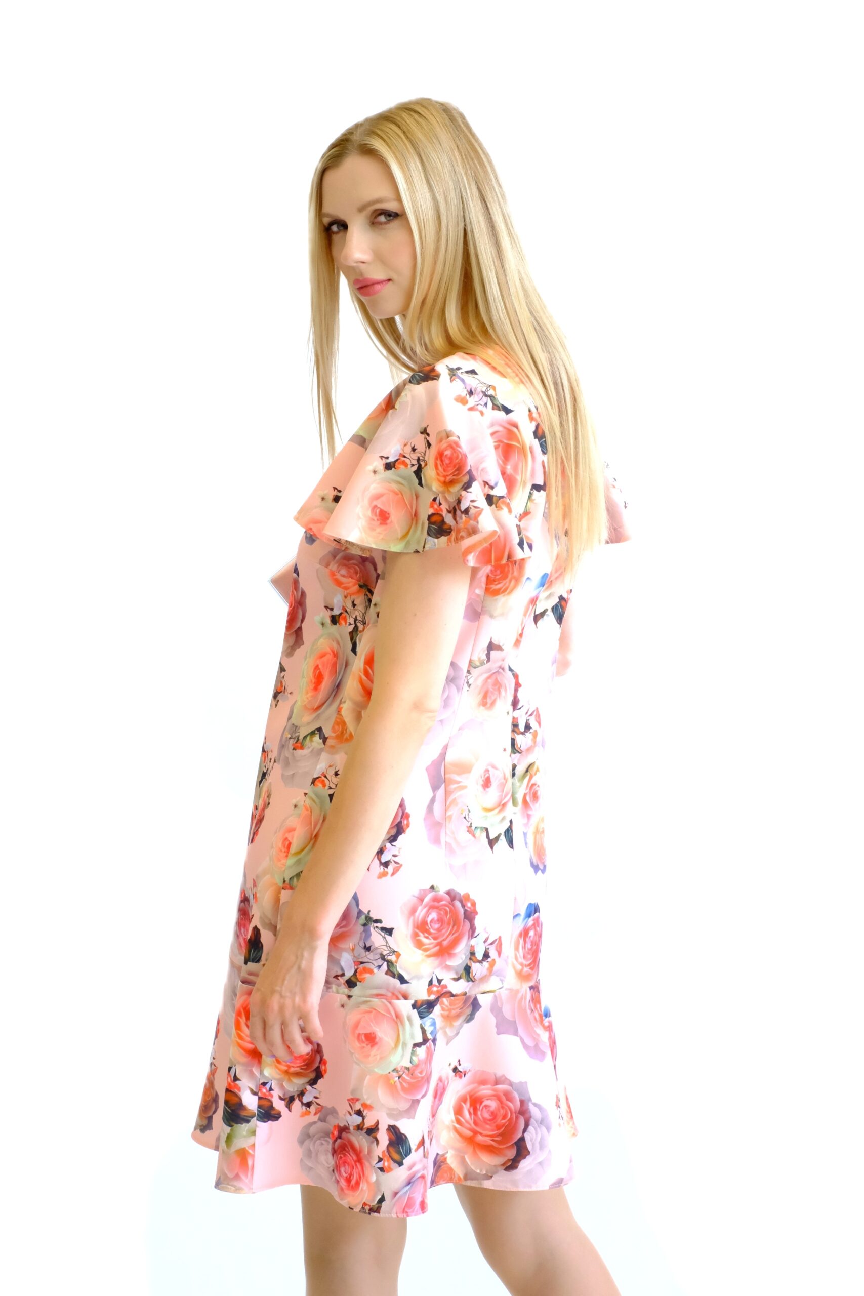 Šaty sú navrhnuté v pohodlnom pozvoľna sa rozširujúcom strihu, ktorý výborne sadne na každý typ postavy. Šaty sú ušité z pevnejšieho stojatého materiálu, ktorý dovolí naplno vyniknúť volánovým efektom na šatách. Zaujímavým detailom na šatách je mašlička vo výstrihu. Šaty majú nenápadný, avšak krásny vzor ruží na pastelovo ružovom podklade. Šaty budú váš ideálny spoločník, na akúkoľvek letnú príležitosť. Kombinujte s pastelovými doplnkami ako naša stylistka.