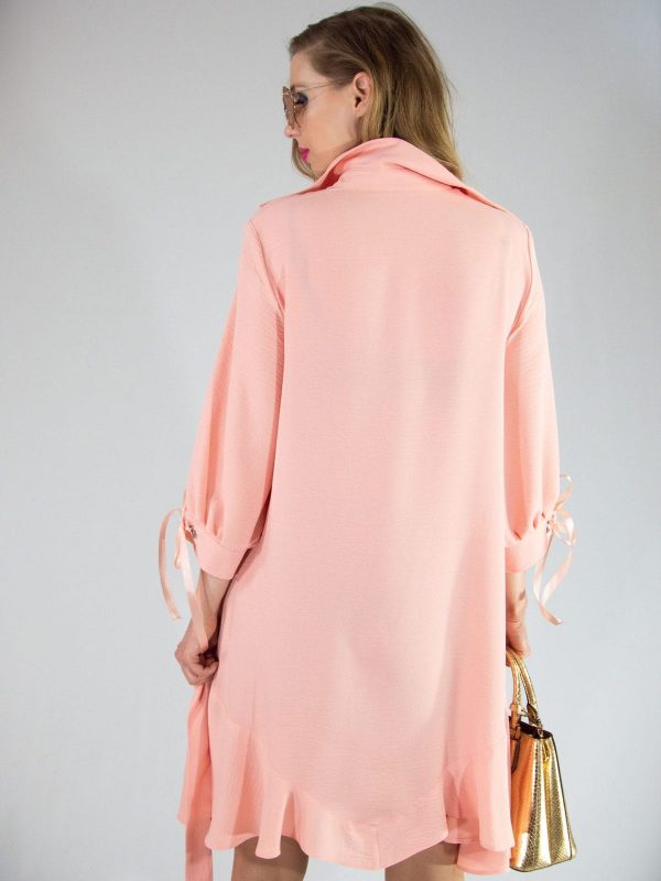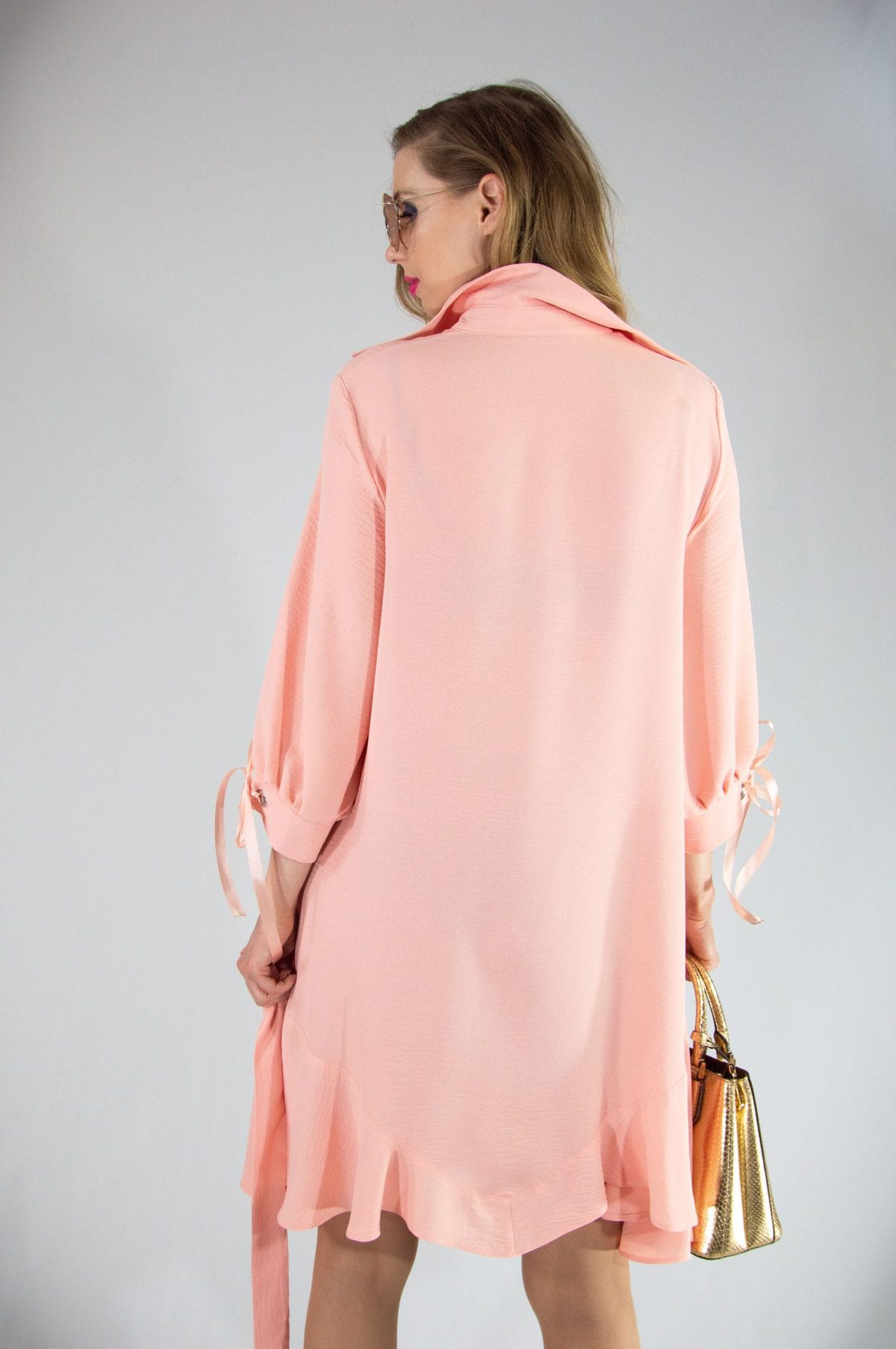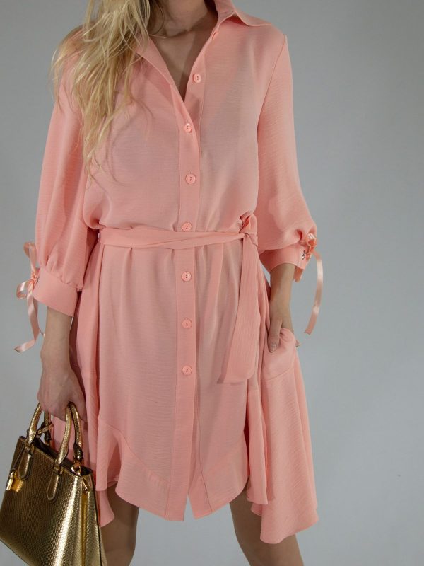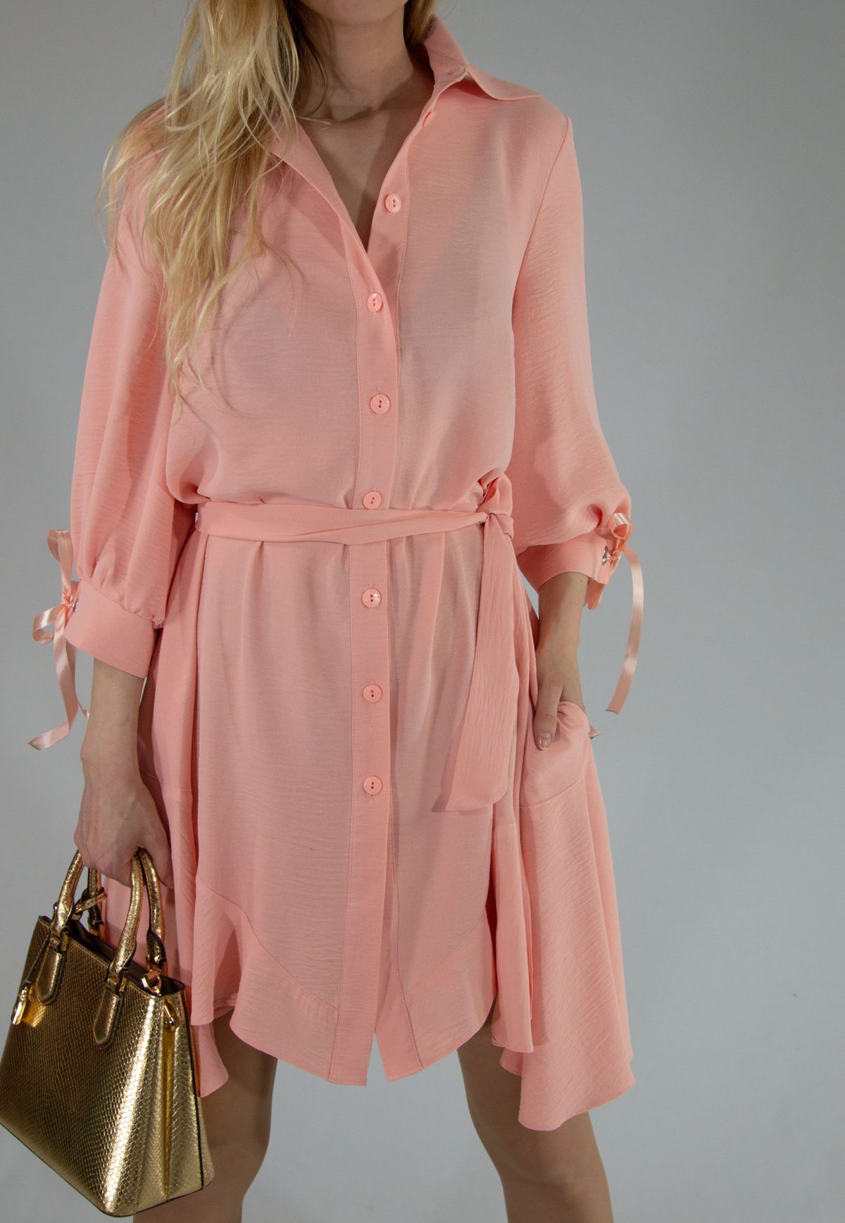Šaty ušité v pastelovo broskyňovej farbe a v obľúbenom košeľovom strihu, ktorý sadne skvele na každú postavu. Šaty majú aj opasok z rovnakého materiálu. Skombinujte so zlatými doplnkami a vyrazte do mesta alebo na oslavu. Šaty sú asymetricky strihané a sú dlhšie po stranách.