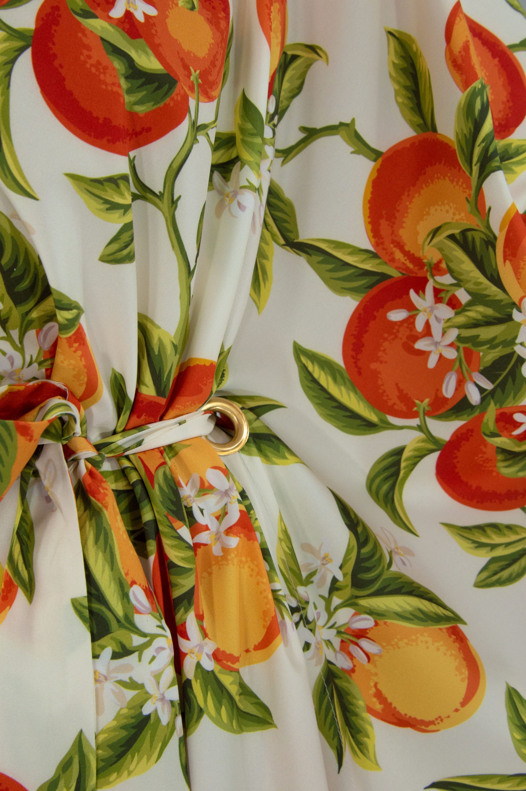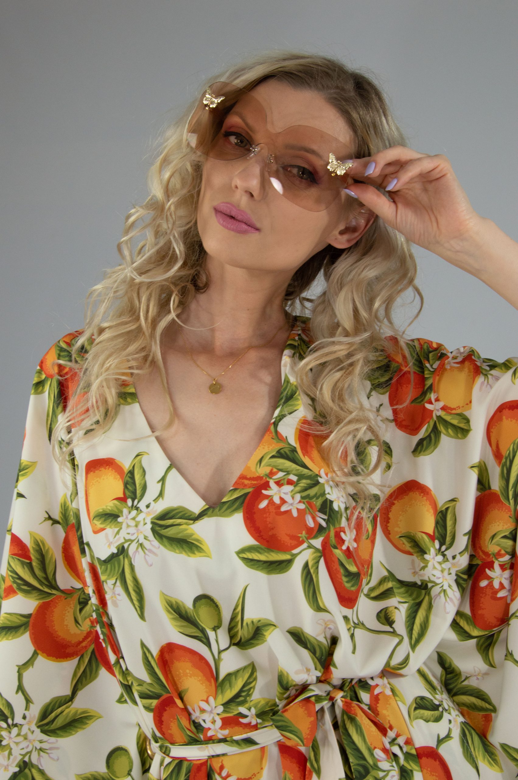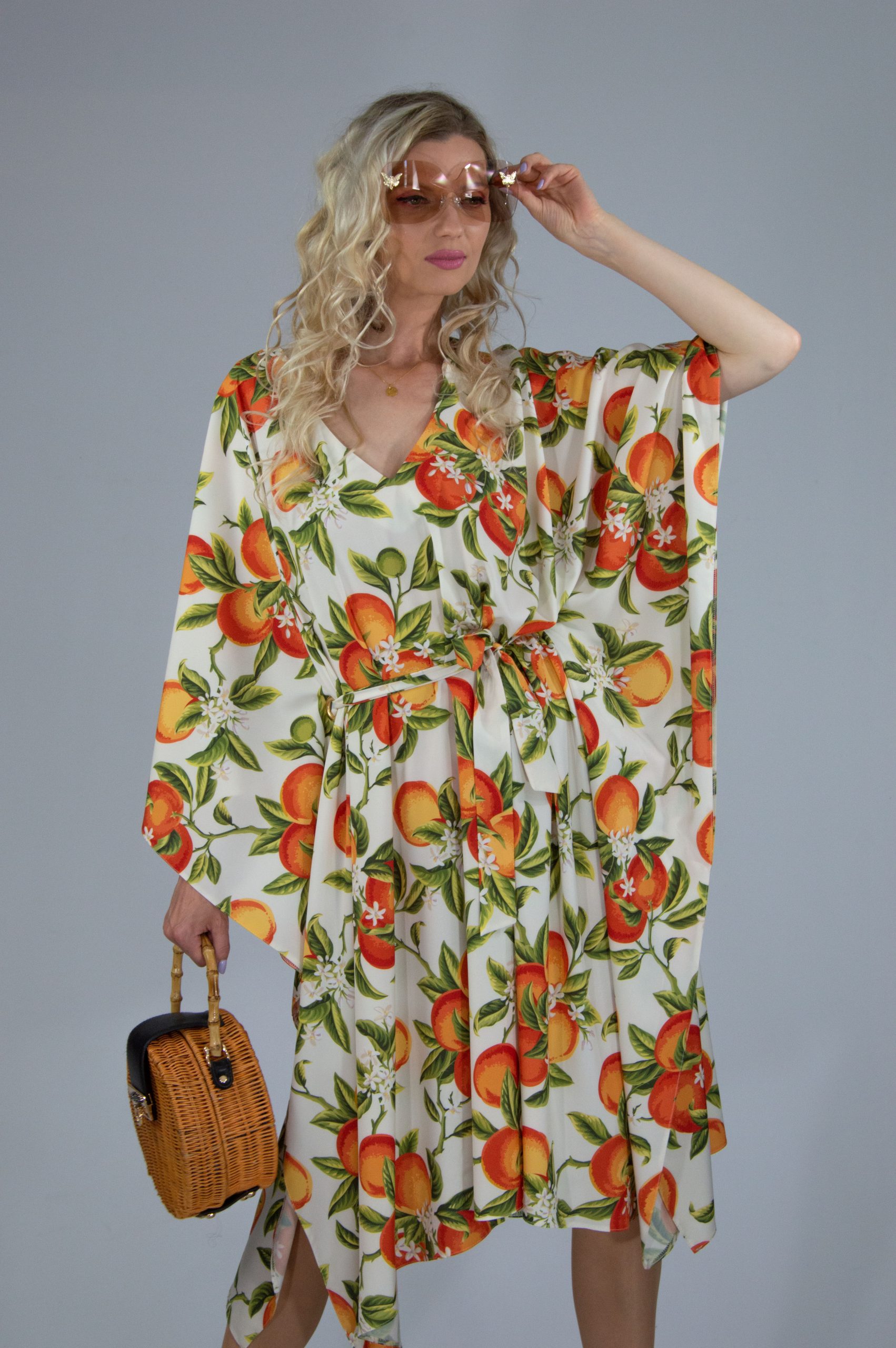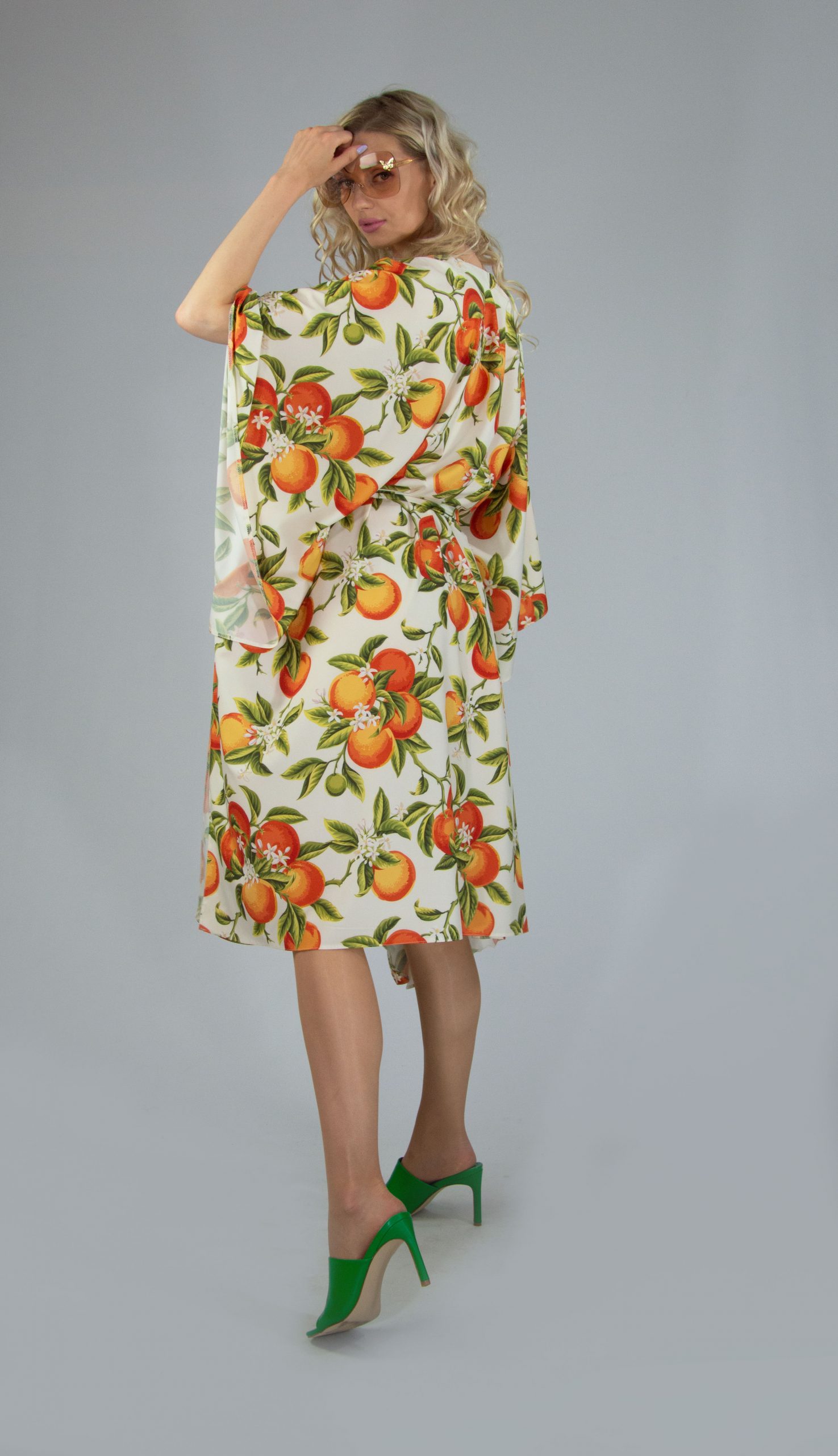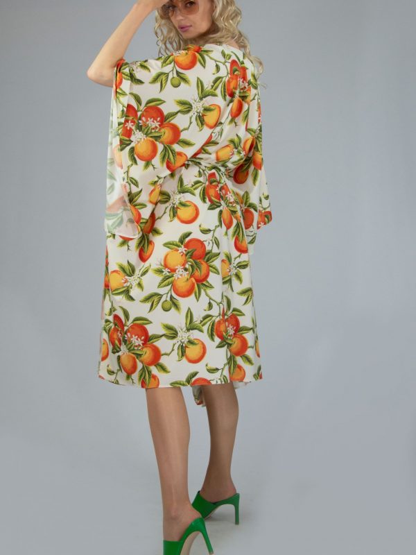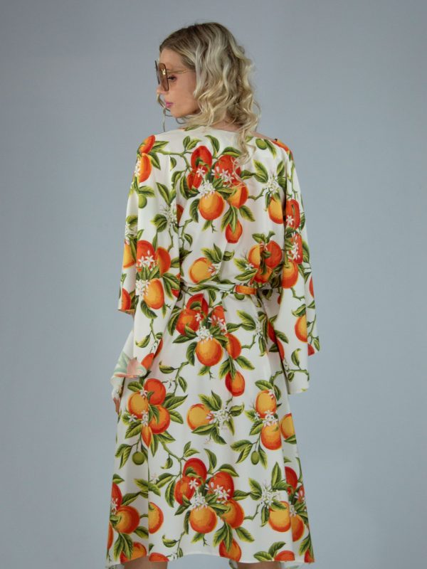 Šaty sú ušité z jedného štvorca látky, ktorý je predelený očkami, cez ktoré vedie opasok. Vďaka tomuto strihu máte jednoduché letné šaty, ktoré sú veľmi voľné a sadnú skvele na každú postavu. Jednoduchý strih necháva vyniknúť práve krásnemu vzoru pomarančov. Keď si raz oblečiete tieto šaty už ich dole kvôli komfortu nebudete chcieť dať dole.