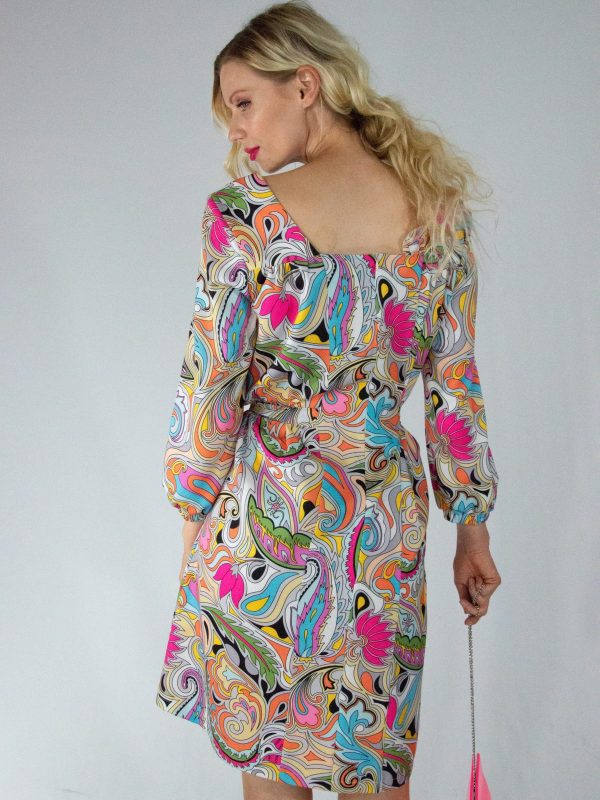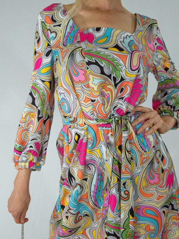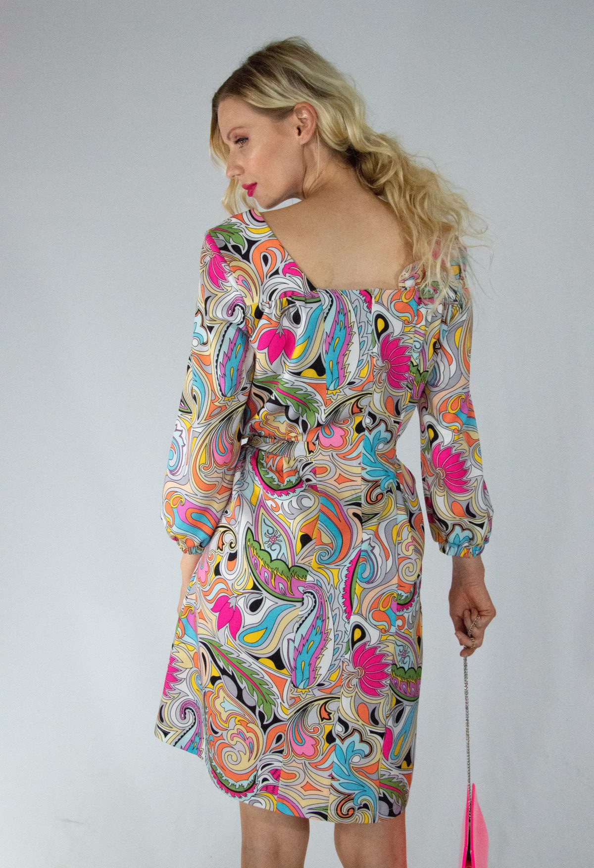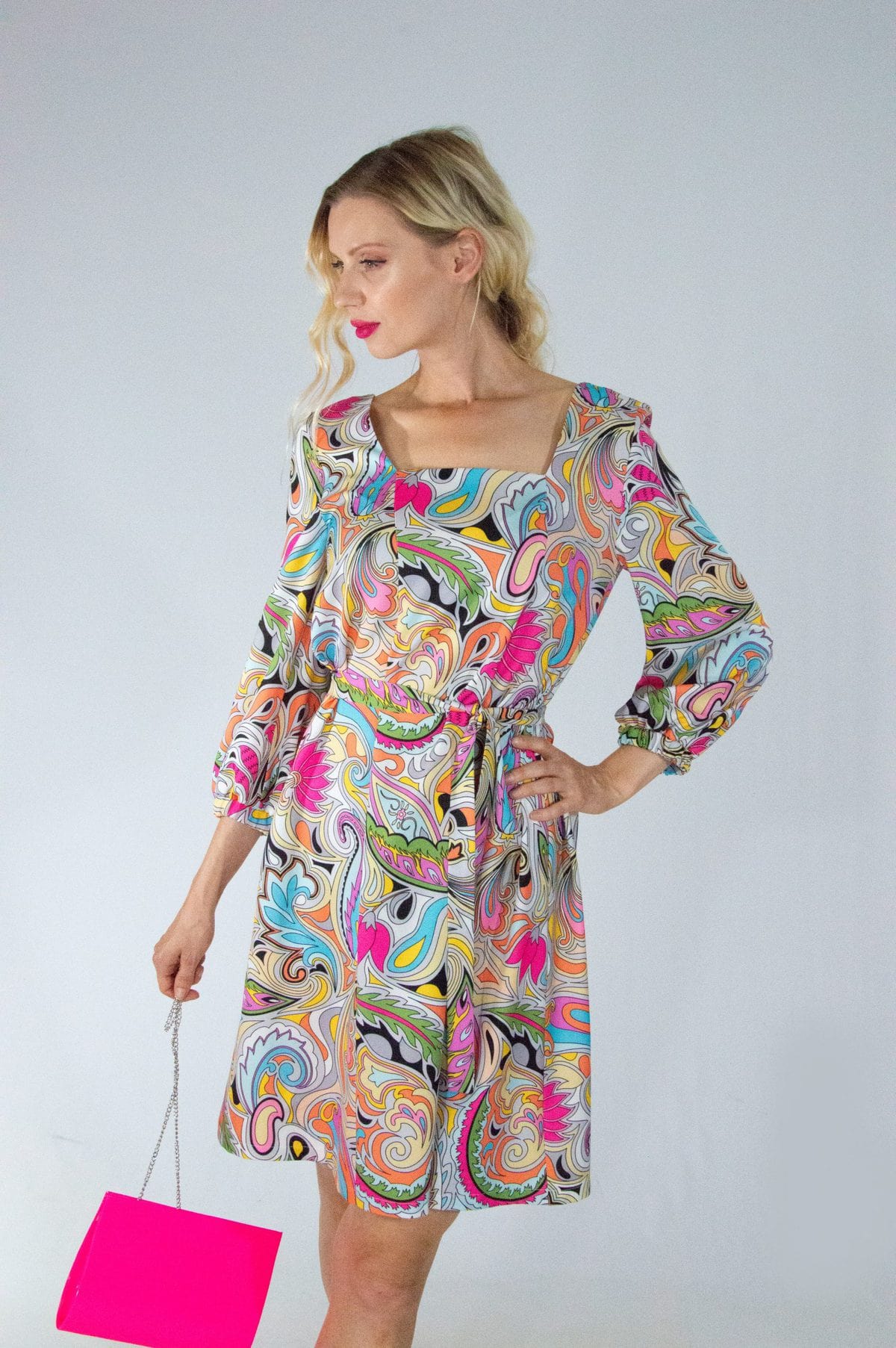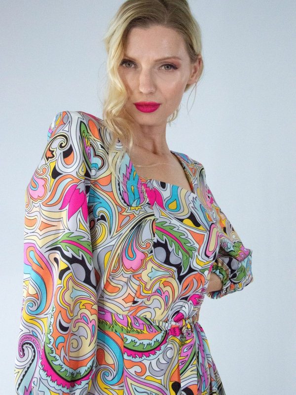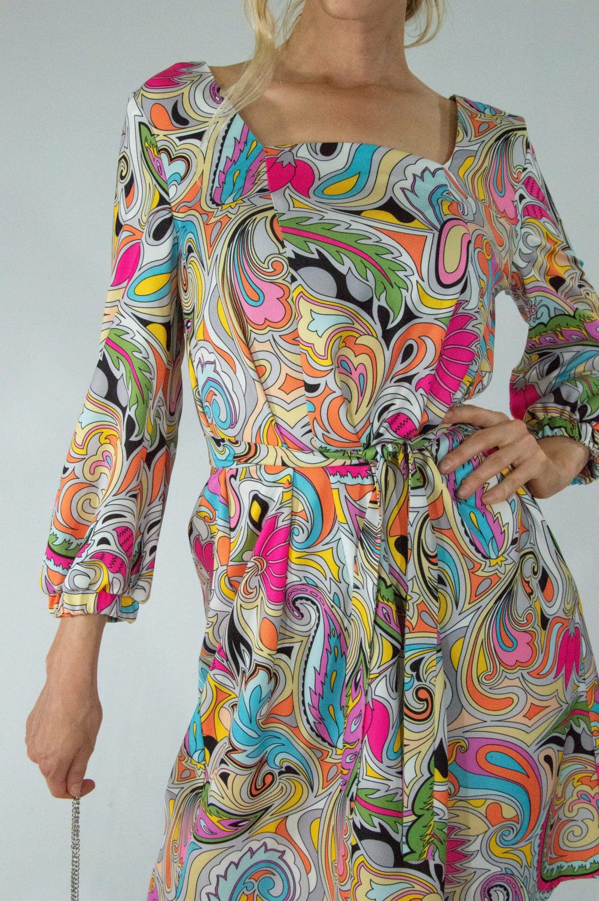 Šaty, ktoré žiaria veselými farbami a rozžiaria Vás každý raz, keď si ich oblečiete. Šaty sú navrhnuté vo veľmi pohodlnom áčkovom strihu, ktorého súčasťou je aj opasok z rovnakej látky. Šaty majú geometrický výstrih a voľné rukávy.