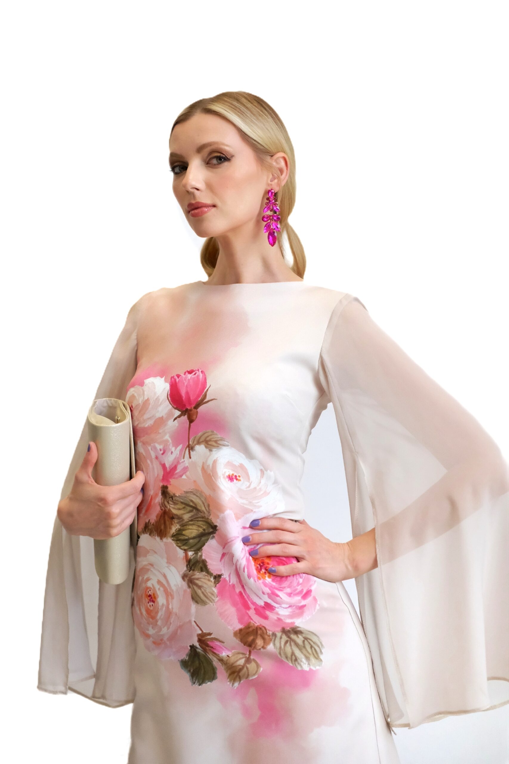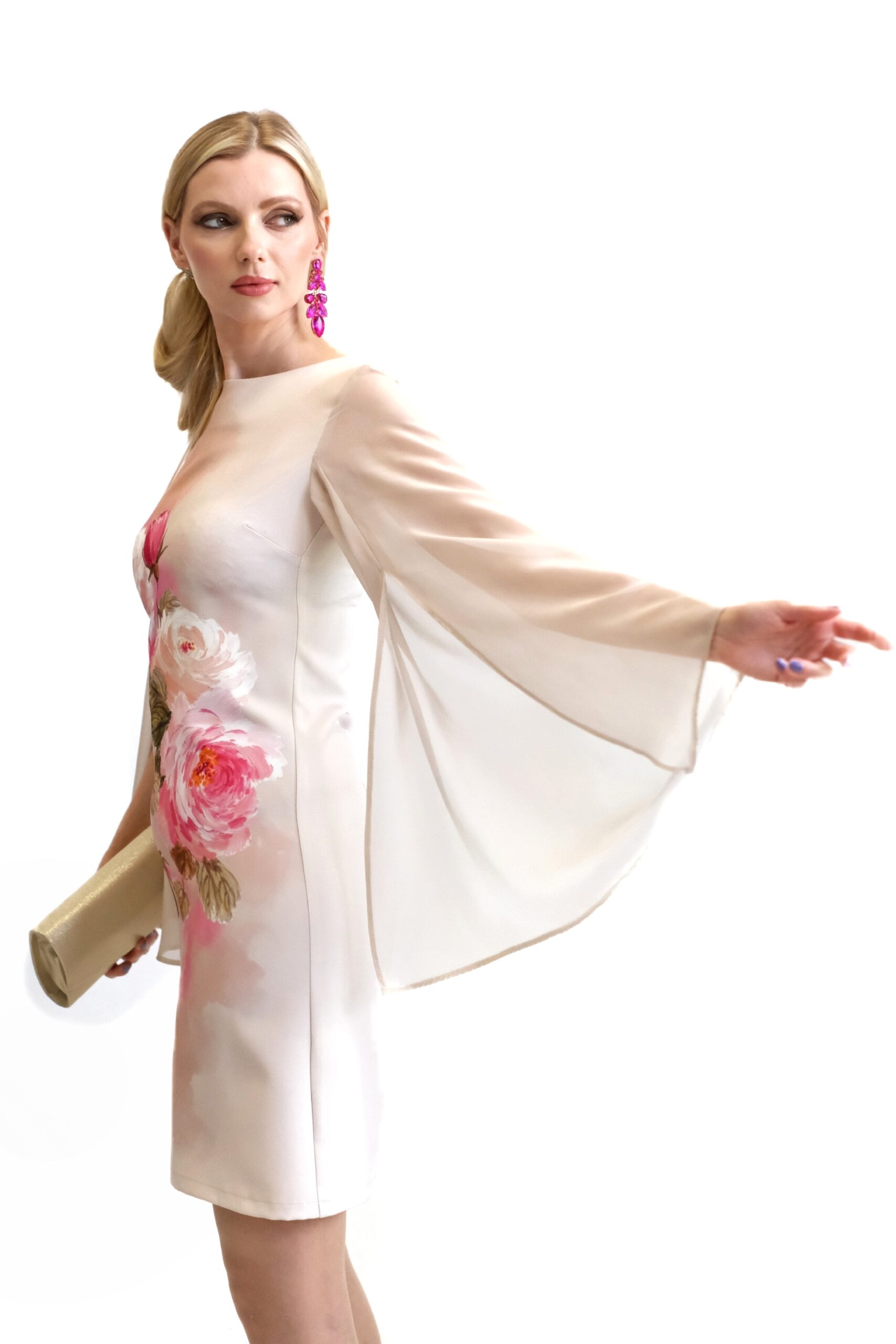 Šaty sú navrhnuté v pohodlnom strihu mierne do áčka, ktorý výborne sadne na postavu a budete sa v ňom cítiť komfortne. Šaty sú ušité v nádhernej kvetinovej potlači na béžovom pozadi. Rukávy na šatách sú navrhnuté z jemného šifónu, ktorý šatám dodáva vzdušnosť . Šaty sú navrhnuté v dĺžke po kolená a skvele sa hodia svojími pastelovými farbami a kvetinovým vzorom na nadchádzajúce jarné a letné udalosti. Výrazný kvetinový vzor na šatách hra odtieňmi rúžovej a cyklaménovej. Pre wau efekt kombinujte s výraznými cyklamenovými a bezovými doplnkami ako naša aranžérka.