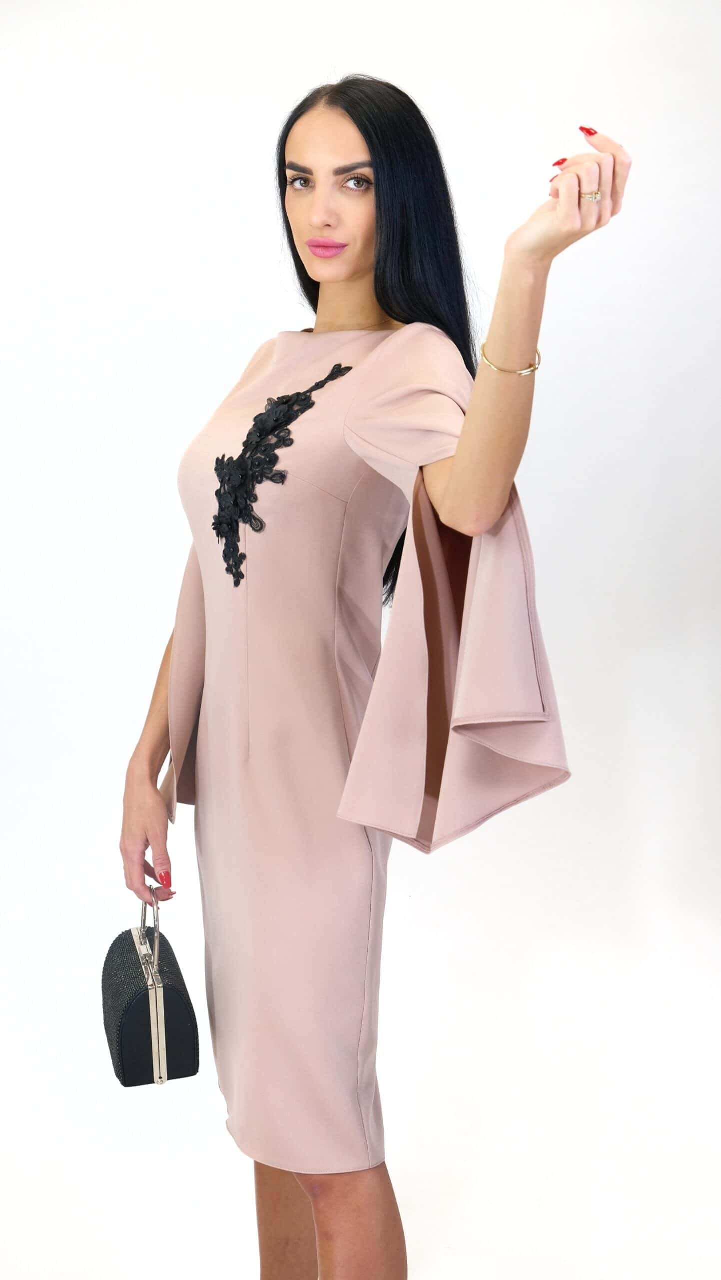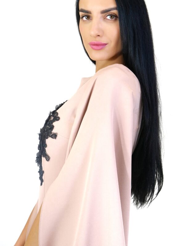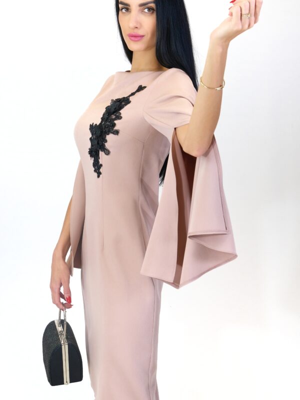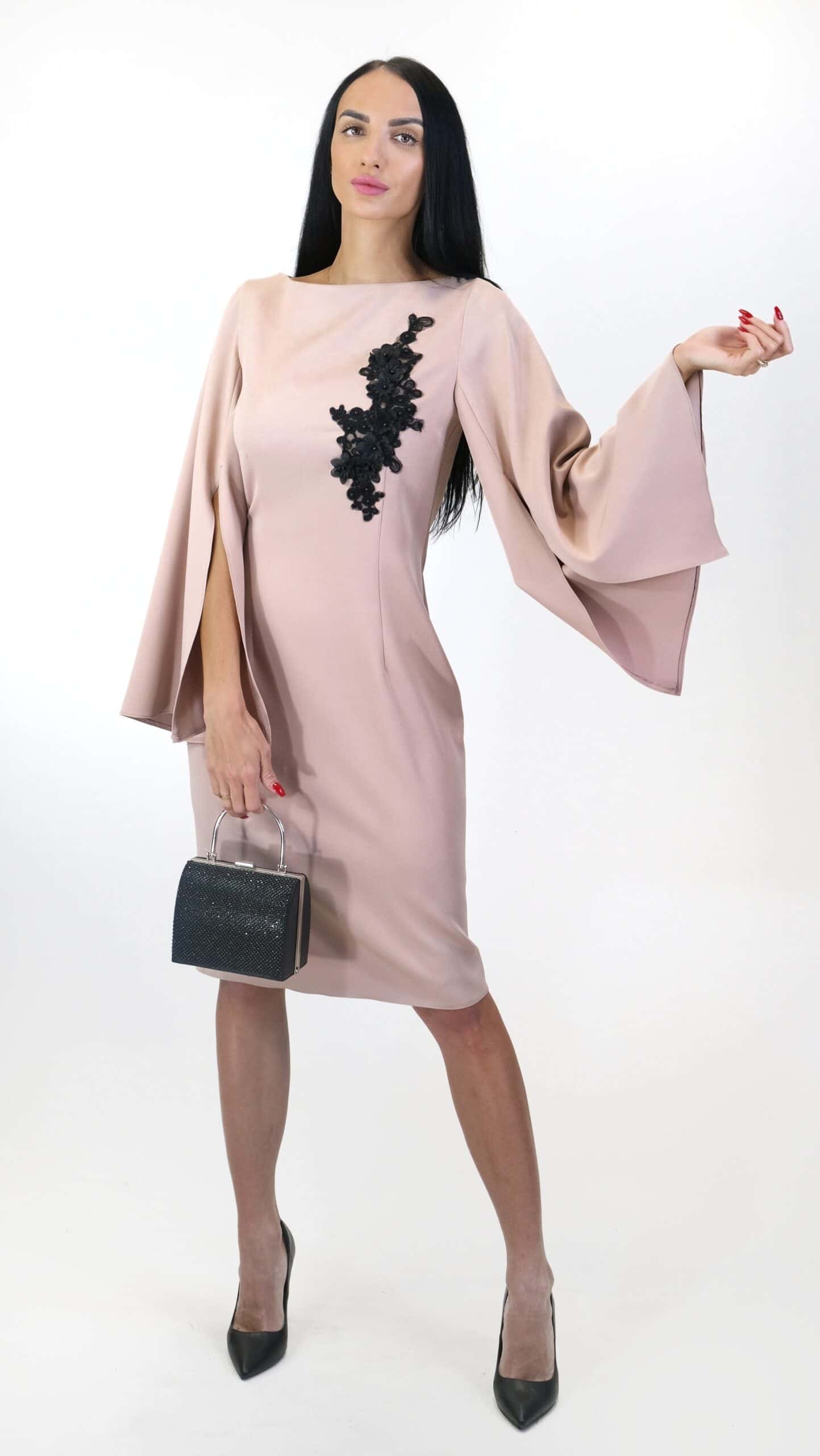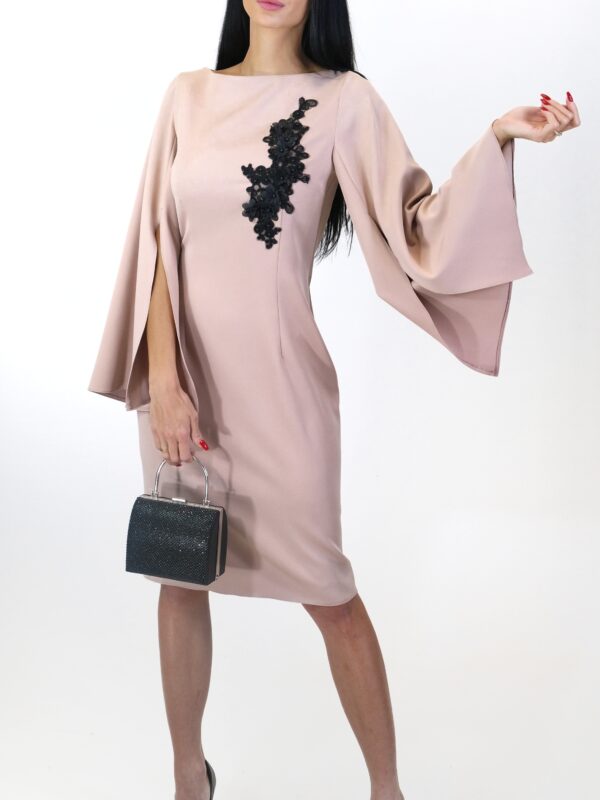 Šaty sú navrhnuté v strihu, ktorý vďaka šikovným prestrihom sadne na postavu ako uliaty. Šaty majú výrazne dlhé rukávy, ktoré sú prestrihnuté a dodávajú im na elegancii. Šaty sú ušité v neutrálnej telovej farbe s výraznou čiernou aplikáciou. Ak ich skombinujete s čiernymi doplnkami ako naša stylistka , tak aj napriek ich strihovej jednoduchosti vyniknete na každej oslave alebo inej výnimočnej príležitosti.