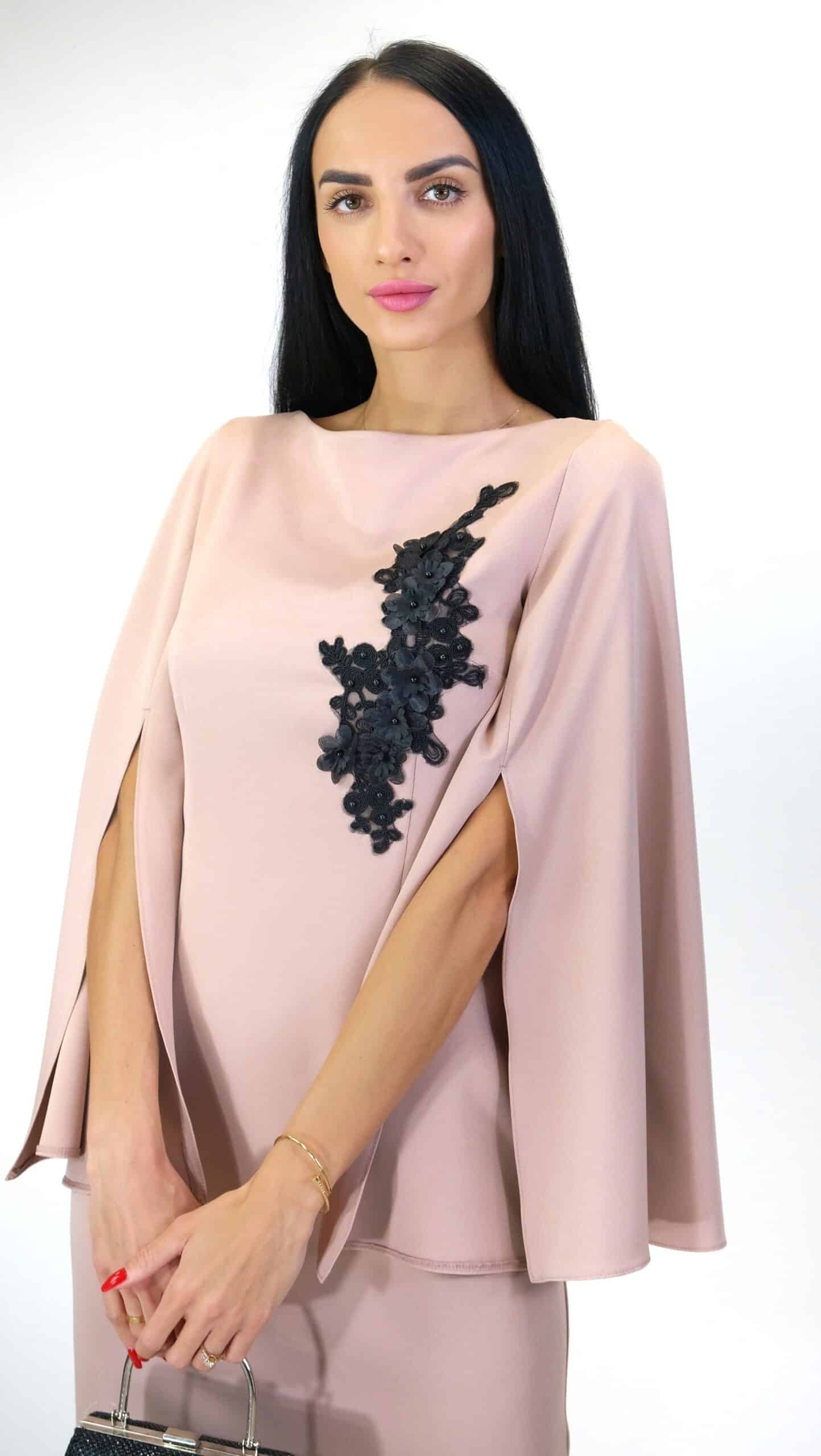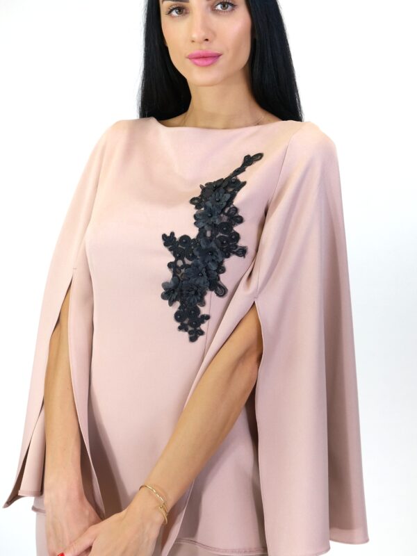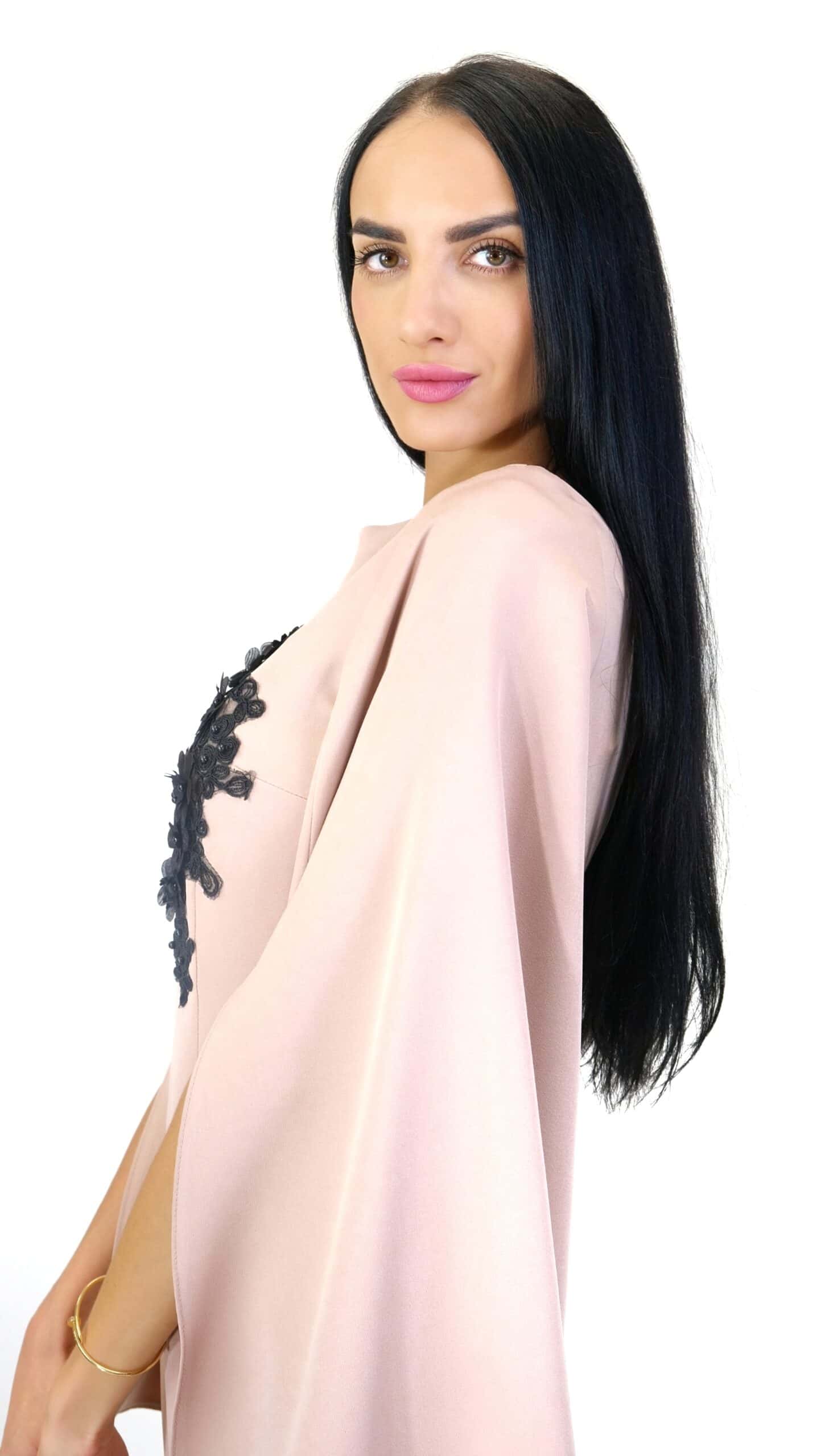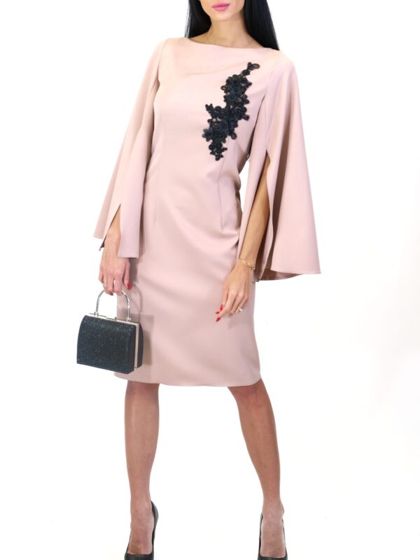 Šaty sú navrhnuté v strihu, ktorý vďaka šikovným prestrihom sadne na postavu ako uliaty. Šaty majú výrazne dlhé rukávy, ktoré sú prestrihnuté a dodávajú im na elegancii. Šaty sú ušité v neutrálnej telovej farbe s výraznou čiernou aplikáciou. Ak ich skombinujete s čiernymi doplnkami ako naša stylistka , tak aj napriek ich strihovej jednoduchosti vyniknete na každej oslave alebo inej výnimočnej príležitosti.