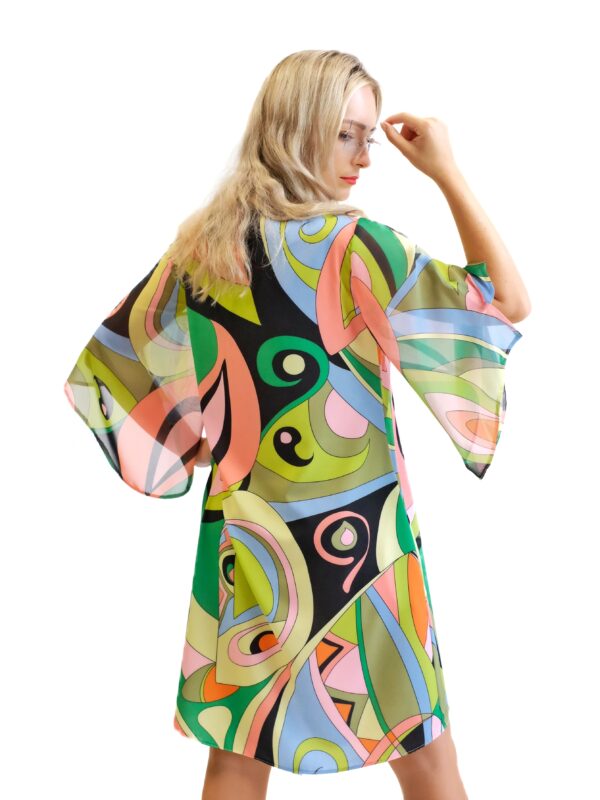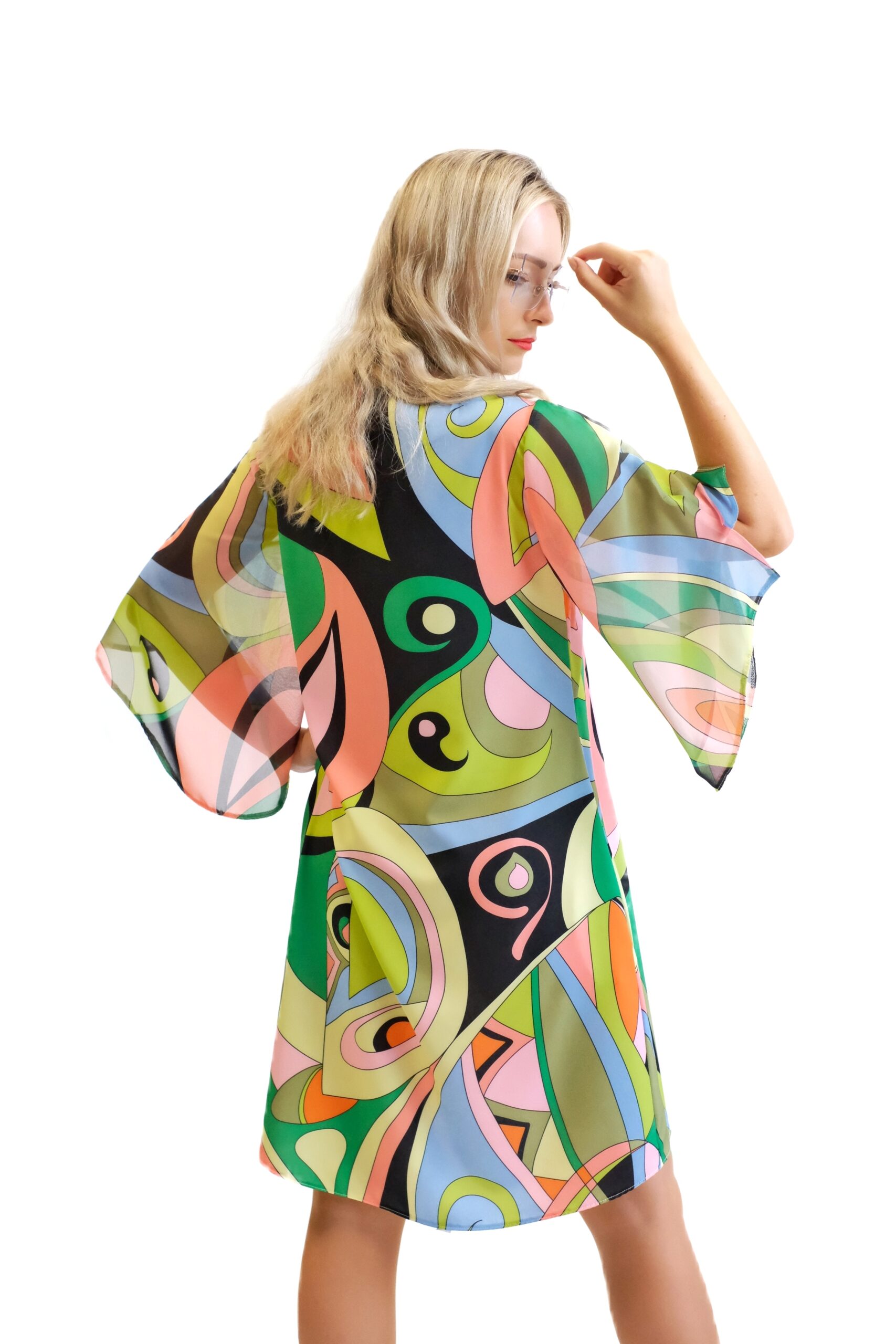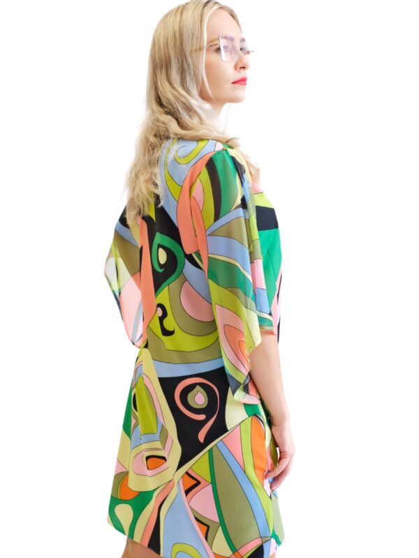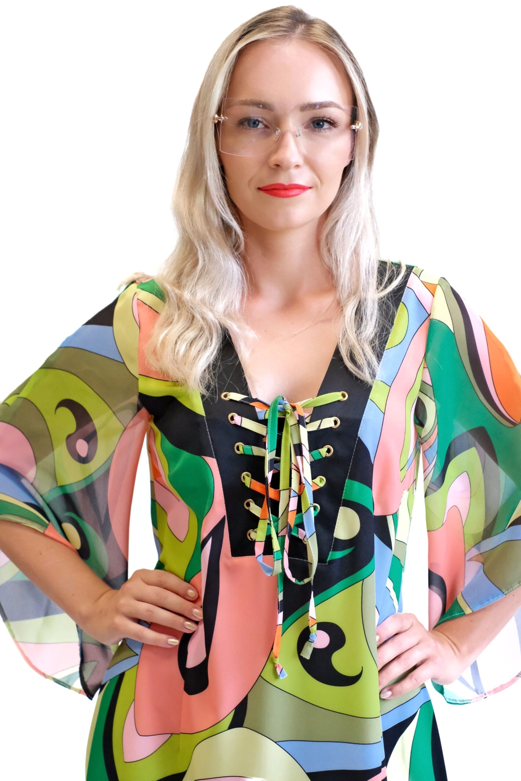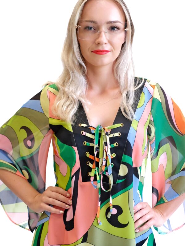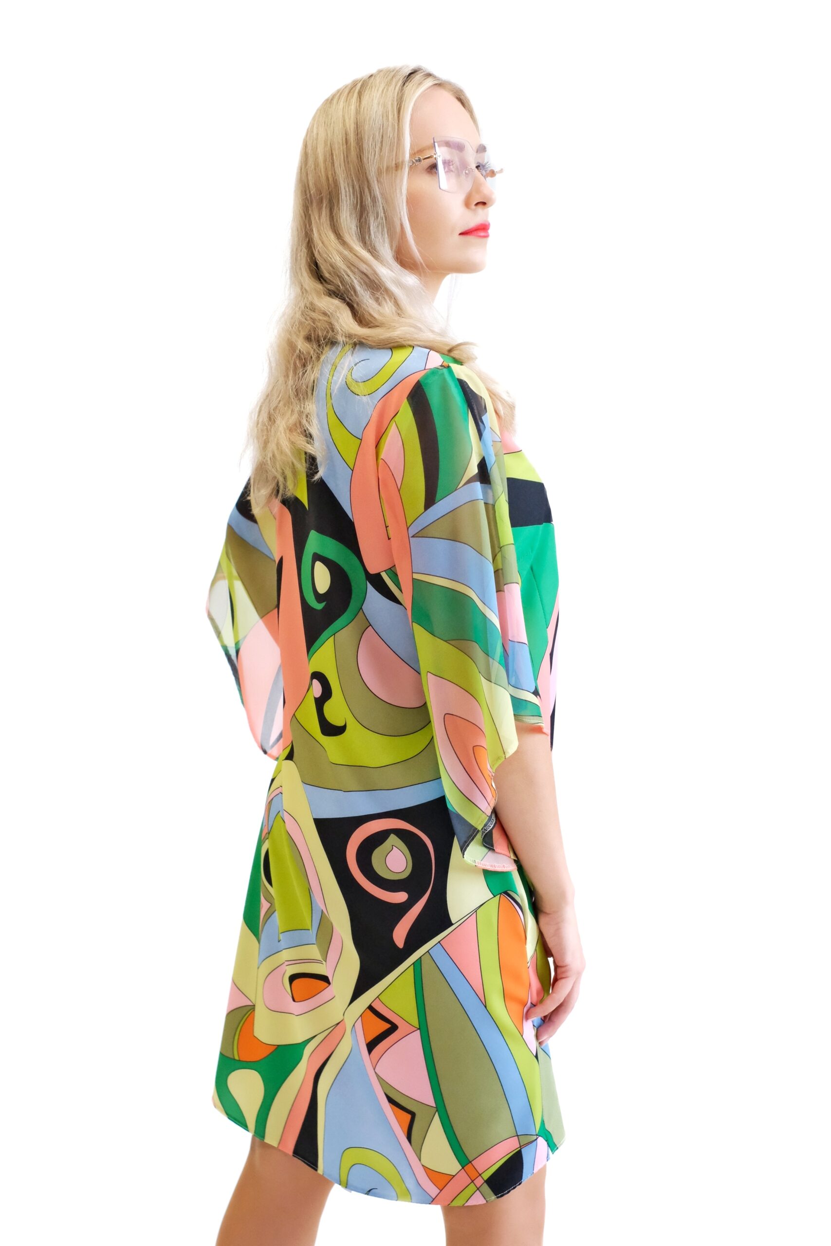 Šaty sú navrhnuté v pohodlnom áčkovom oversize strihu, ktorý výborne sadne na každý typ postavy. Šaty sú ušité z ľahkého priedušného materiálu, v ktorom sa budete cítiť skvel aj počas horúcich letných dní. Šaty majú voľné bohémske rukávy a praktické vrecká, ktoré im dodávajú na ležérnosti. Šaty majú viazačku vo výstrihu, s ktorou si ho môžete regulovať. Šaty sú navrhnuté vo výraznom geometrickom vzore, ktorý hrá všetkými farbami. Kombinujte so zelenými doplnkami ako naša aranžérka.