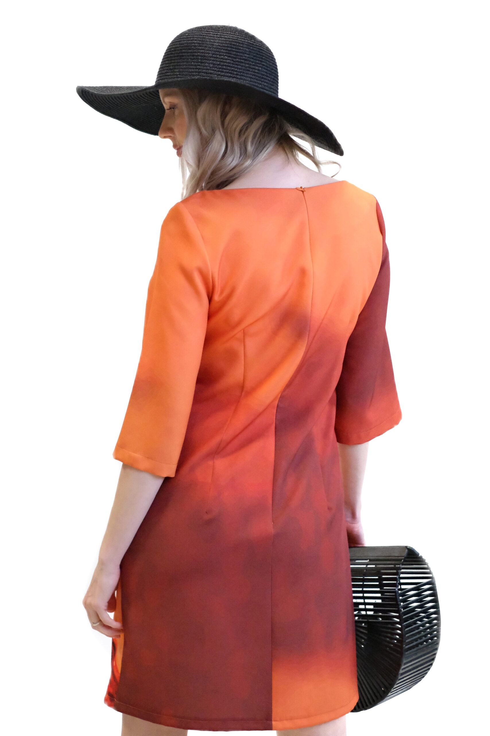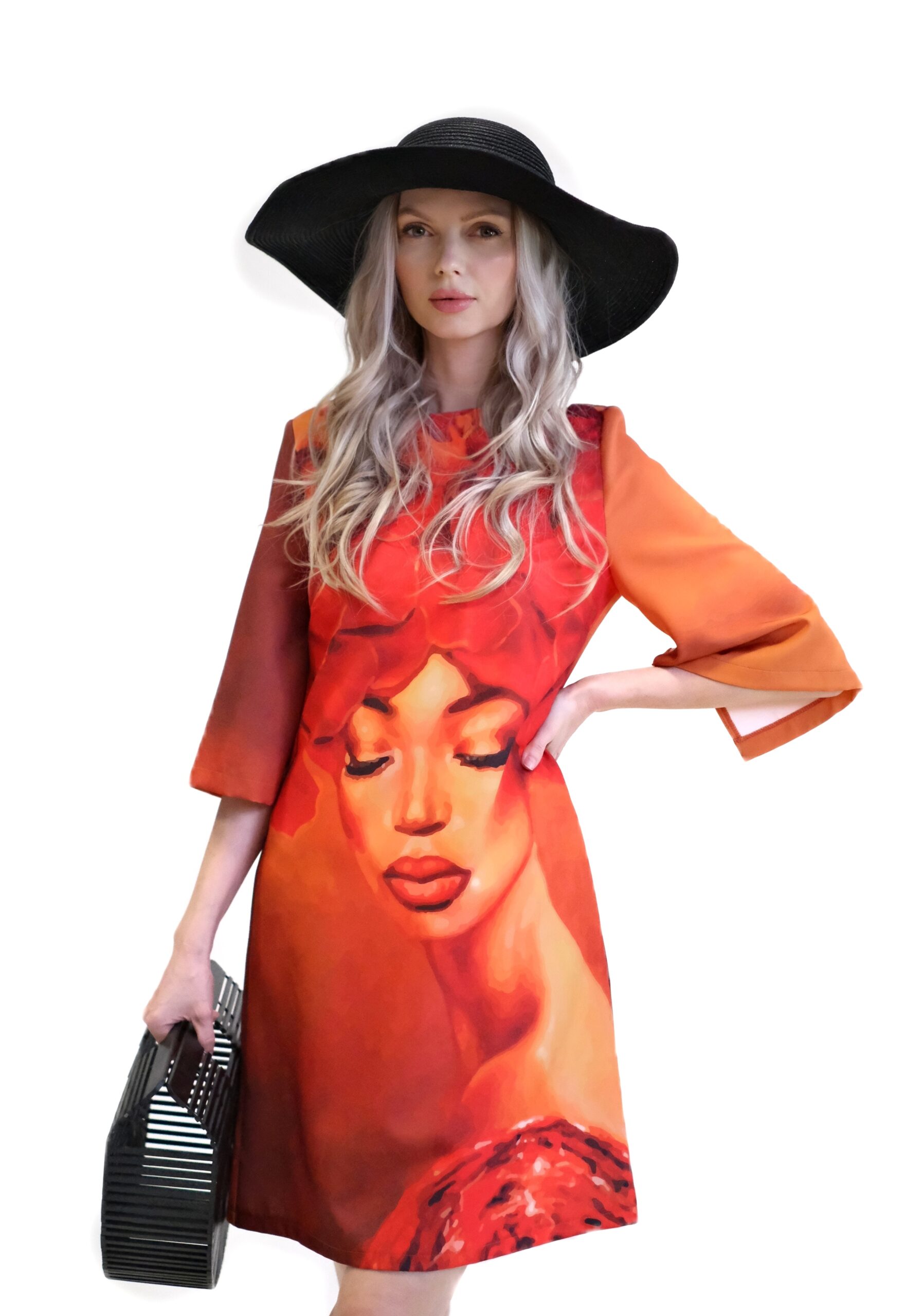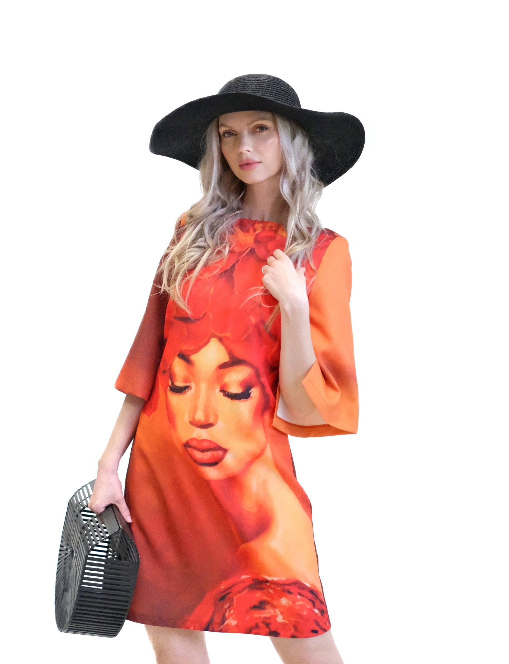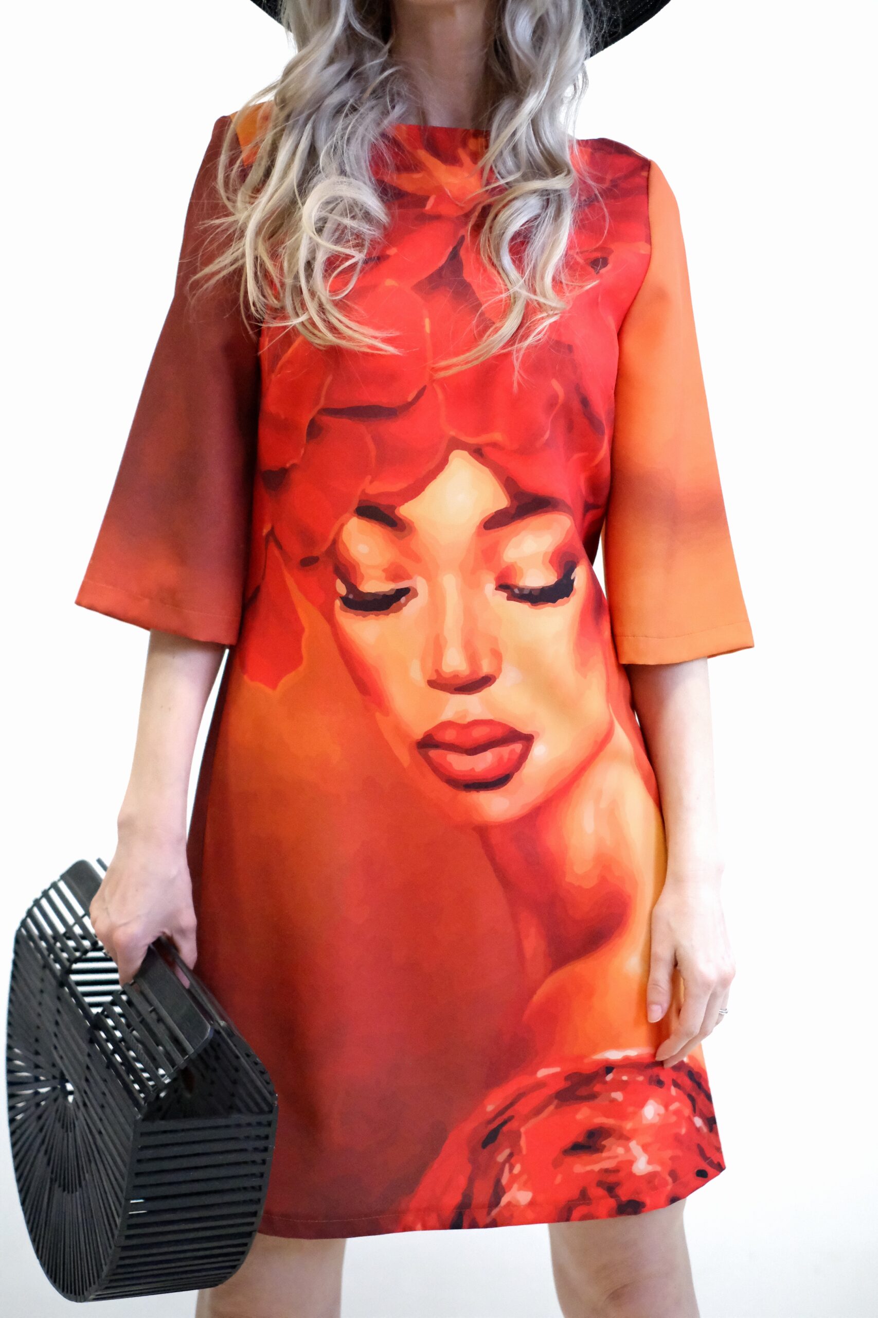 Dizajn plný energie a symboliky, kde je dominantným prvkom modelu je neprehliadnuteľná grafická potlač ženskej tváre, ktorej vlasy sú rafinovane vytvorené z pestrej zmesi púštnych kvetov. Celý vzor je ladený do hrejivých jesenných tónov – od sýtej oranžovej a červenej až po elegantnú okrovú. Táto farebná kombinácia dodáva šatám hĺbku, energiu a unikátny vizuálny charakter.