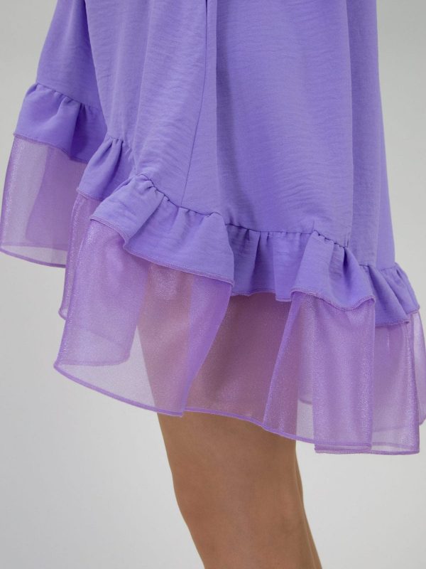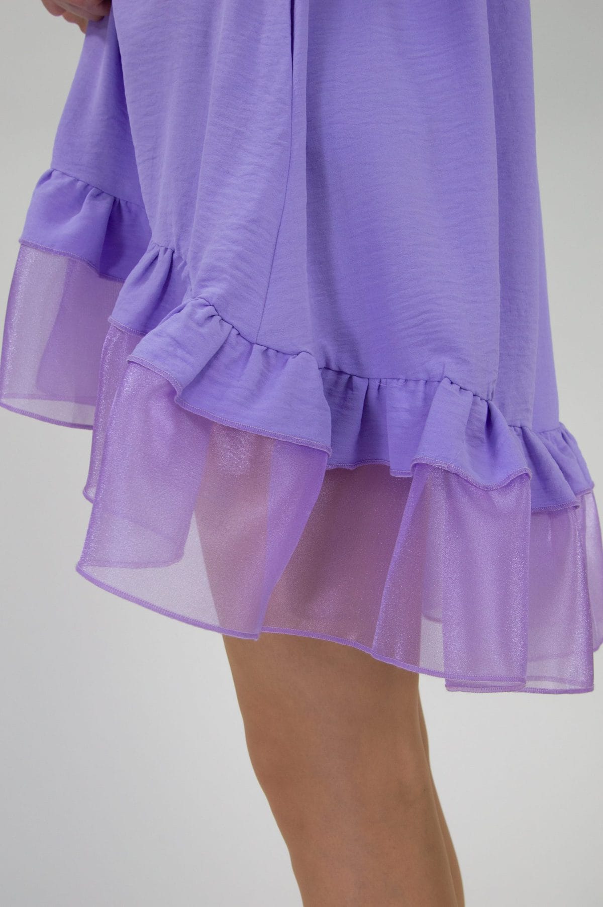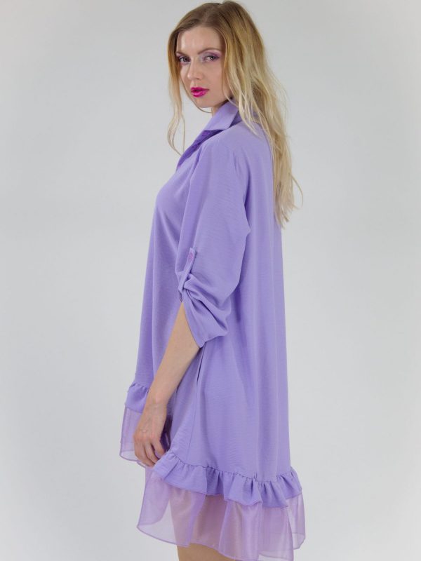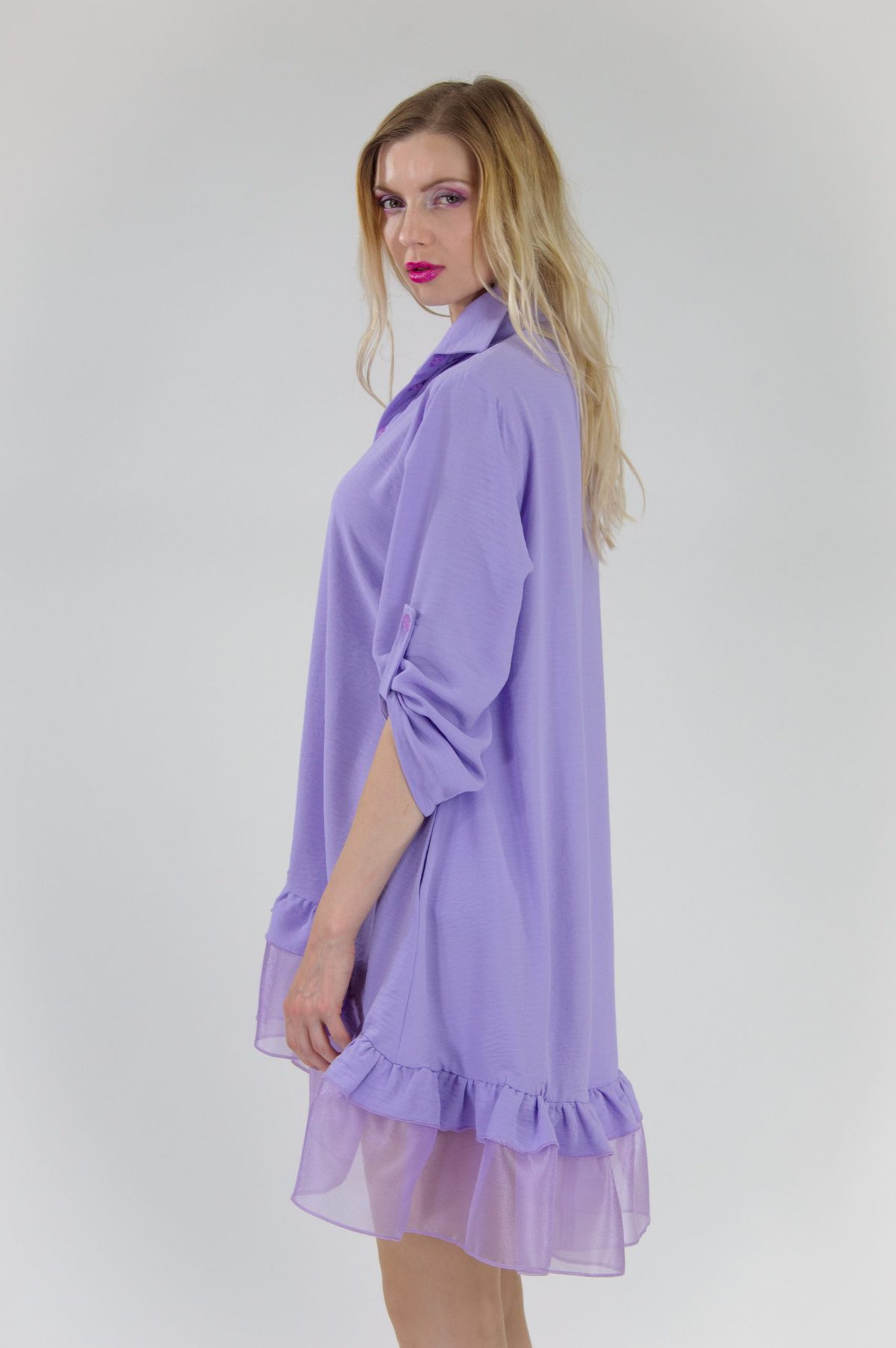 Predlžená oversize košeľa zriasená na leme šifónom v rovnakom odtieni. Výborná kombinácia k legínám alebo šortkám, poprípade úzkym nohaviciam. Košeľa má výrazný áčkový strih a sadne skvele na každú postavu. V jemnej pastelovo fialovej farbe je ako stvorená na letné horúce dni.