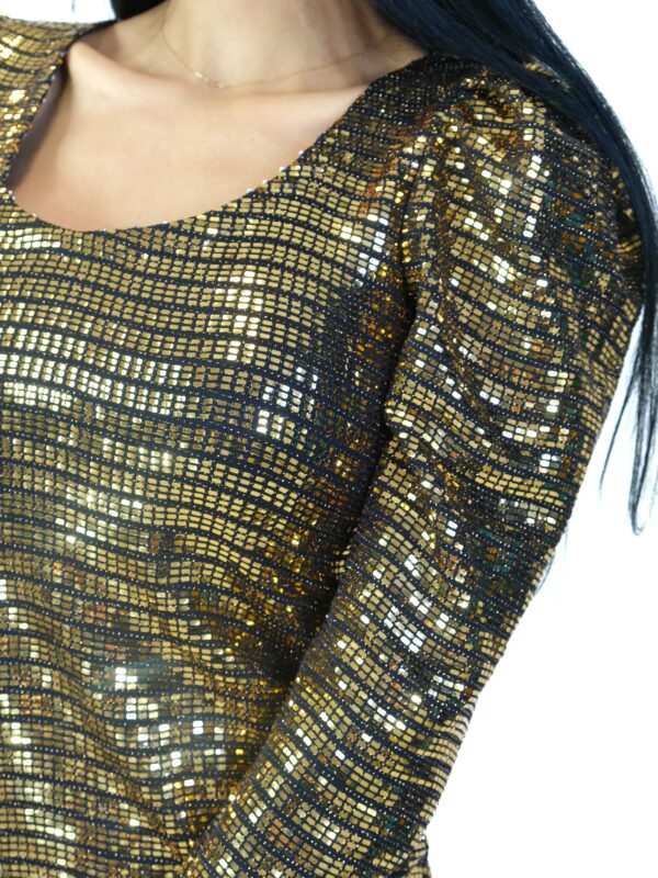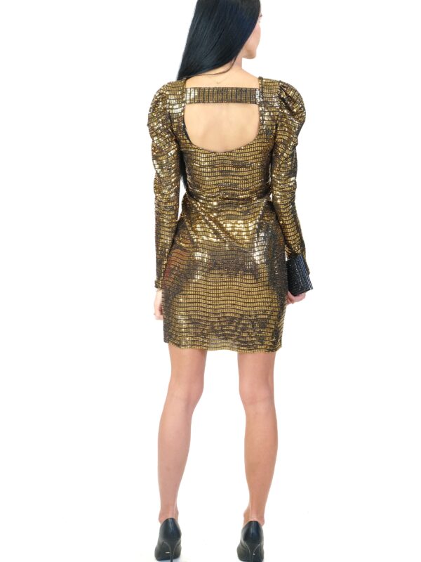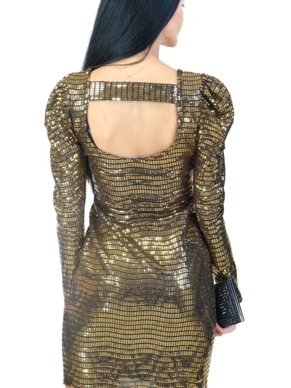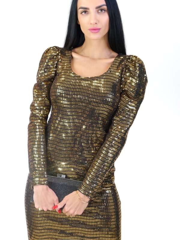 Šaty sú navrhnuté z výrazného zlatistého materiálu v puzdrovom strihu, ktorý sa prispôsobí postave. Šaty sú ako stvorené na rôzne oslavy a večierky vďaka elastickému materiálu sa prispôsobia Vašej postave. Zaujímavým detailom je riešenie chrbta, ktorý je pekne odhalený. Šaty môžete skombinovať so zlatými alebo čiernymi doplnkami a môžete sa stať doslova hviezdou večera, keďže sa šaty na svetle krásne lesknú.