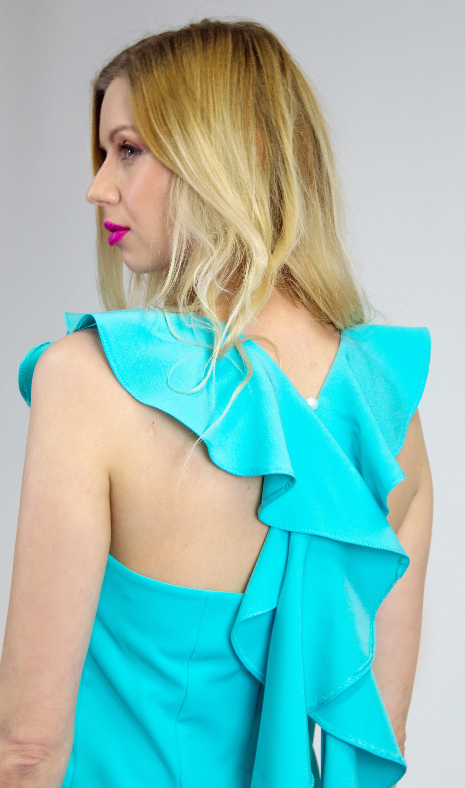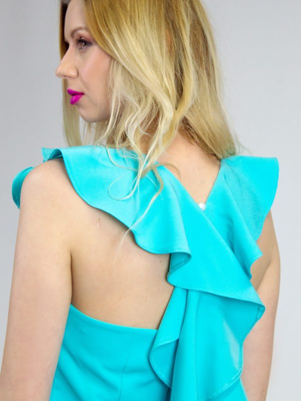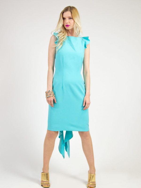 Svieže letné šaty na oslavu v krásnej tyrkysovej farbe. Šaty sú puzdrového jednoduchého strihu, čo ich robí výnimočnými je predlžený volán na zadnej chrbtovej časti, ktorý robí zo šiat chic voľbu na oslavy.