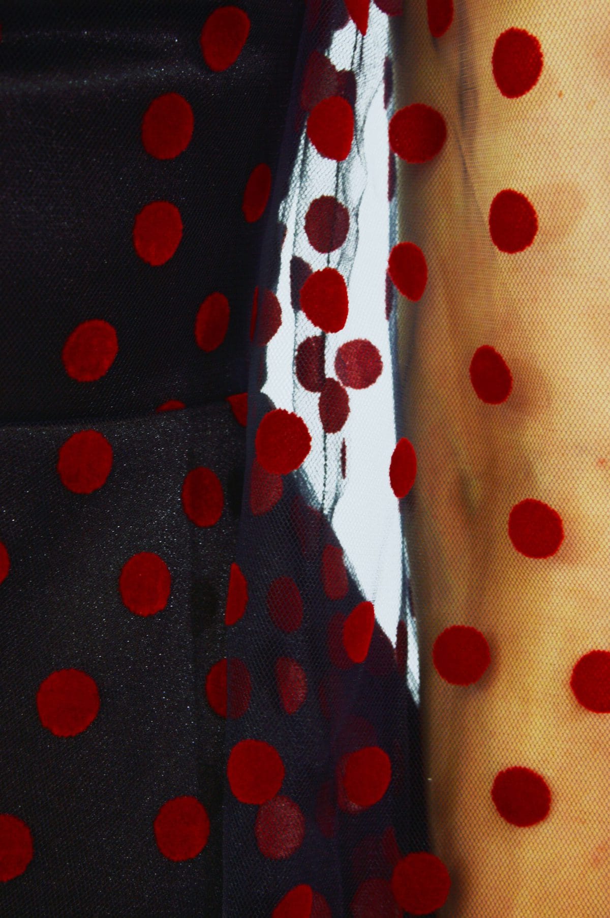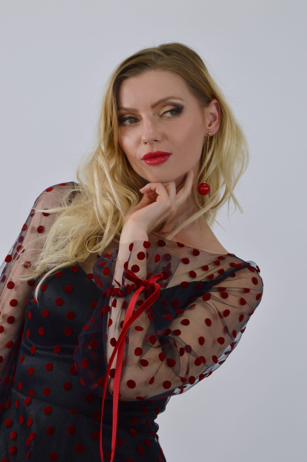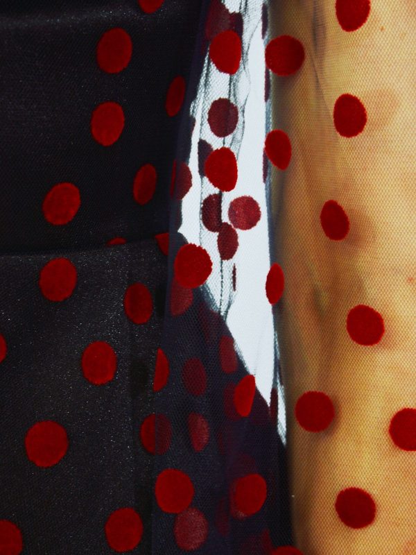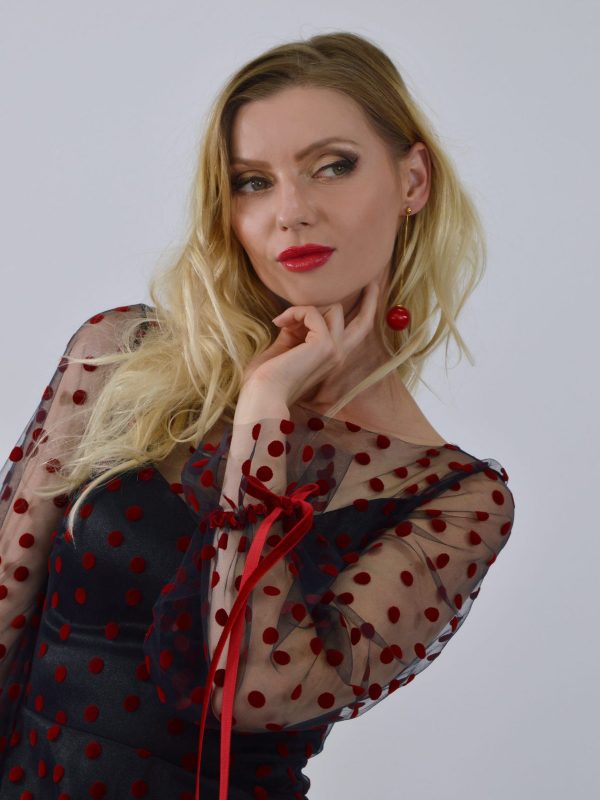 Dvojdielne z nepriesvitného čierneho týlu a bodkového šifónu. Nesmrteľná bodka sa vracia späť tentokrát v červenom prevedení na čiernom podklade. Šaty sú prestrihnuté v pase s áčkovou suknicou a bohémskymi rukávmi ukončenými mašličkami. Šaty môžu slúžiť ako malé spoločenské , ale aj do práce.