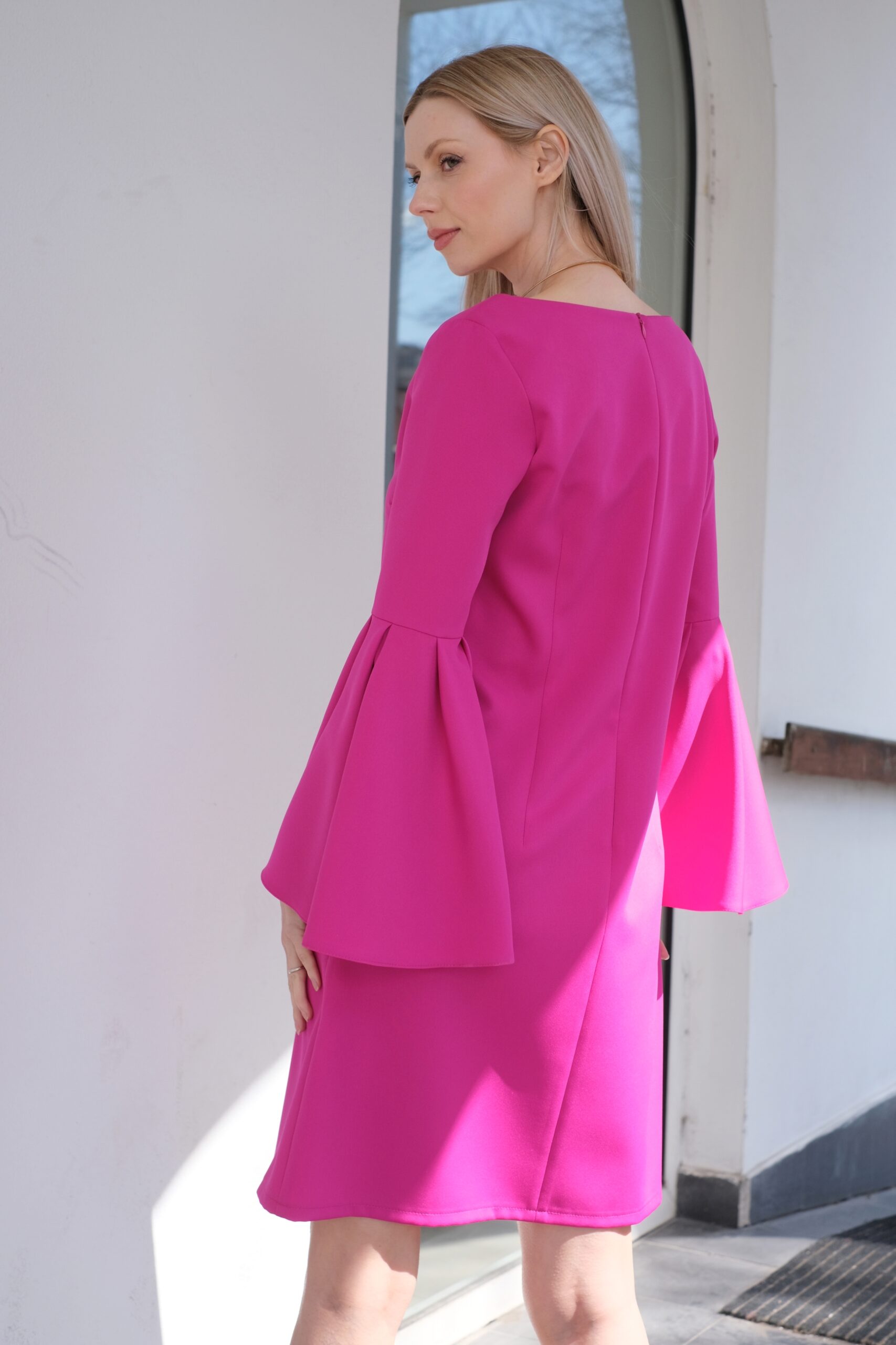 Tieto elegantné koktailové šaty v sýtej fuchsiovaj farbe (odtieň Magenta) sú dokonalým kúskom pre ženu, ktorá hľadá rovnováhu medzi klasickou ženskosťou a modernými detailmi.