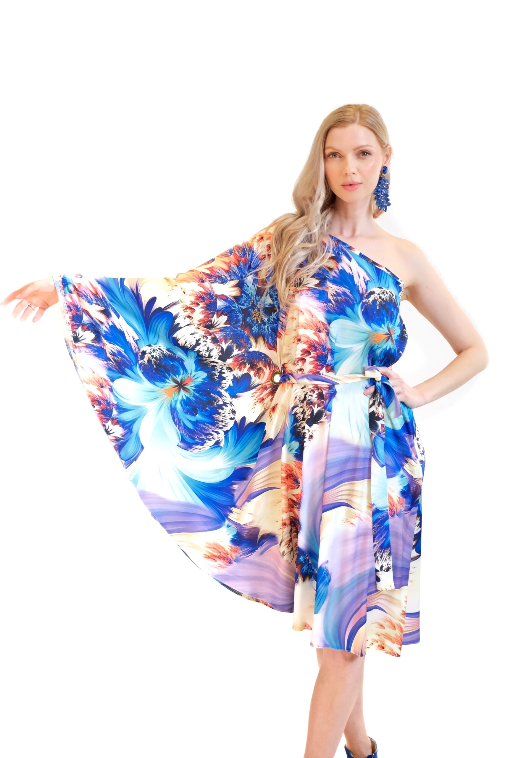 Tieto elegantné asymetrické midi šaty sú stelesnením originality a letnej noblesy. Model na prvý pohľad zaujme svojím odvážnym strihom na jedno rameno, ktorý na protilehlej strane plynule prechádza do dominantného, širokého „motýlieho“ rukáva. Tento rafinovaný prvok dodáva šatám pri každom pohybe fascinujúcu dynamiku a luxusný, priam éterický charakter.