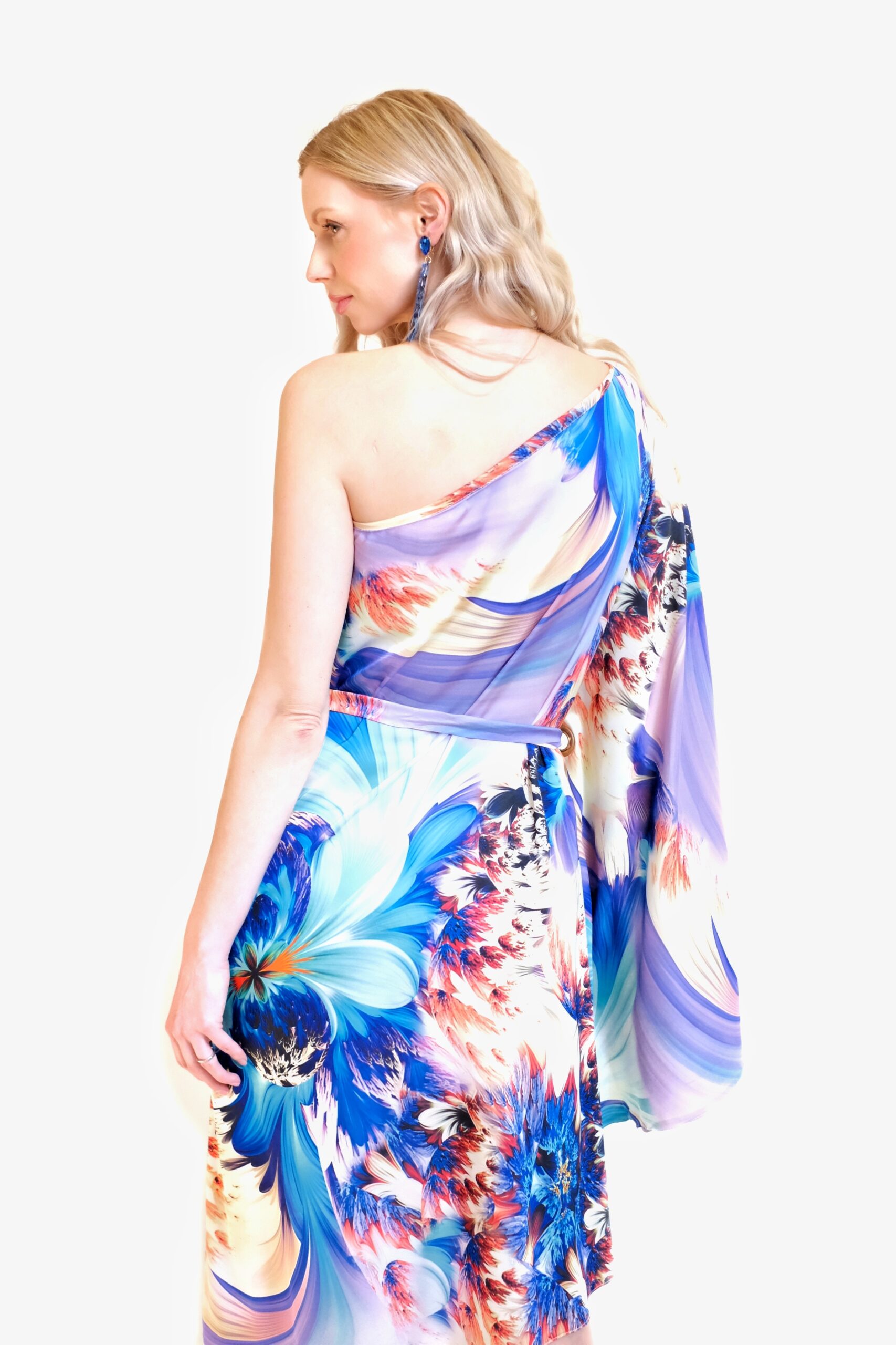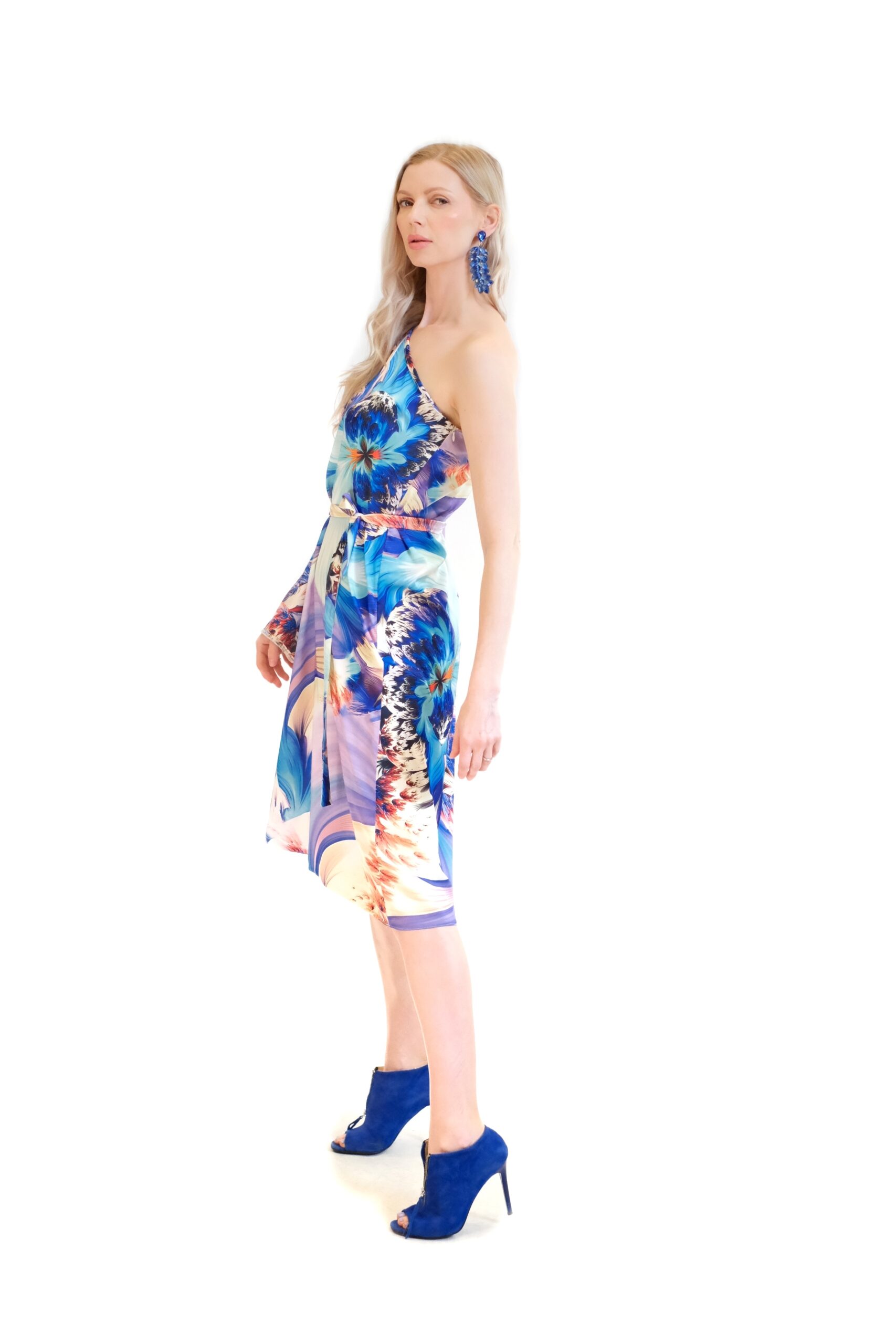 Dizajnu dominuje umelecká kvetinová potlač s abstraktnými prvkami, v ktorej sa snúbia sýte odtiene kráľovskej modrej a tyrkysovej s energickou oranžovou na svetlom podklade. Pre dokonalé vytvarovanie postavy sú šaty doplnené o odnímateľný opasok z totožného materiálu, ktorý efektne zvýrazňuje pás a vytvára ženskú siluetu presýpacích hodín.