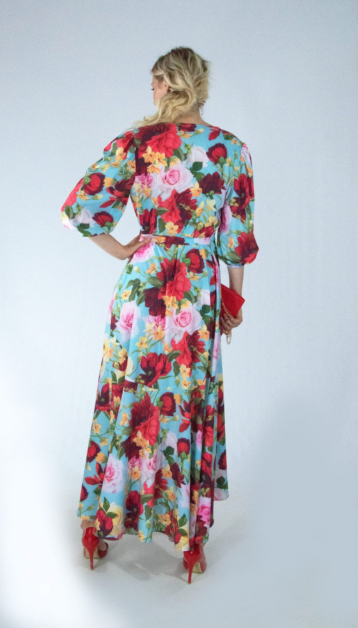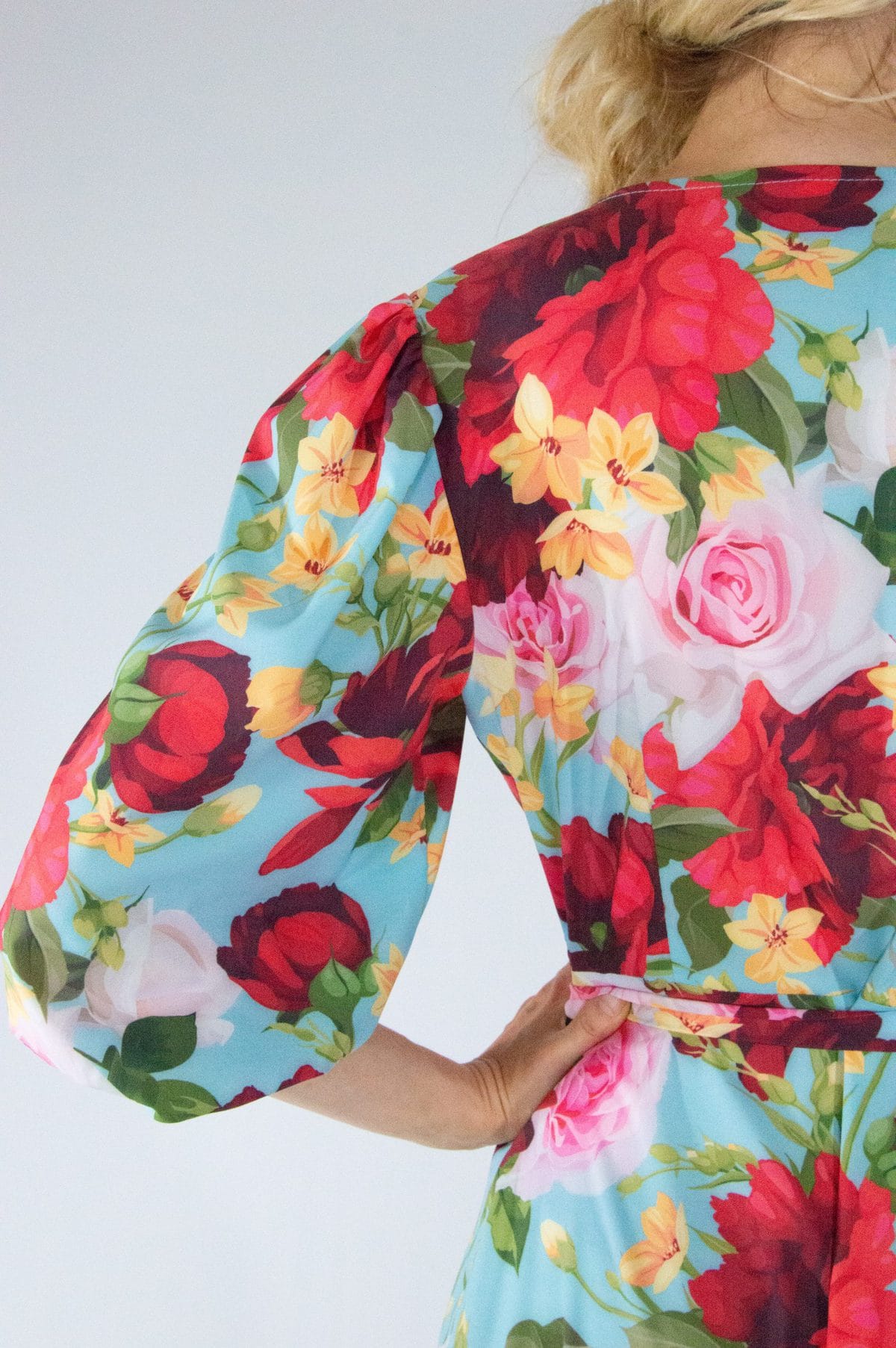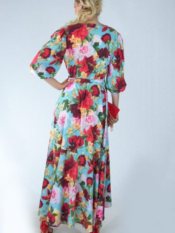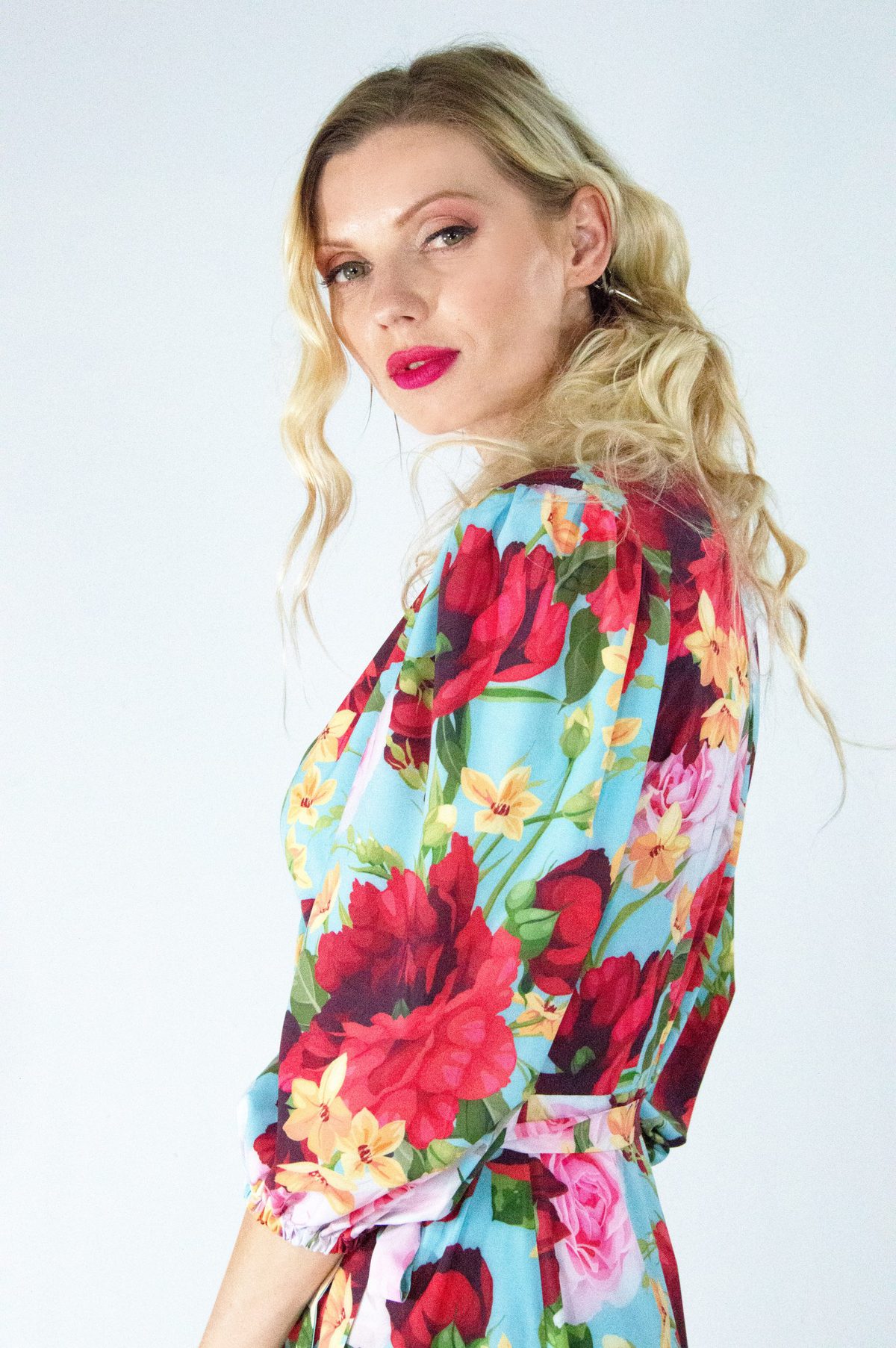 Šaty s výrazným kvetinovým vzorom sú ušité v pohodlnom zvinovacom strihu, ktorý skvele sedí na každej postave. Šaty majú bohémsky nariasené rukávy stiahnuté gumičkou. Odporúčame jednoduché doplnky vo farbe jedných z kvetov na šatách poprípade, v nebesky modrej farbe ako je podklad.