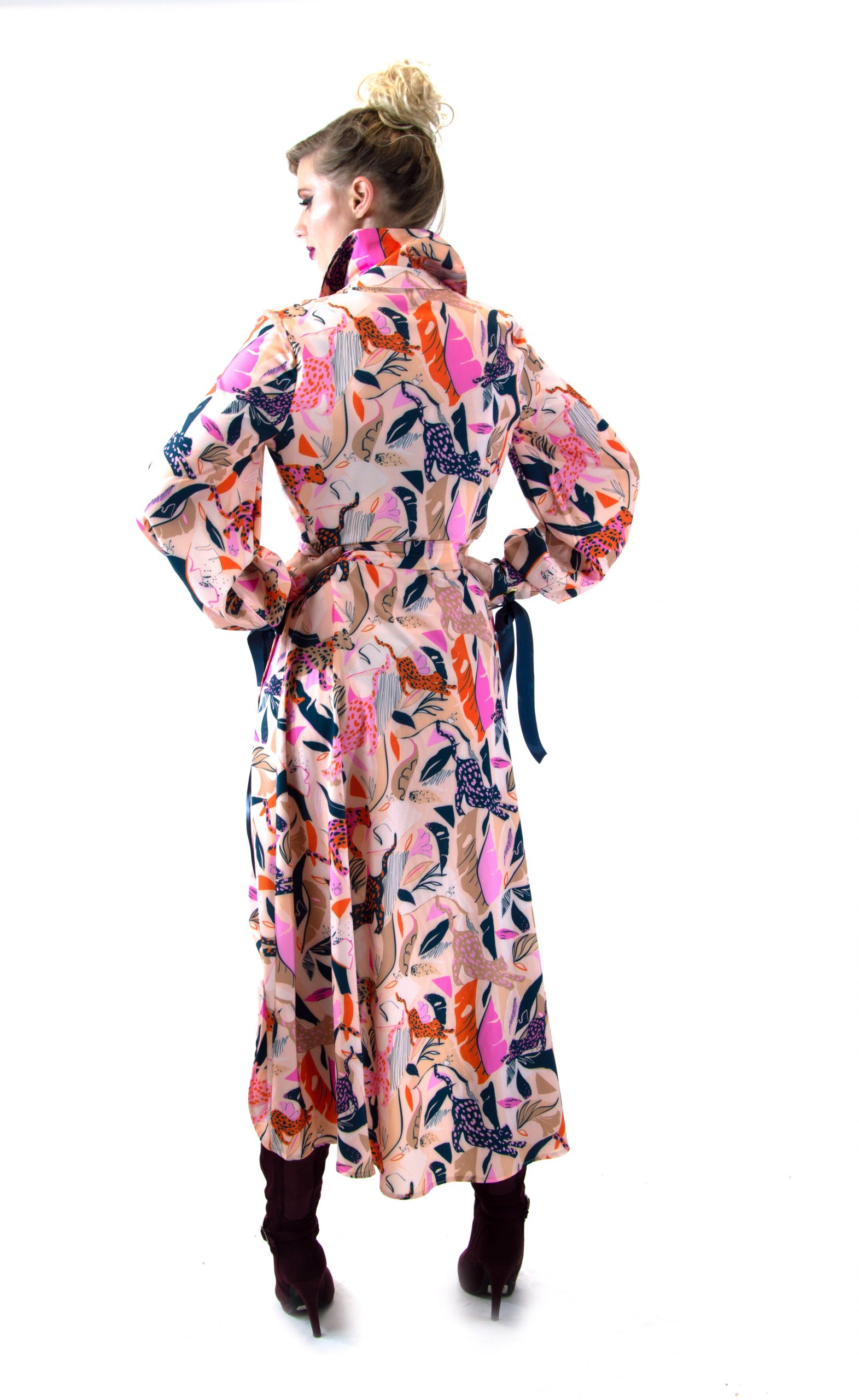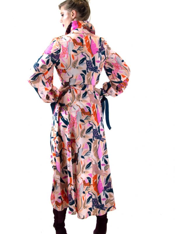 Šaty v obľúbenom košeľovom strihu. Šaty majú asymetricky strihanú suknicu, ktorá je vpredu kratšia. Šaty majú aj opasok z rovnakého materiálu. Vo výraznom vzore nádherných žeriavov na pastelovom podklade. Zaujímavým detailom je výrazná mašľa na rukávoch.