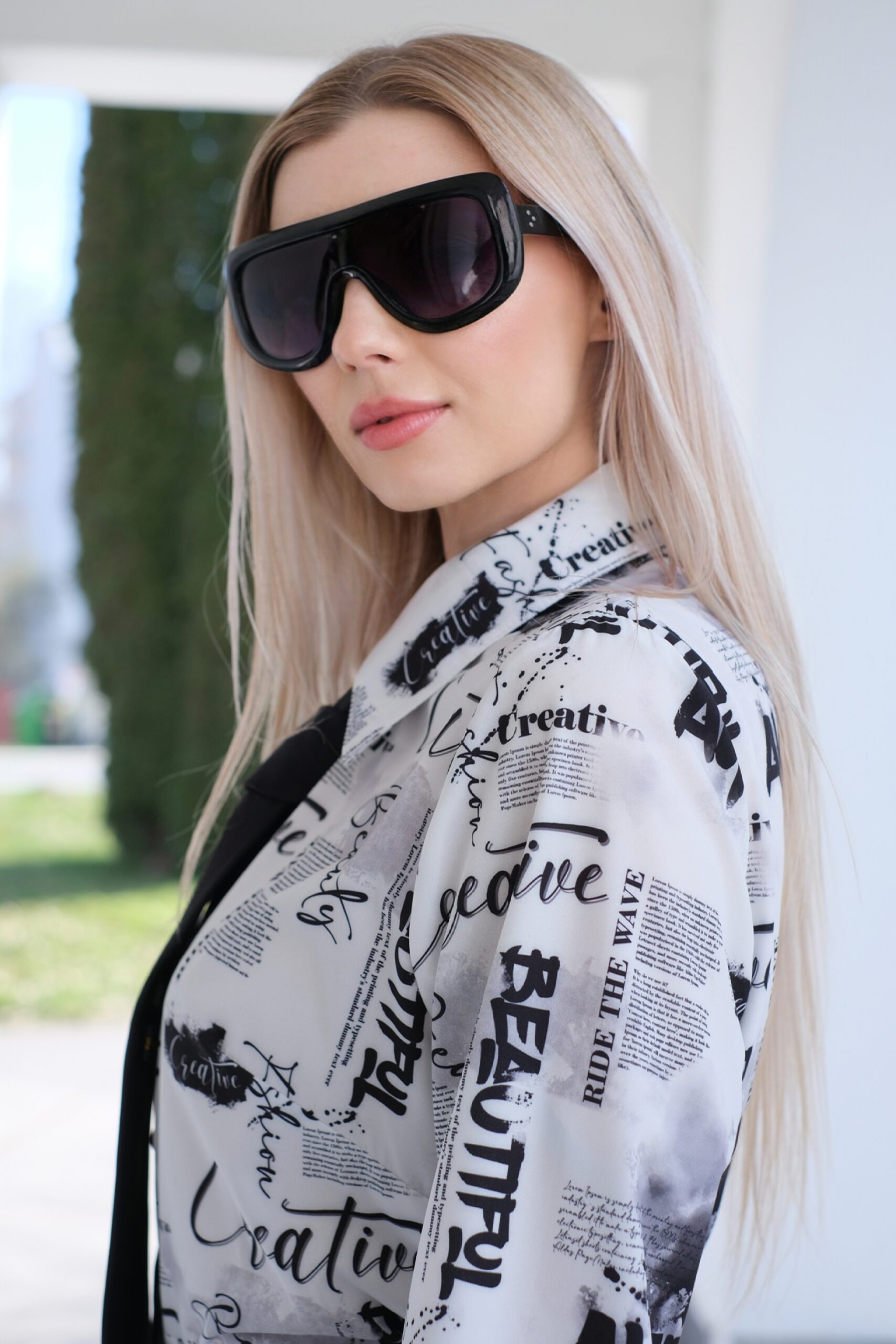Šaty sú navrhnuté v ženskom strihu s bohatou midi sukňou, ktorý sa vďaka ľahkému a splývavému materiálu krásne hýbe pri každom kroku. Originálna čiernobiela potlač s novinovým písmom a nápisom „Creative“ dodáva modelu umelecký a moderný charakter.
