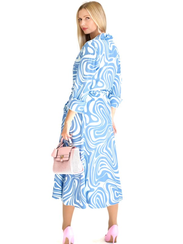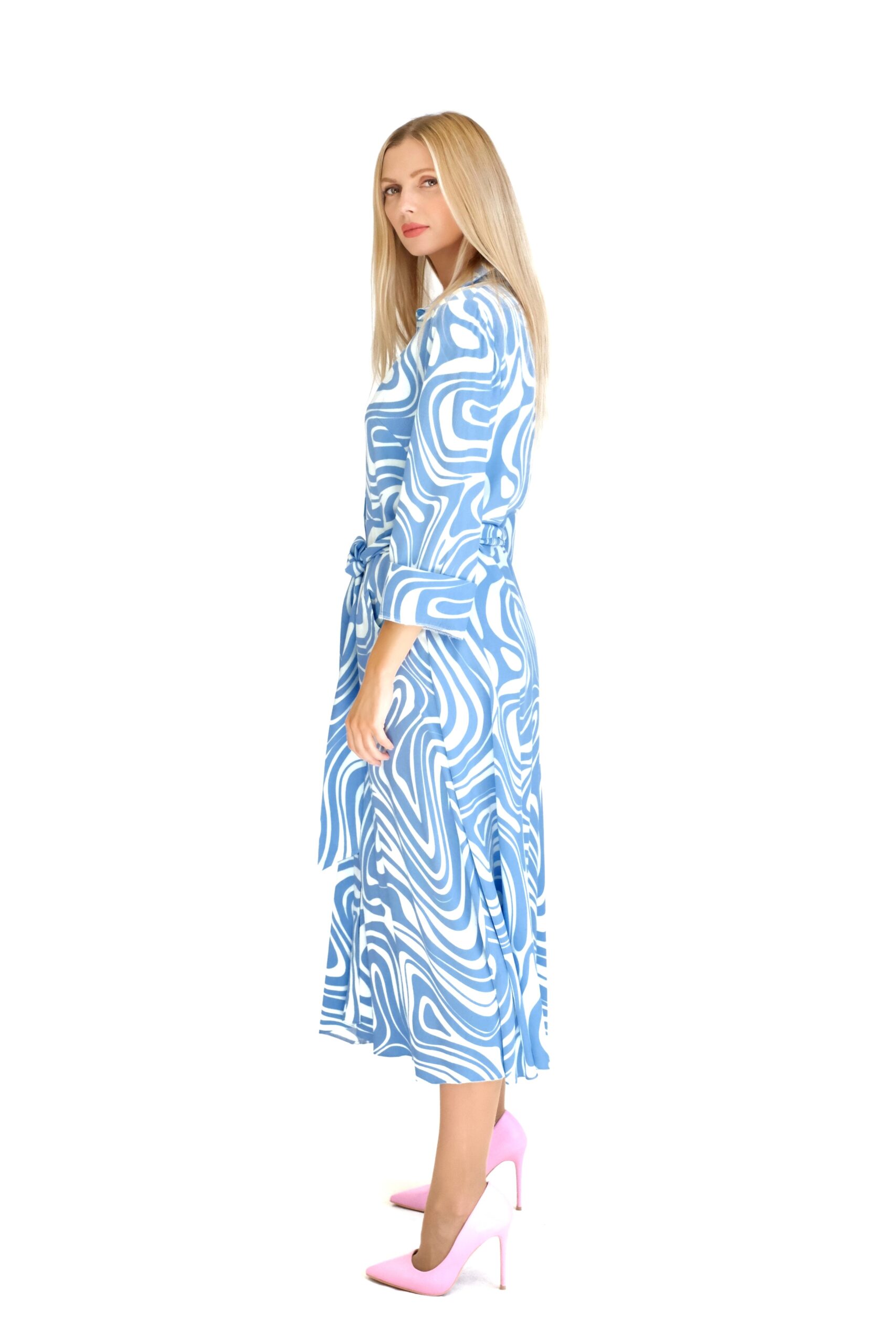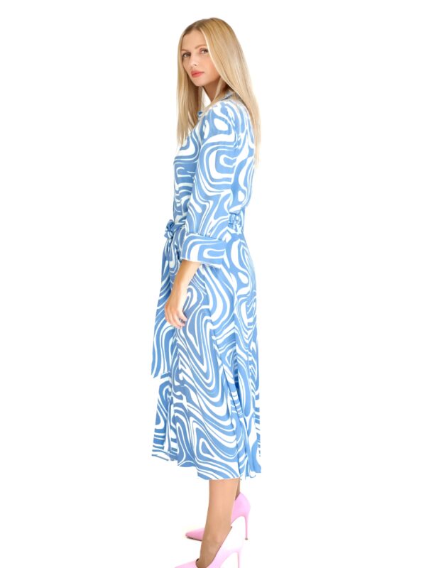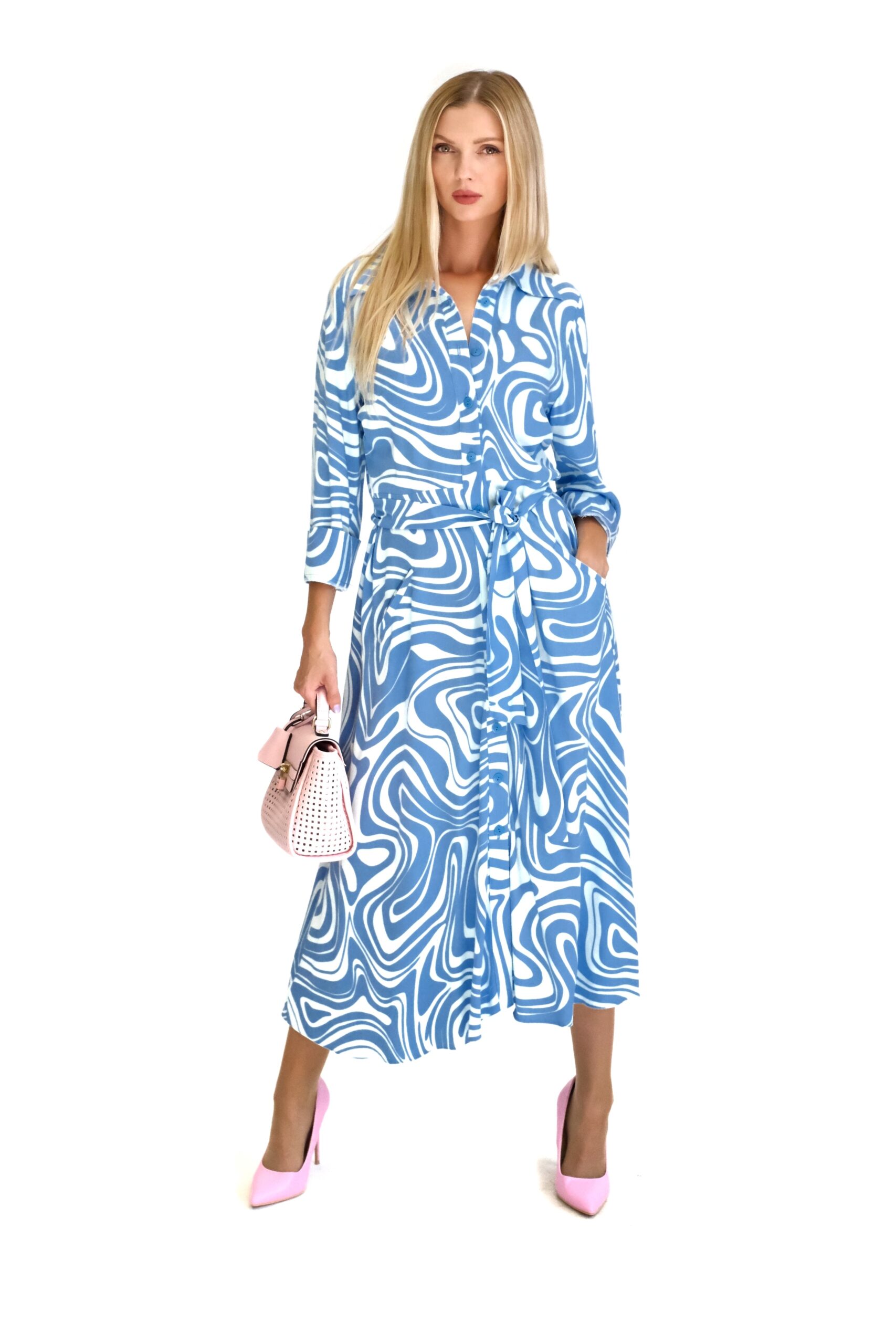 Šaty sú ušité v pohodlnom košeľovom strihu, ktorý výborne sadne na každý typ postavy. Šaty sú navrhnuté v midi dĺžke . Šaty majú asymetrický vzor kombinujúci svetlo modrú a bielu farbu. Šaty sú ušité s funkčnými vreckami a opaskom z rovnakého materiálu. Šaty sú navrhnuté z výborného materiálu, ktorý Vás chladí alebo zohreje podľa počasia. Výhodou košeľových šiat je, že sa dajú nosiť elegantne aj ležérne napríklad k bielym teniskám.