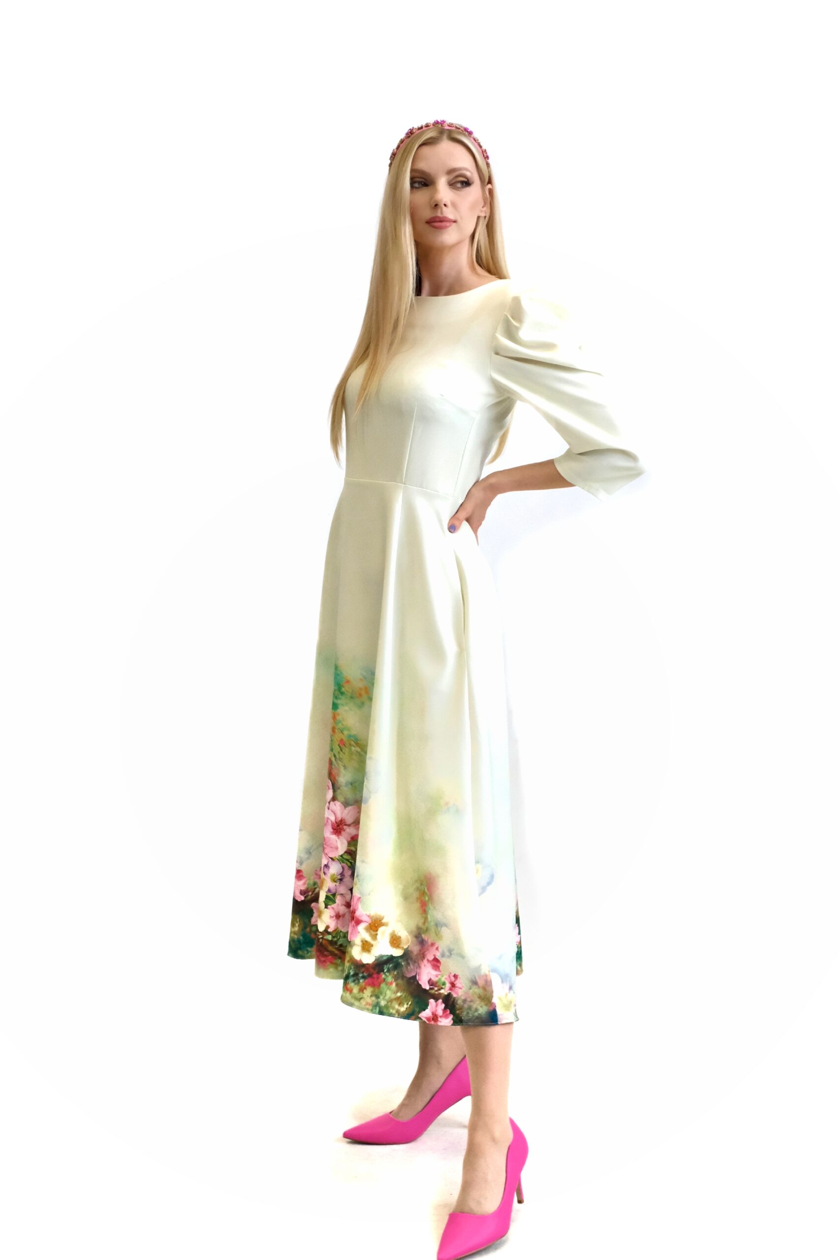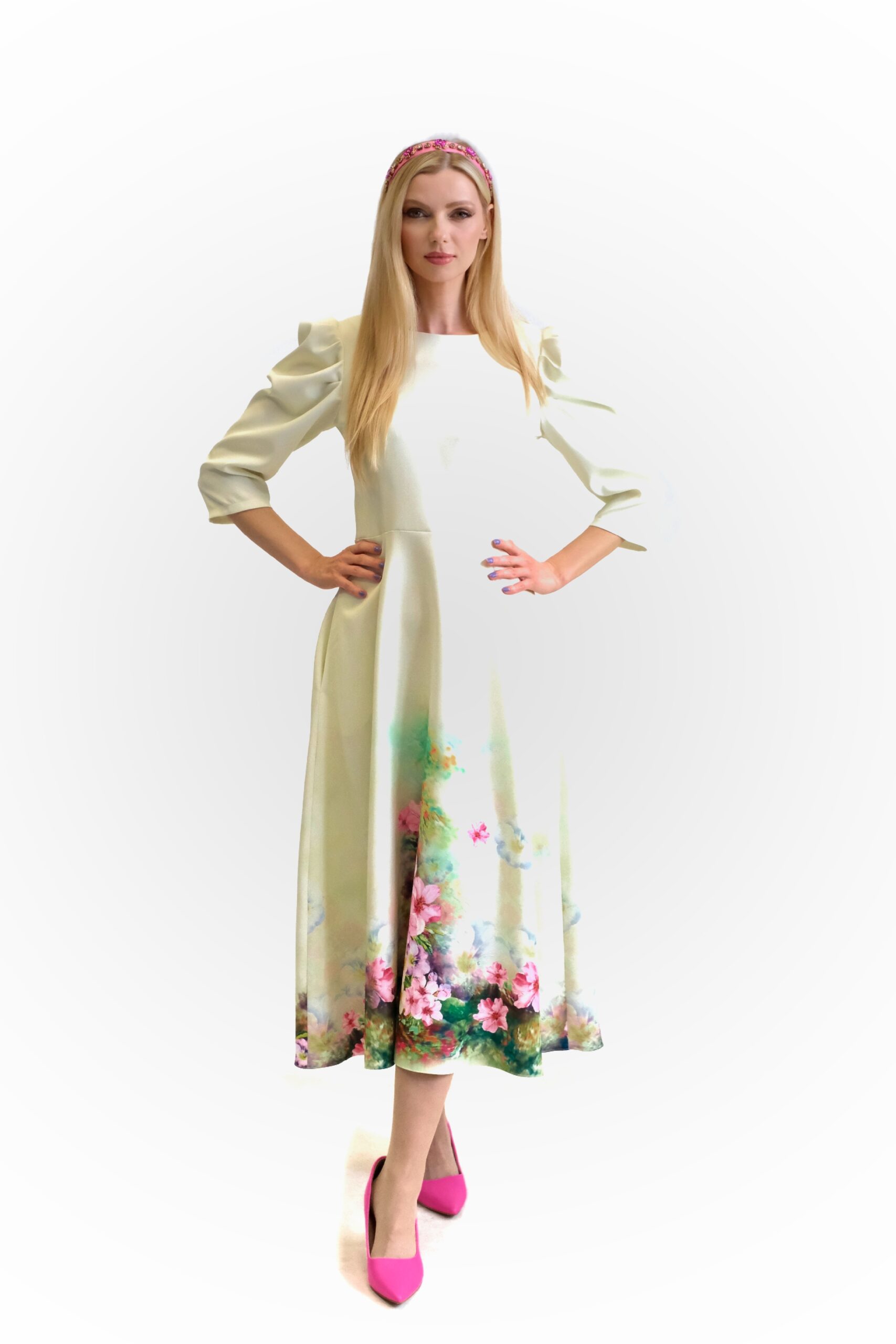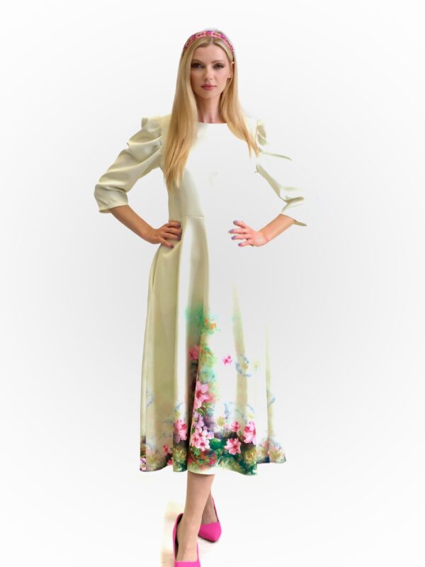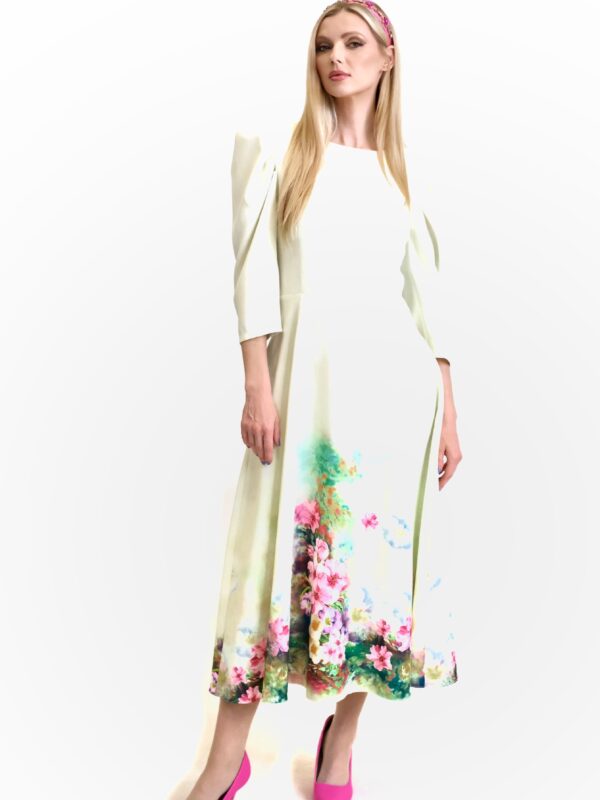 Šaty sú navrhnuté v prepracovanom midi strihu s dĺžkou do polovice lýtok. Šaty sú prestrihnuté v páse a sadnú na Vašu postavu , pričom áčková suknica im dodá na vzdušnosti. Šaty majú praktické vrecká. Najvýraznejším prvkom šiat je nadherný kvetinový vzor pripominajúci záhradu v rozkvite. Vzor je umiestnení na pastelovo zelenom podklade. Kombinujte s cyklamenovými doplnkami pre wau effekt ako naša stylistka.