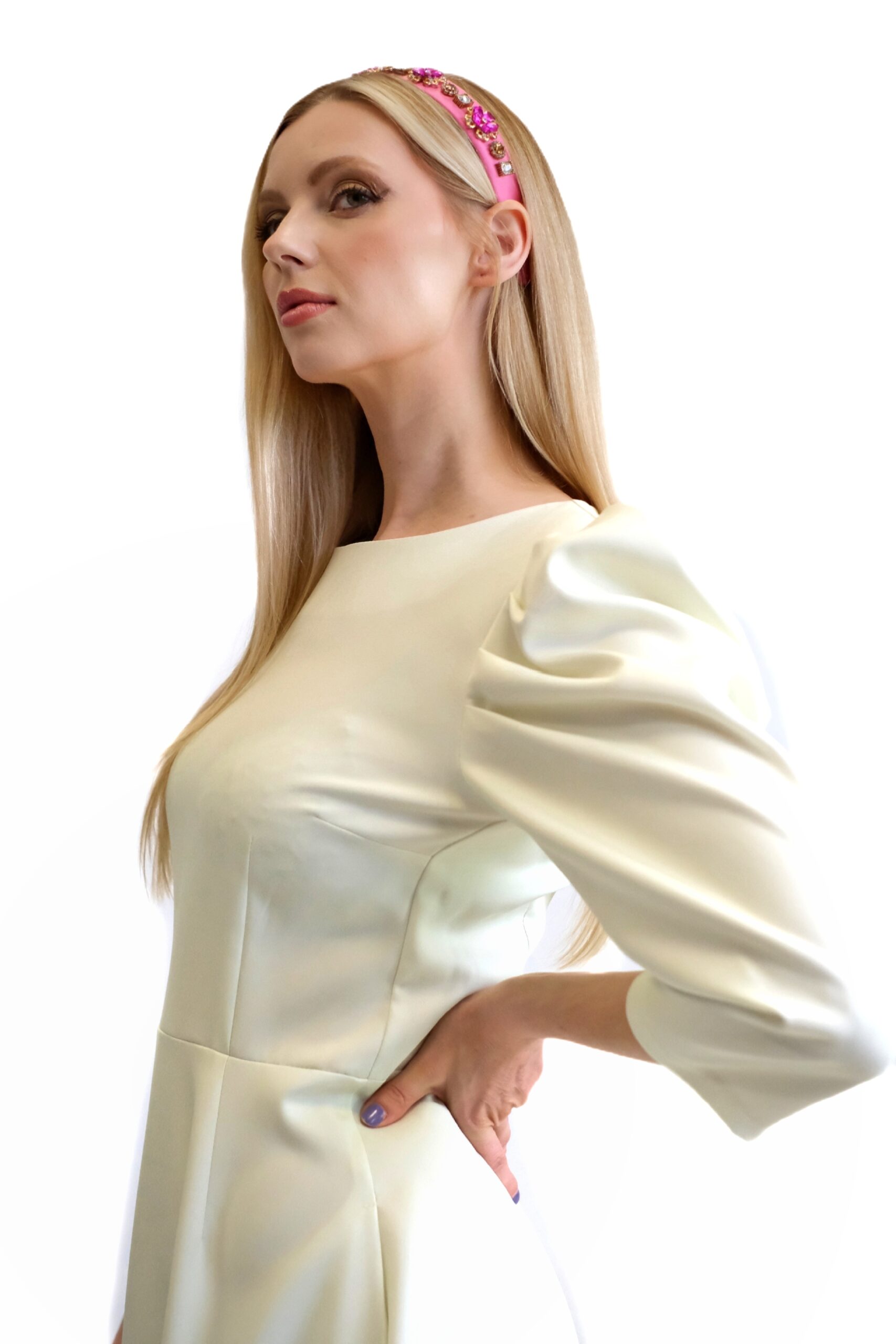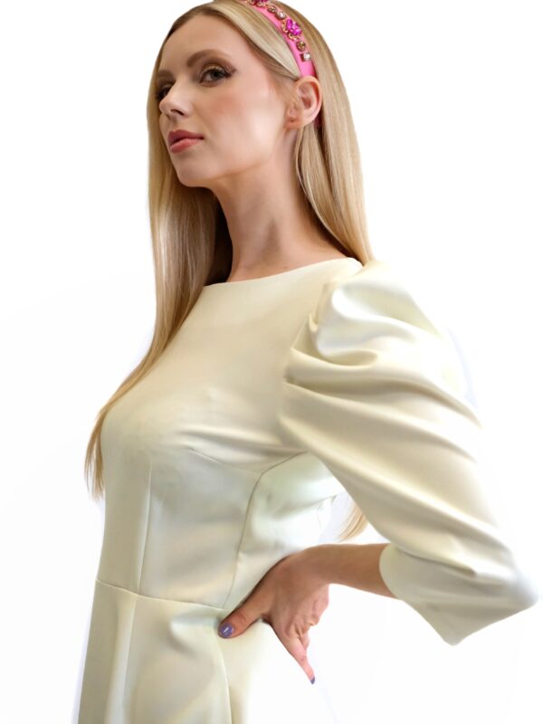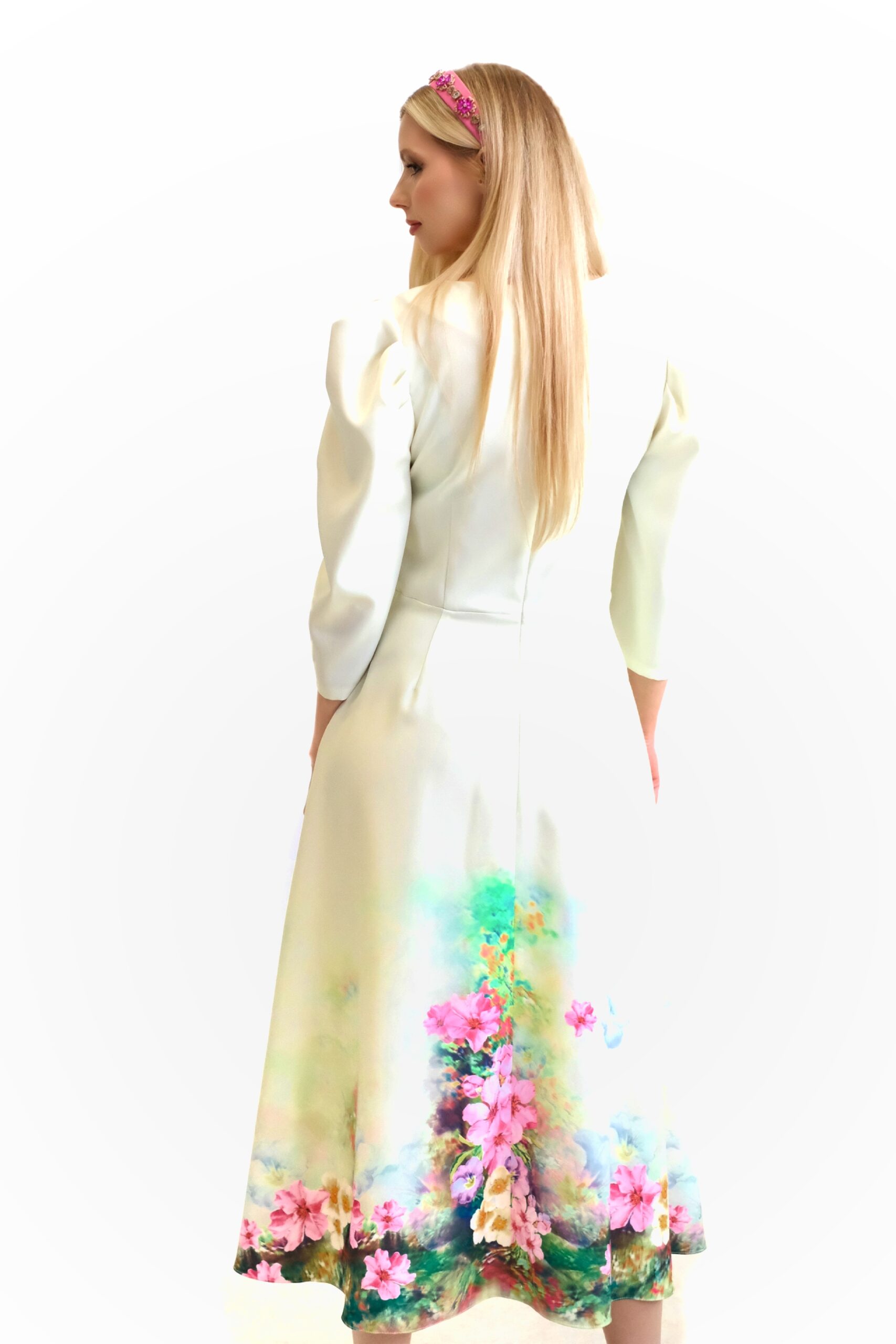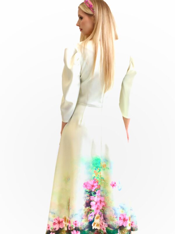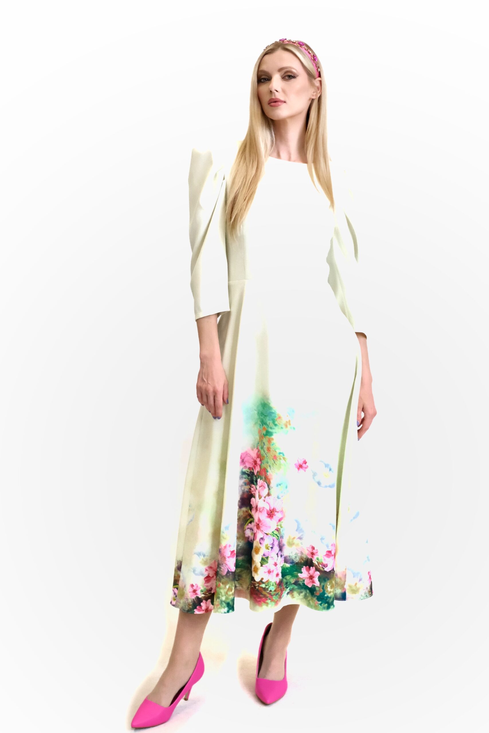 Šaty sú navrhnuté v prepracovanom midi strihu s dĺžkou do polovice lýtok. Šaty sú prestrihnuté v páse a sadnú na Vašu postavu , pričom áčková suknica im dodá na vzdušnosti. Šaty majú praktické vrecká. Najvýraznejším prvkom šiat je nadherný kvetinový vzor pripominajúci záhradu v rozkvite. Vzor je umiestnení na pastelovo zelenom podklade. Kombinujte s cyklamenovými doplnkami pre wau effekt ako naša stylistka.
