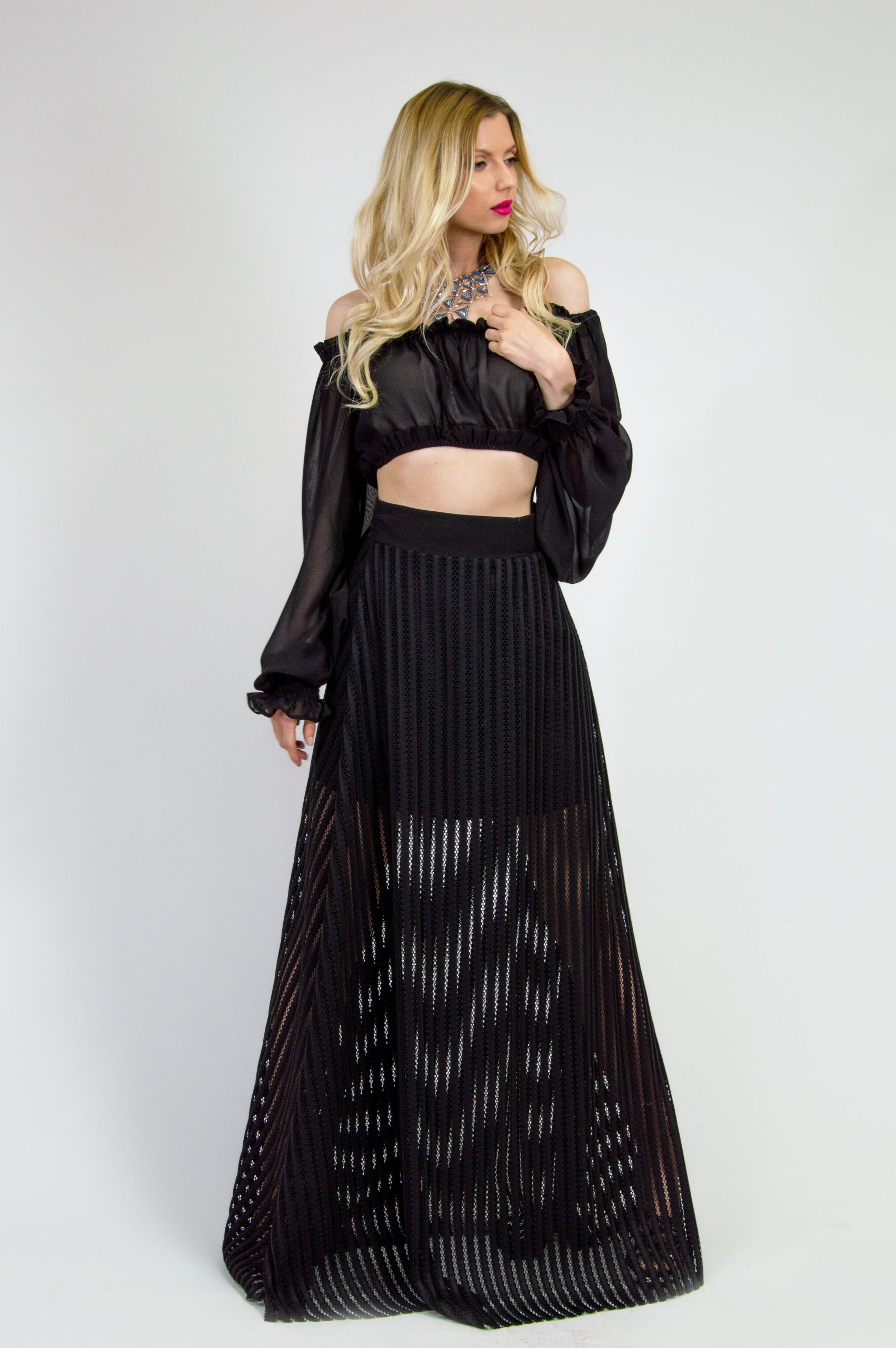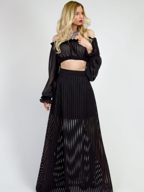 Sukňa rafinovaná vo svojej jednoduchosti je čierna, s vrchnou časťou podšitou nepriehľadným materiálom a spodná časť dá vyniknúť Vaším nohám v kombinácii s topom vhodná na každý typ spoločenskej udalosti. Sukňa je jednoduchého kruhového tvaru so zvýšeným pásom.
