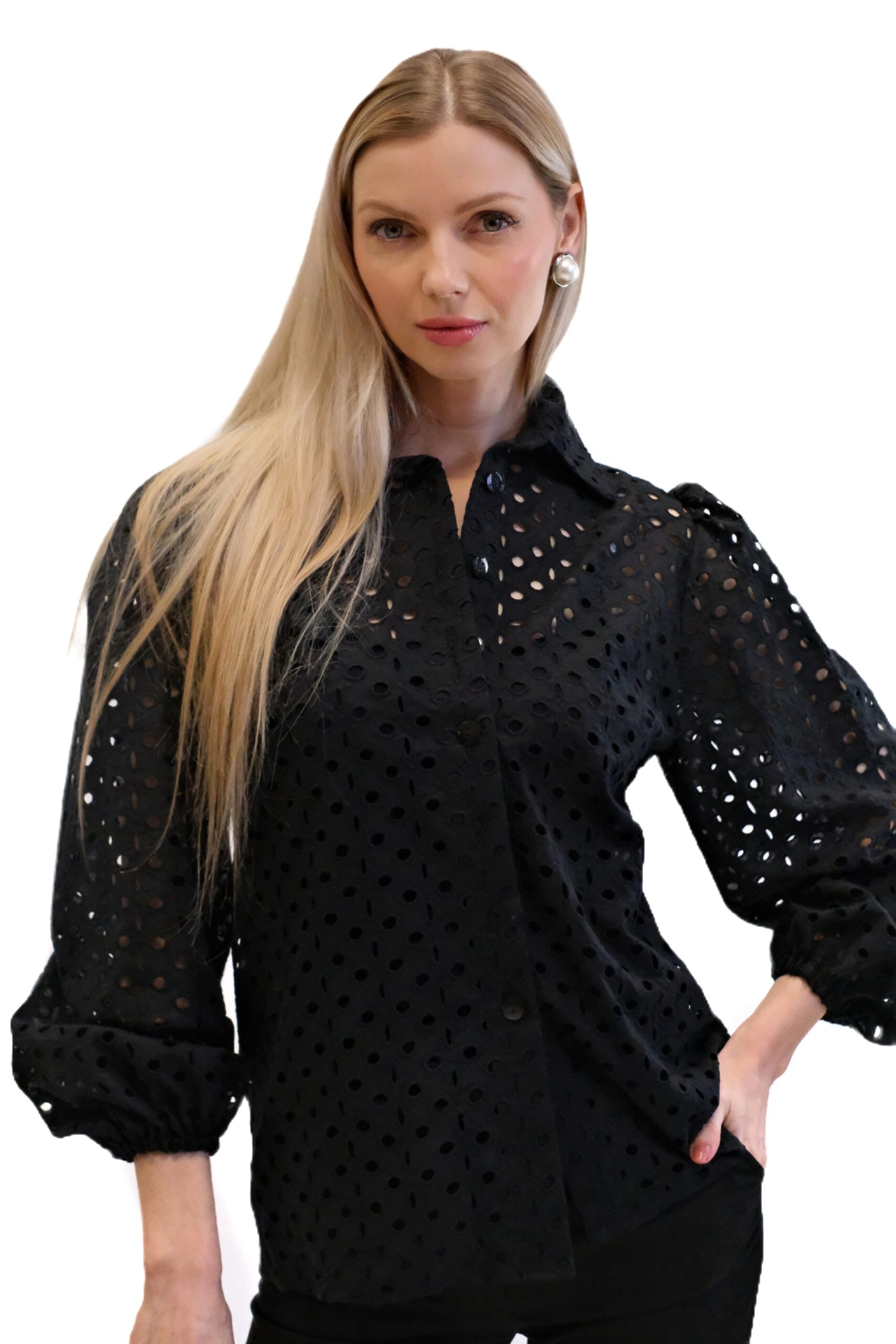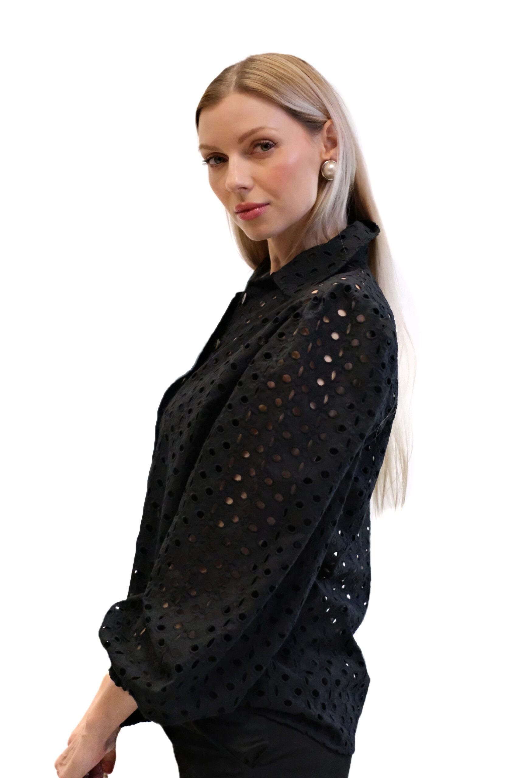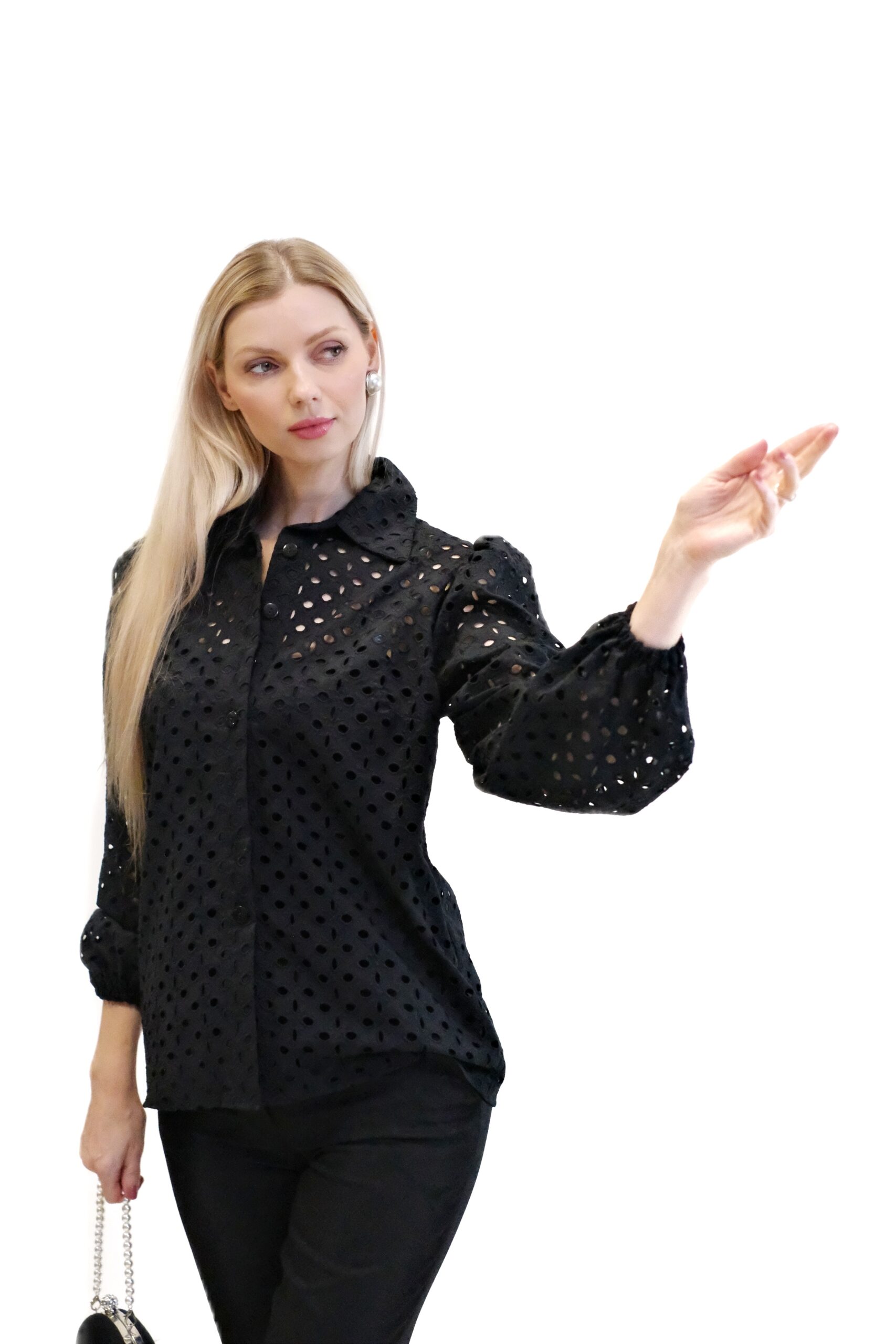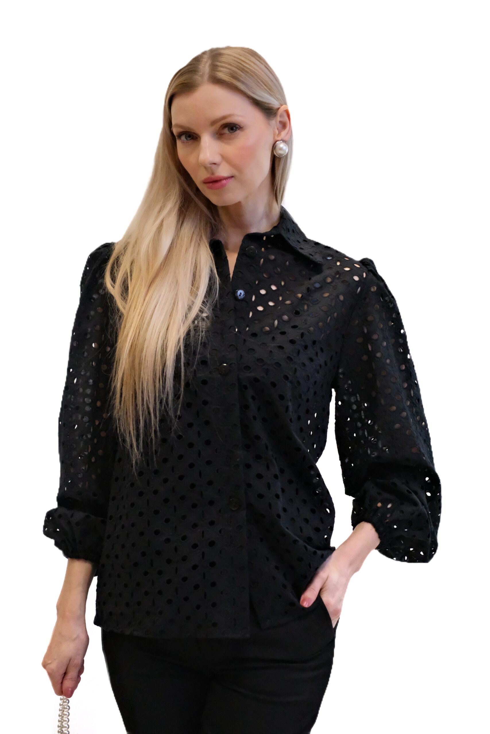 Čierna blúzka je elegantný a sofistikovaný kúsok so stojačikom a zapínaním na gombíky vpredu. Je vyrobená z bavlnenej látky s dierovaným vzorom , vďaka čomu je mierne priehľadná.