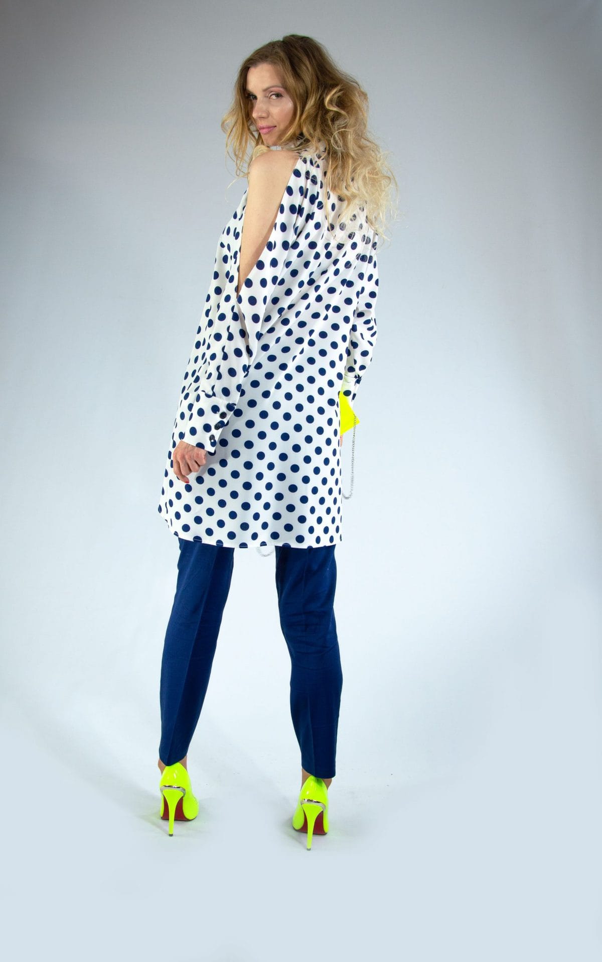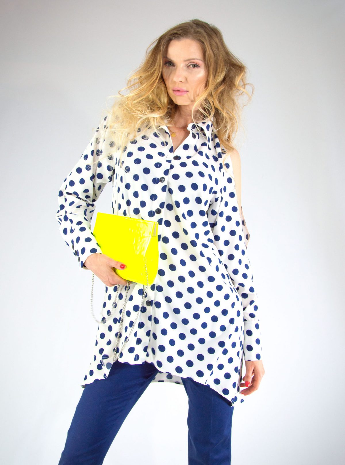 Blúzka ušitá z jemného a príjemného letného materiálu. Blúzka je ušitá vo voľnom strihu s asymetricky odhaleným jedným ramenom. Blúzka je ušitá v populárnom letnom bodkovom prevedení. Ľahko skombinujete s bielymi alebo červenými nohavicami.
