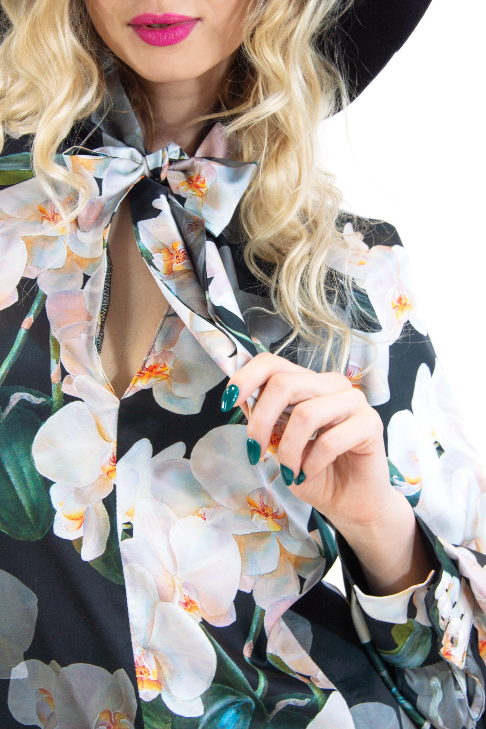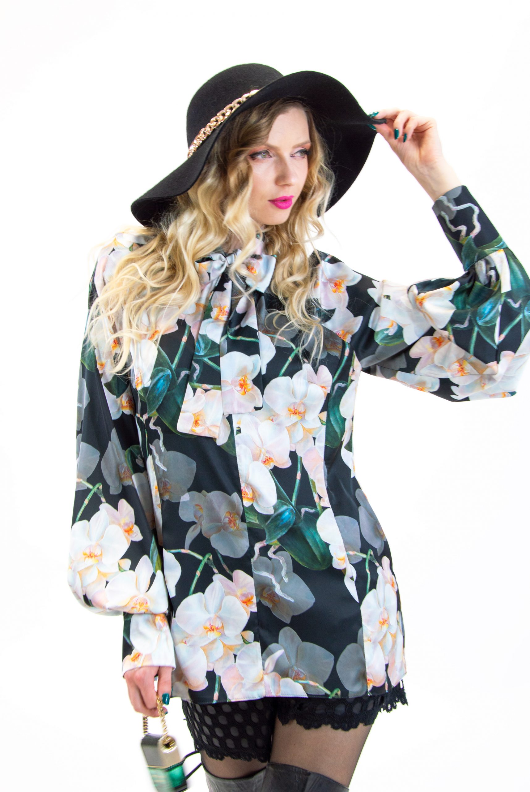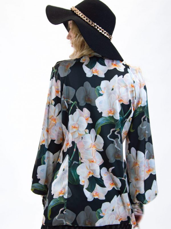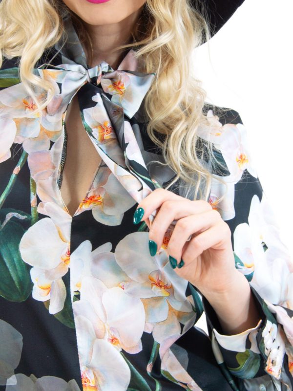 Tlmený vzor orchideí s dominujúcou smotanovou a čiernou je kúsok, ktorý sa dá nosiť celoročne, hlavne ak je ušitý z príjemného chladivého materiálu. Výrazným prvkom je široká mašľa na uviazanie okolo krku, ktorá dodáva košeli nádych romantizmu.