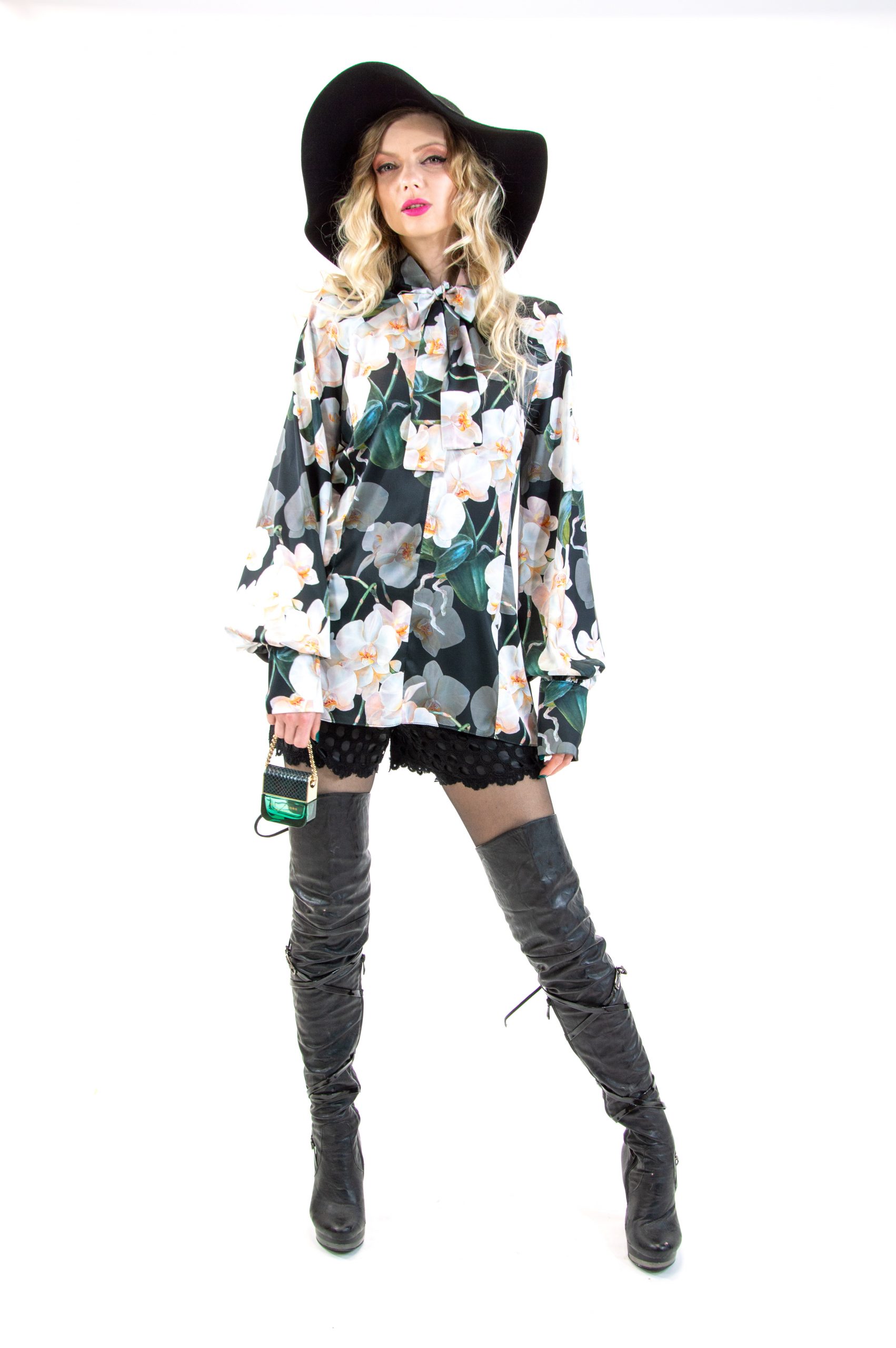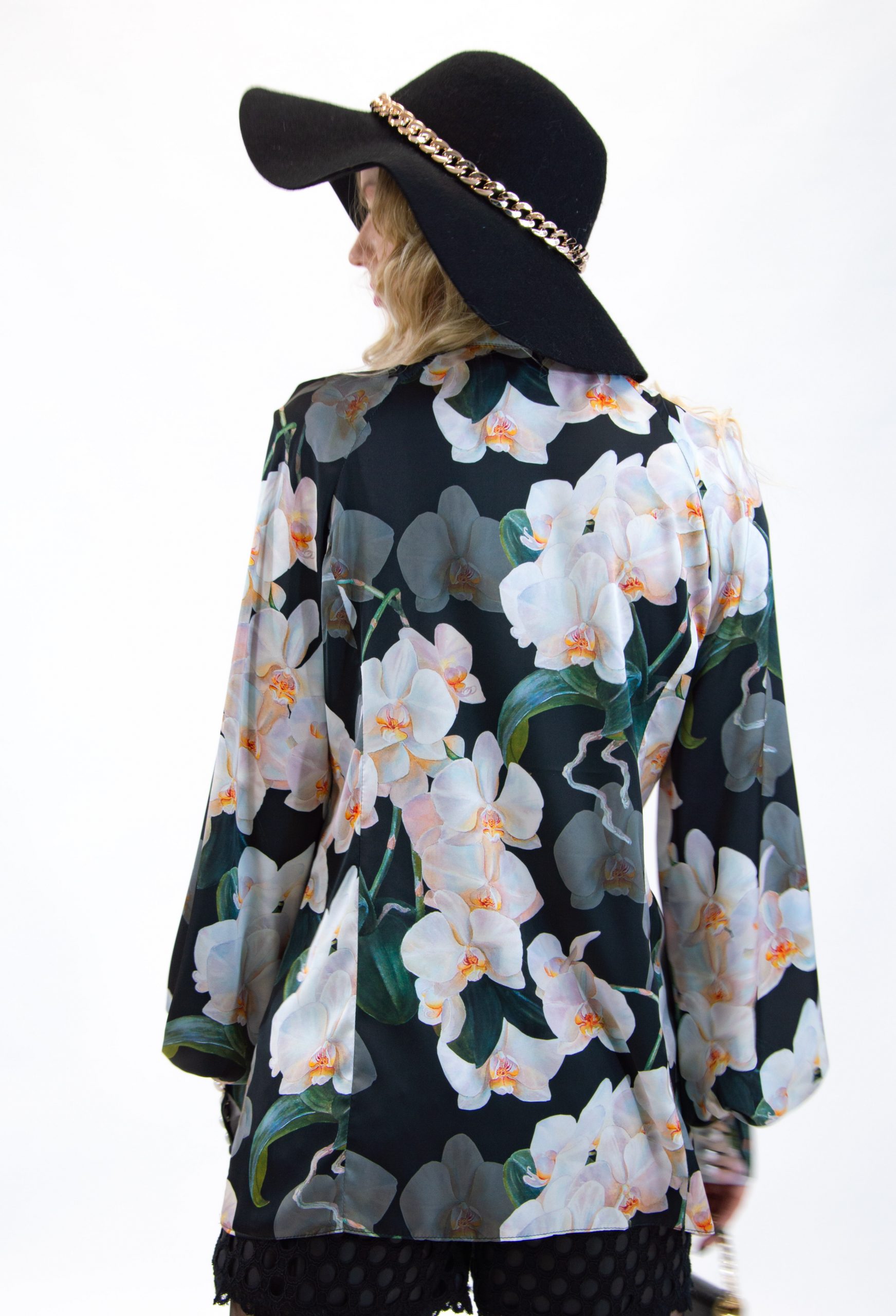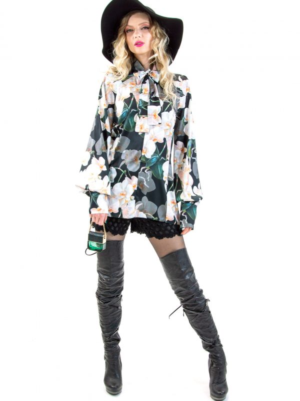 Tlmený vzor orchideí s dominujúcou smotanovou a čiernou je kúsok, ktorý sa dá nosiť celoročne, hlavne ak je ušitý z príjemného chladivého materiálu. Výrazným prvkom je široká mašľa na uviazanie okolo krku, ktorá dodáva košeli nádych romantizmu.