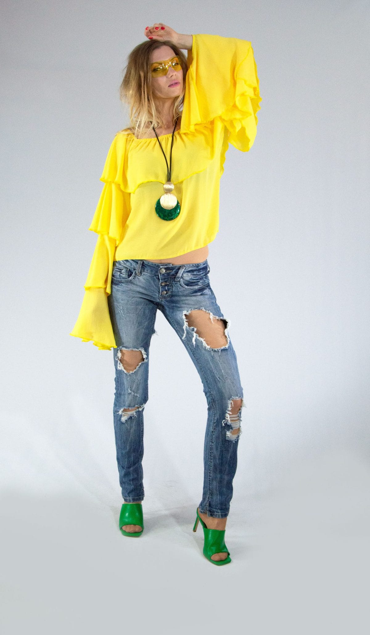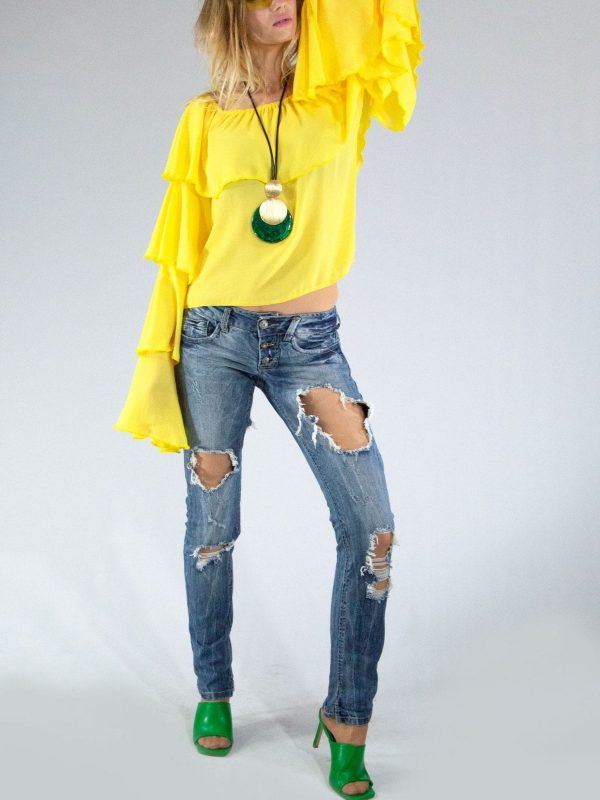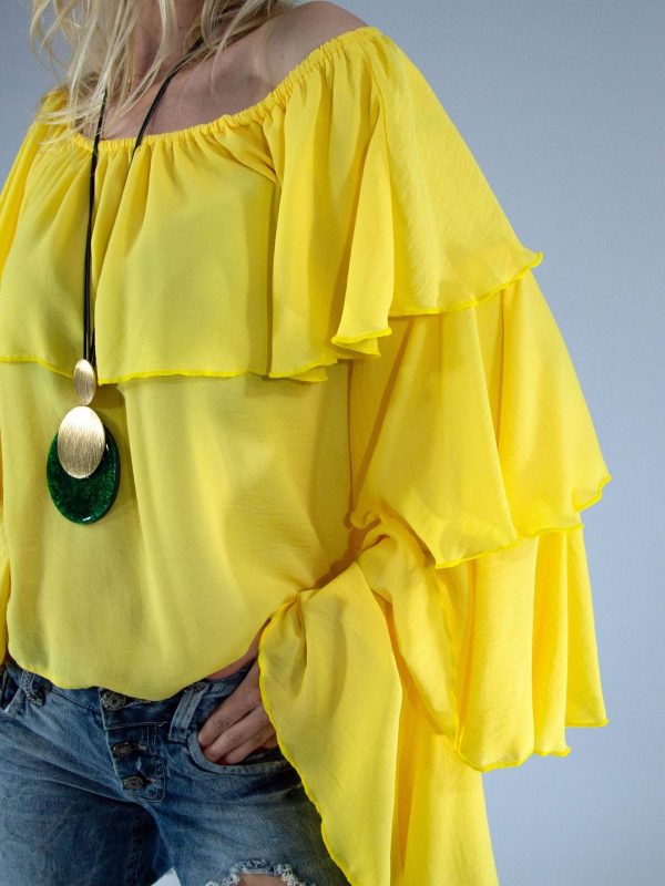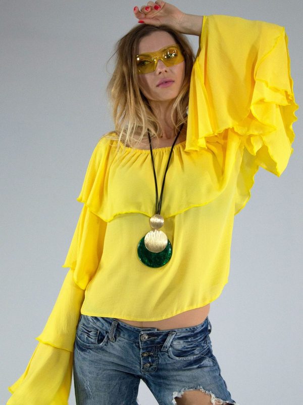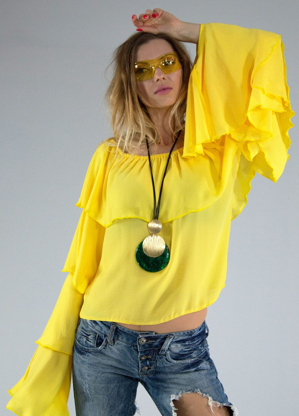 Veselá a romantická letná blúzka navrhnutá v slniečkovej žltej farbe. Blúzka je ušitá z naskladaných volánoch, čo jej dodáva romantický nádych sviežeho leta. Blúzku ľahko skombinujete k šortkám alebo nohaviciam a vytvoríte svieži a optimistický letný look.