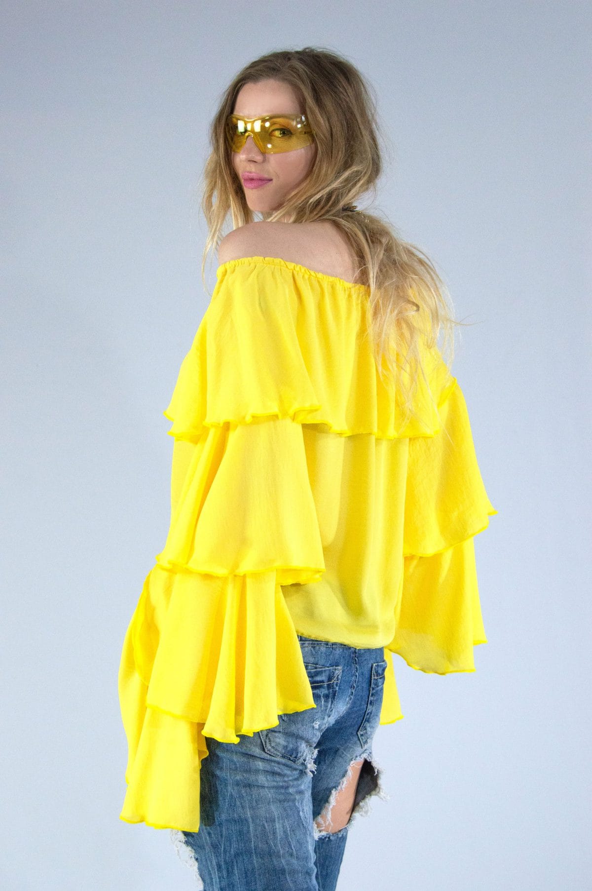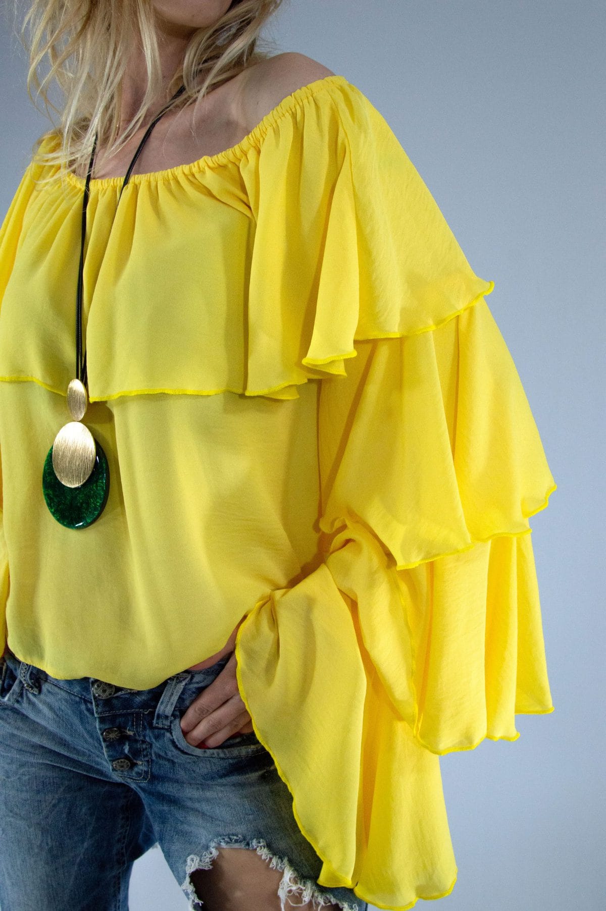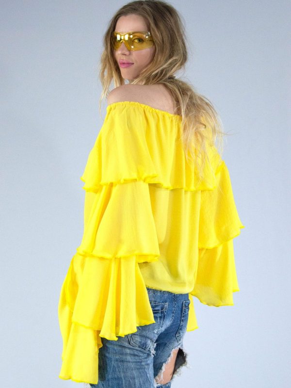 Veselá a romantická letná blúzka navrhnutá v slniečkovej žltej farbe. Blúzka je ušitá z naskladaných volánoch, čo jej dodáva romantický nádych sviežeho leta. Blúzku ľahko skombinujete k šortkám alebo nohaviciam a vytvoríte svieži a optimistický letný look.
