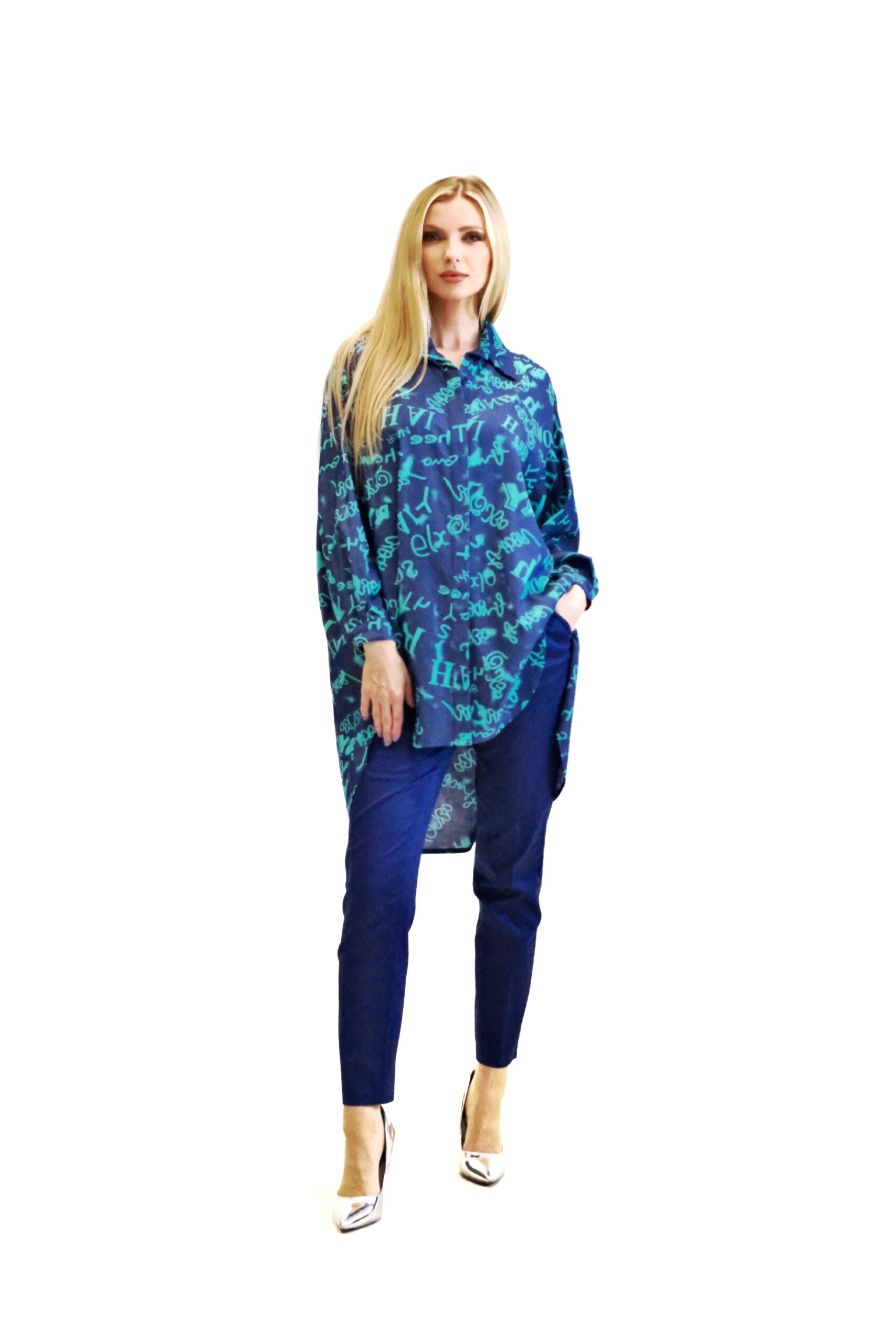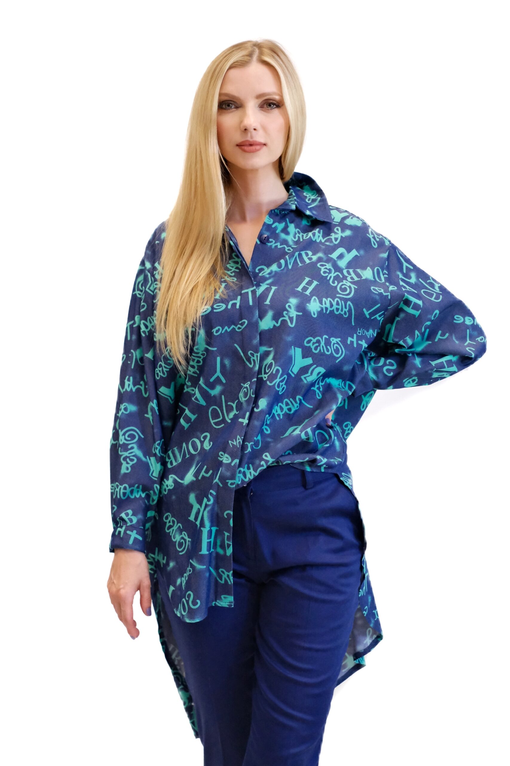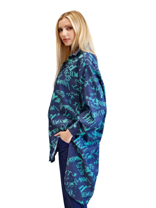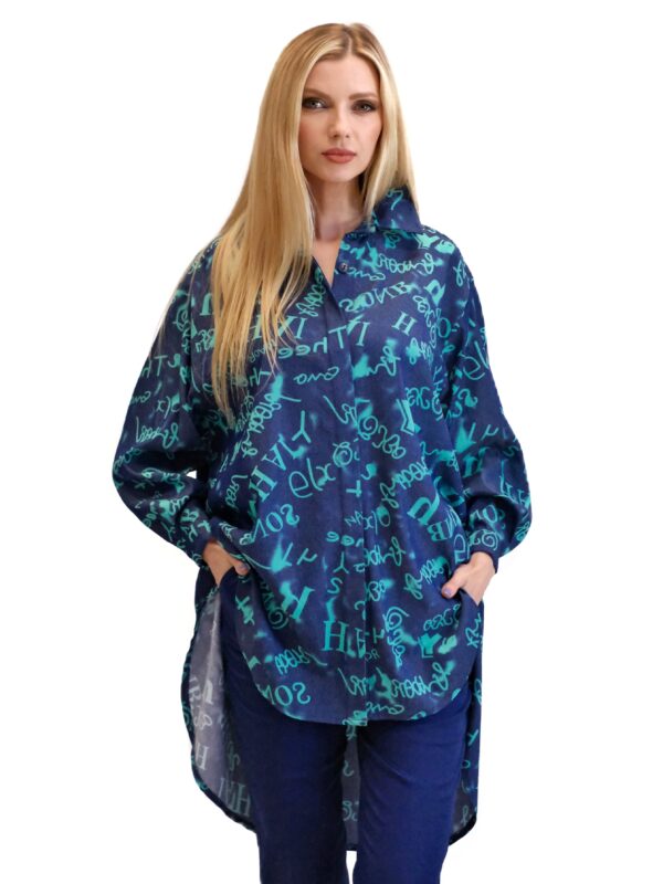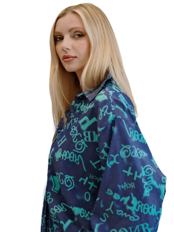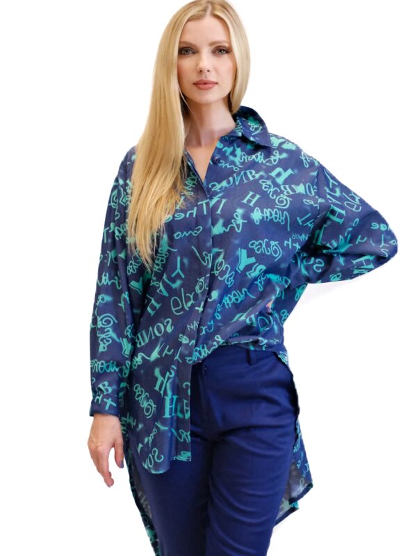 Košeľa je navrhnutá v pohodlnom oversize strihu, ktorý sadne na každý typ postavy. Košeľa je ušitá z vynikajúceho dýchateľného materiálu, v ktorom sa budete cítiť skvele aj počas horúcich letných dní. Košeľa je kombináciou tmavomodrej a tyrkysovej, v ktorej sú vyvydené písmena. Kombinujte ako naše stylistka s tmavomodrými nohavicami.