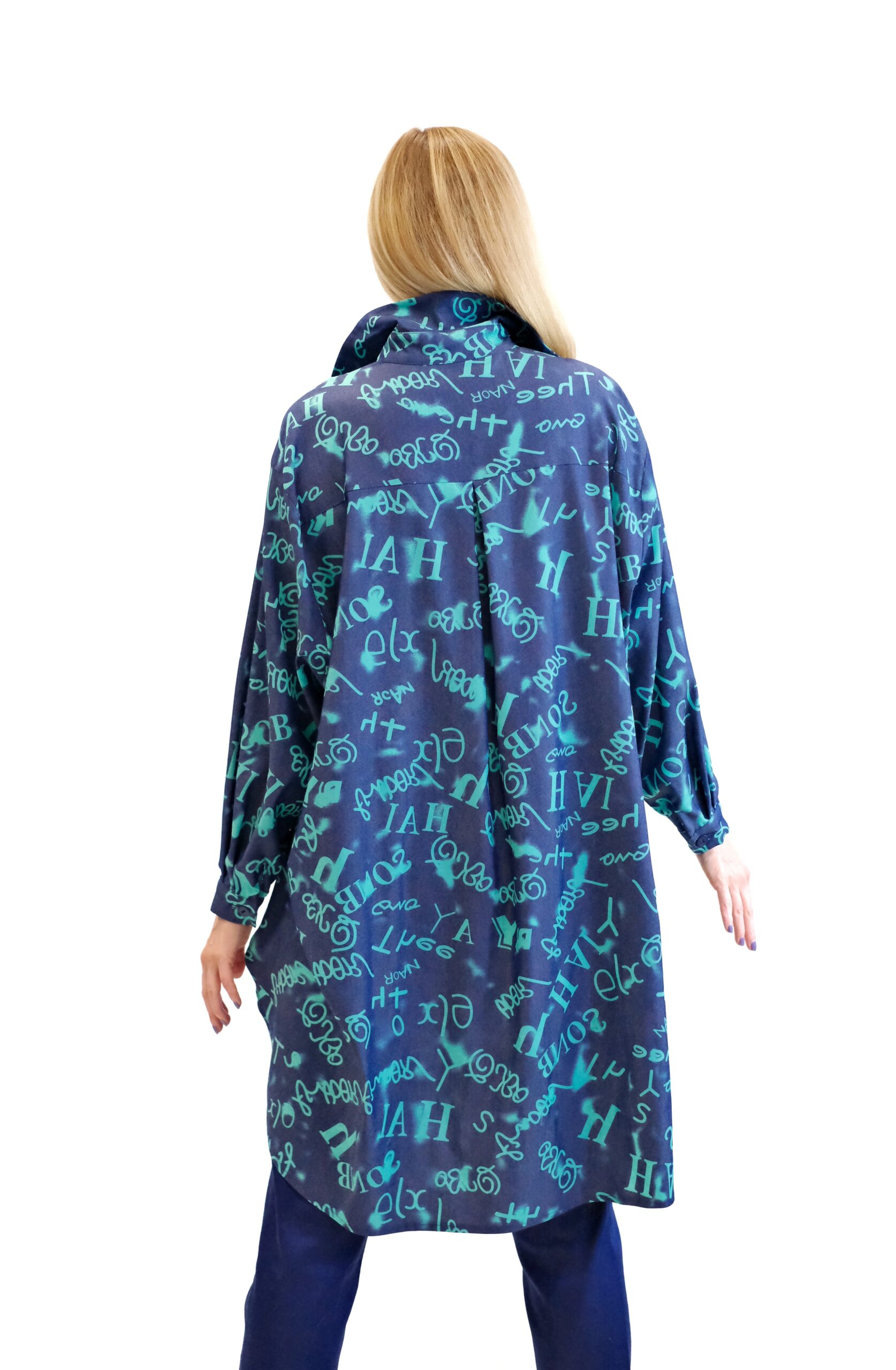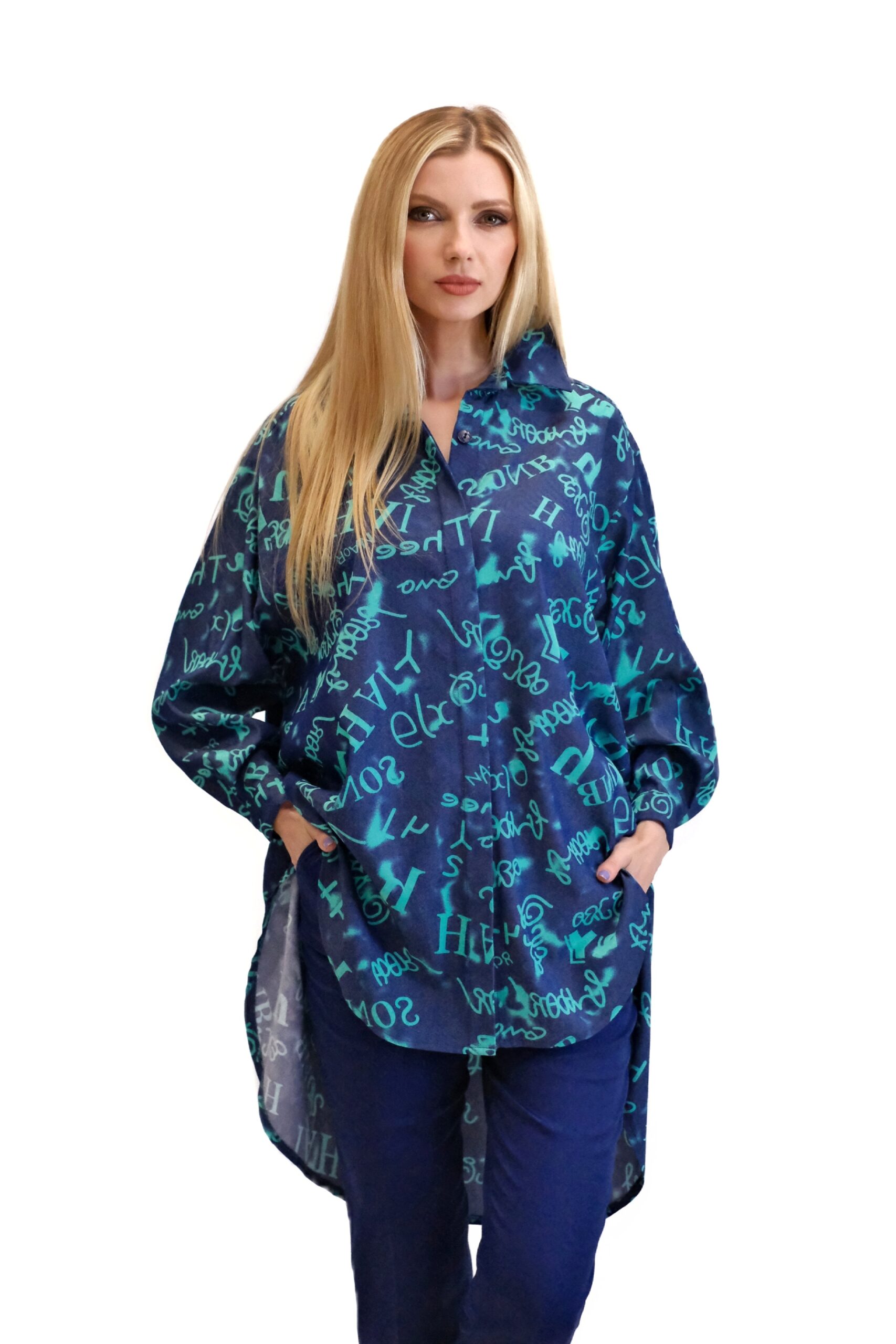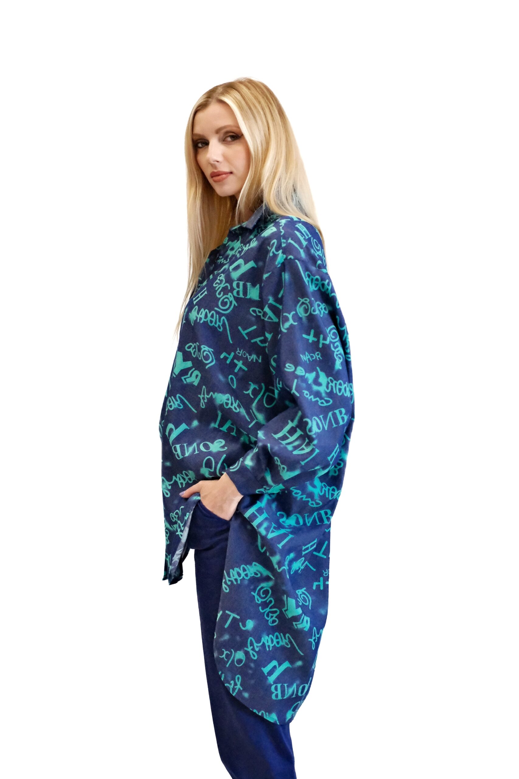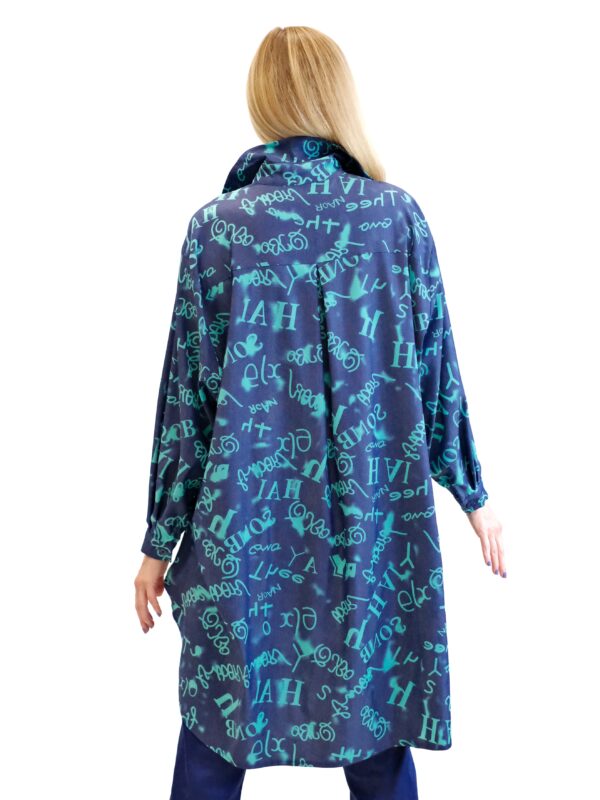 Košeľa je navrhnutá v pohodlnom oversize strihu, ktorý sadne na každý typ postavy. Košeľa je ušitá z vynikajúceho dýchateľného materiálu, v ktorom sa budete cítiť skvele aj počas horúcich letných dní. Košeľa je kombináciou tmavomodrej a tyrkysovej, v ktorej sú vyvydené písmena. Kombinujte ako naše stylistka s tmavomodrými nohavicami.