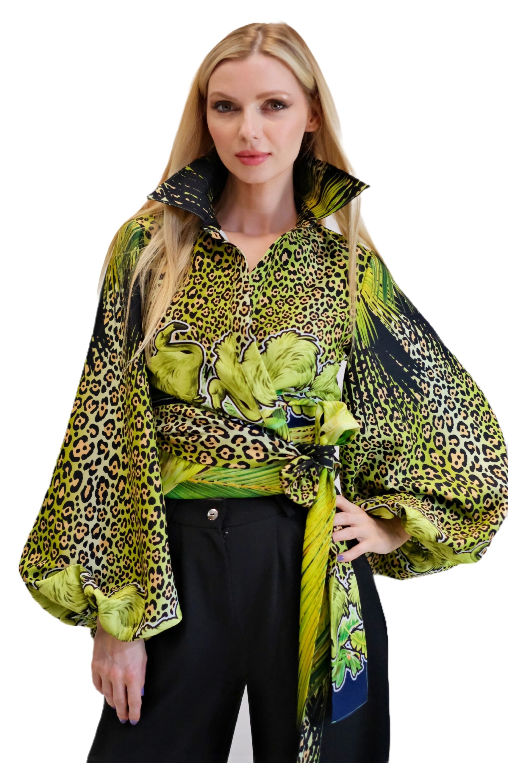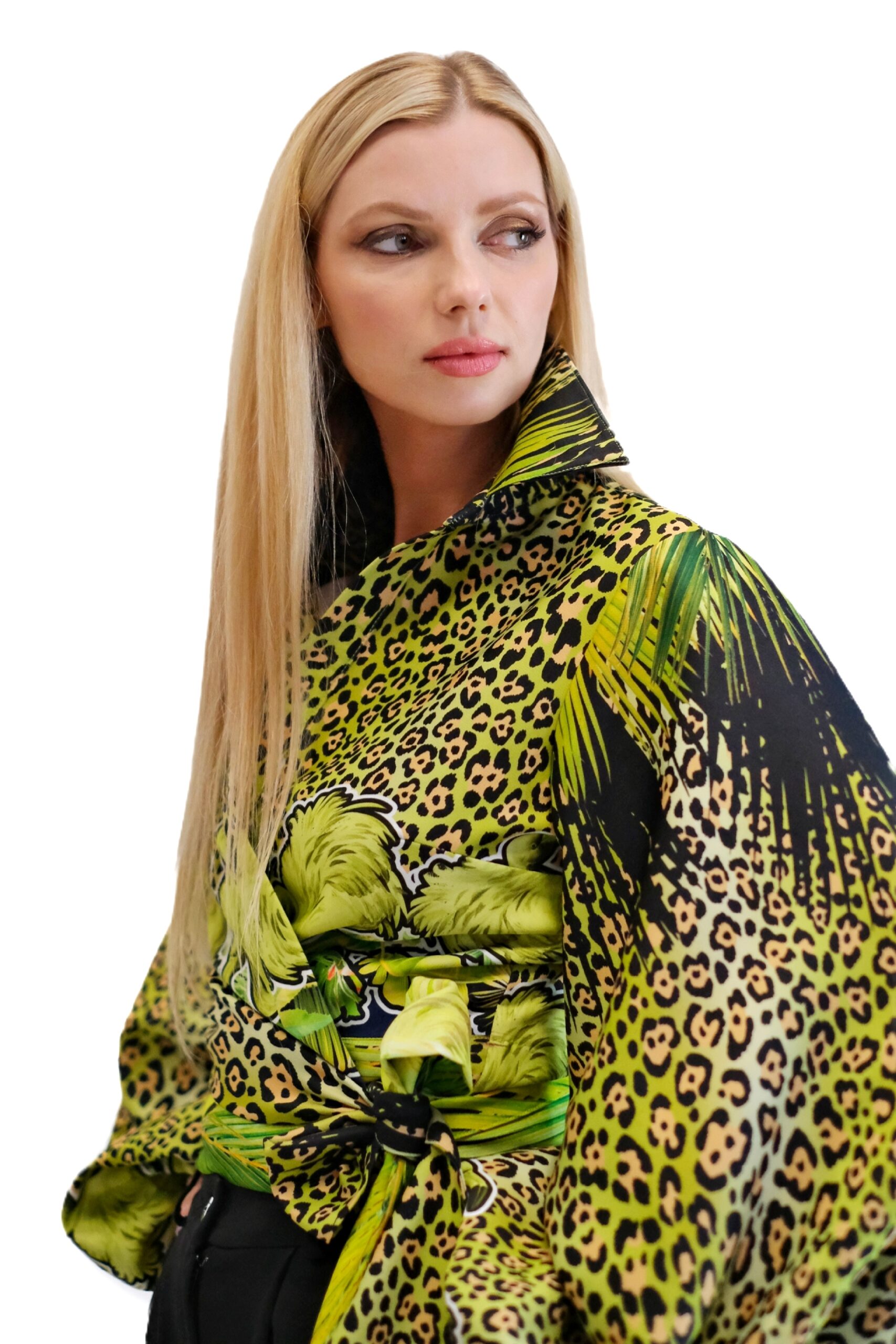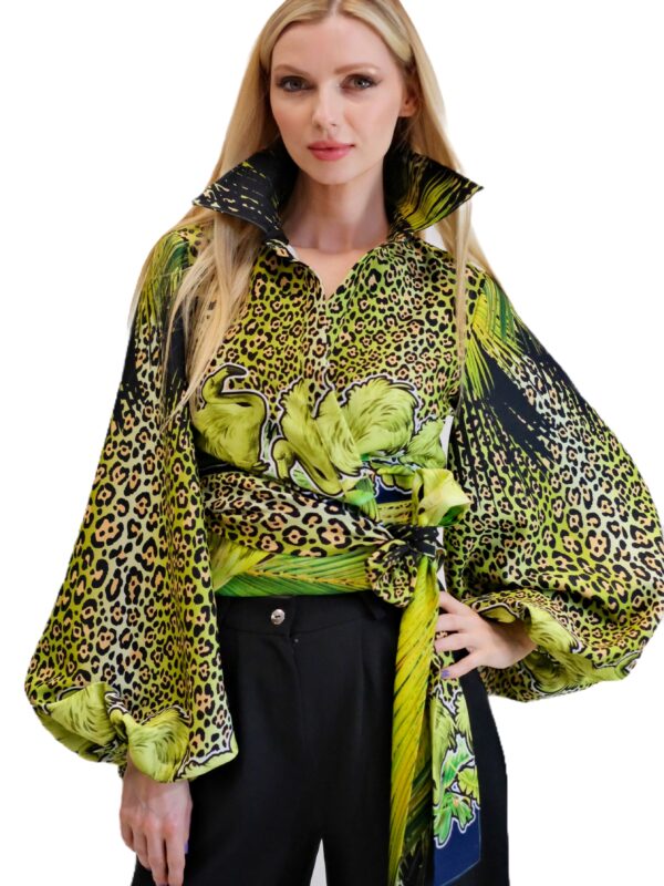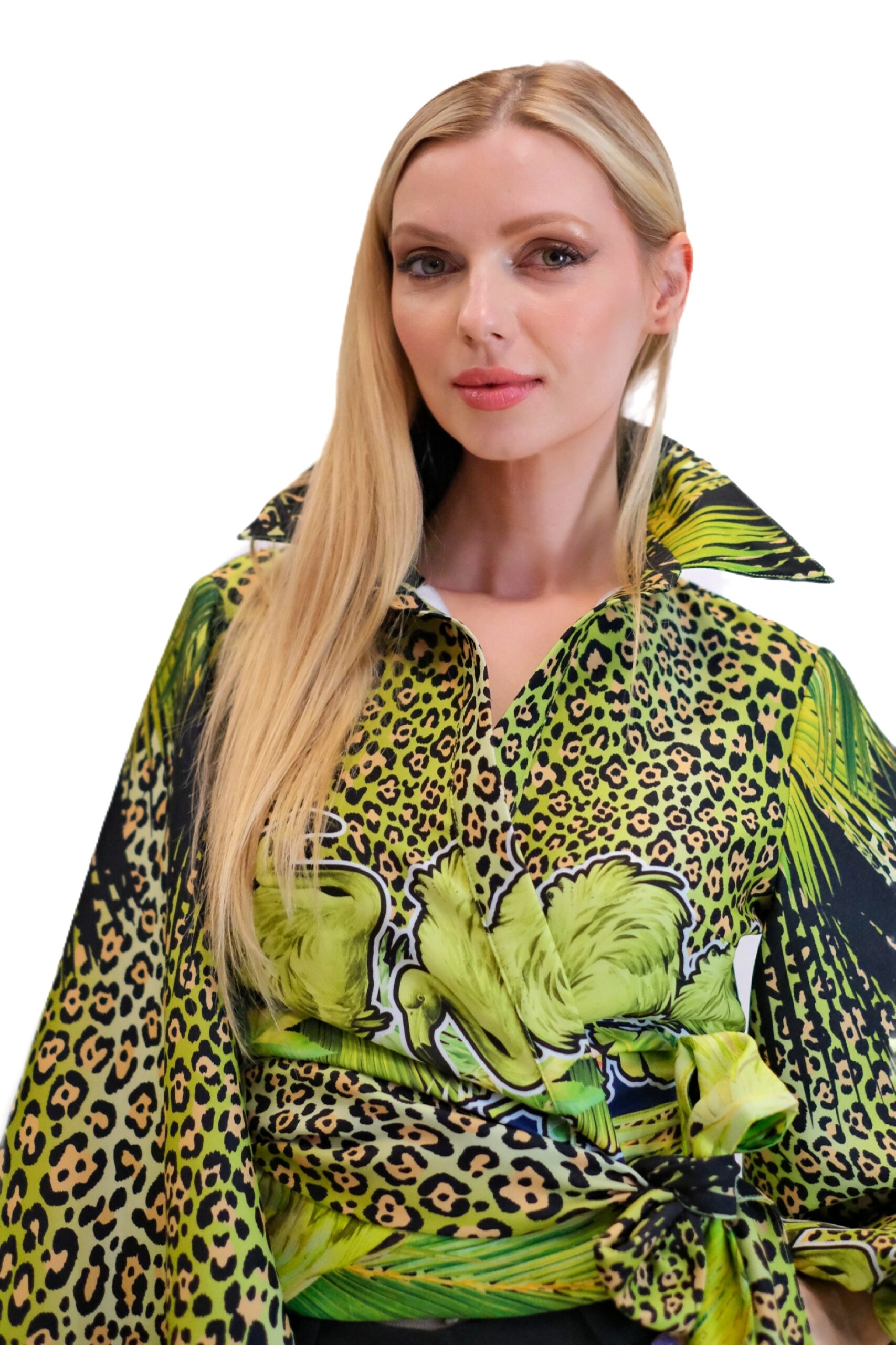 Top je navrhnutý v prepracovanom strihu, kedy kombinuje strohosť pánskeho košeľového prevedenia s eleganciou blúzky s bohémskými rukávmi. Výsledkom je spojenie elegancie a nevtieravého štýlu. Zaujímavým detailom je zaväzovanie v štýle kimona. Top je navrhnutý vo výraznom vzore, ktorý kombinuje prvky džungle so zvieracími vzormi. Kombinujte so zelenými doplnkami pre wau efekt. Top sa hodí rovnako k nohaviciam , ako k sukni.