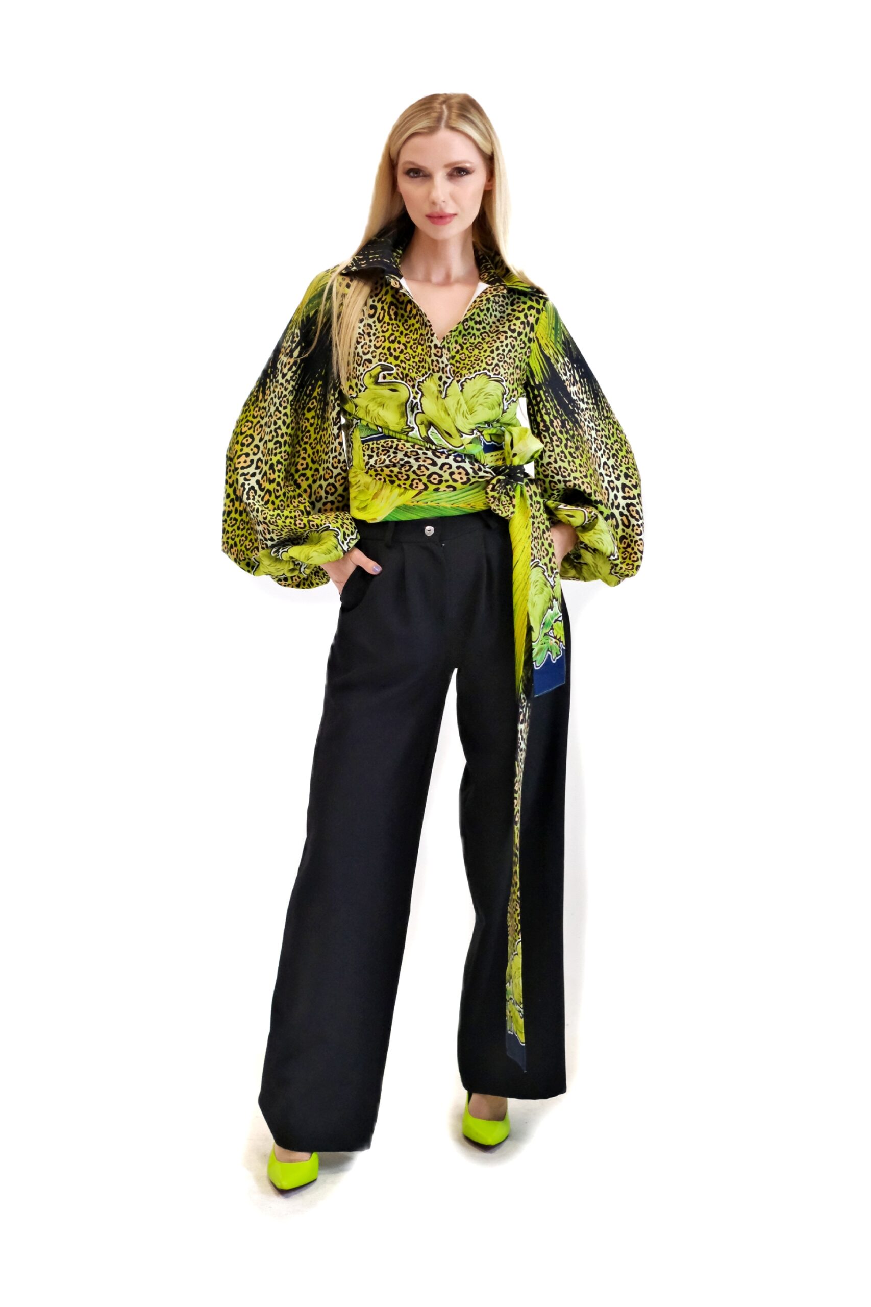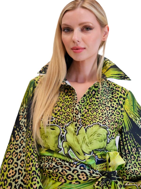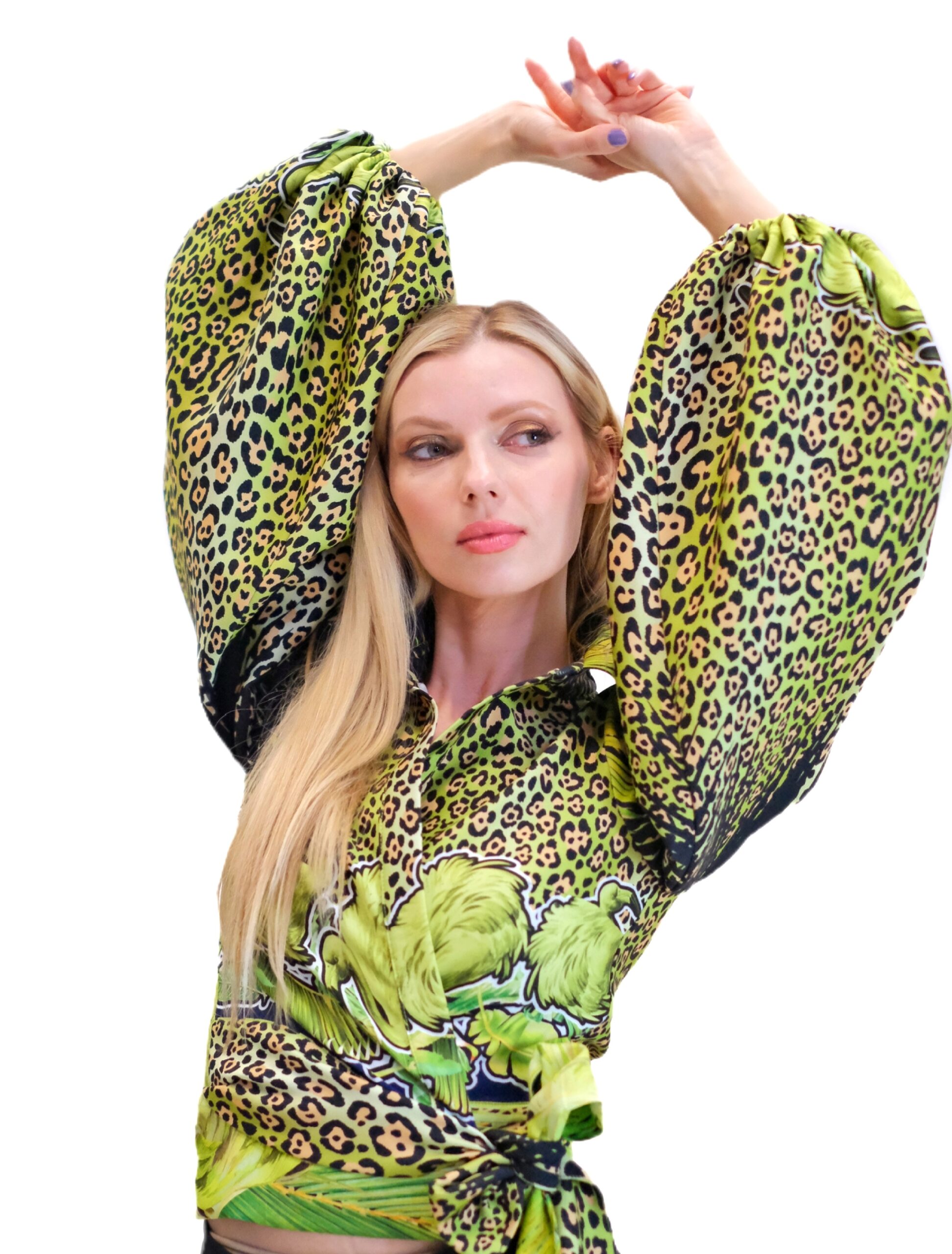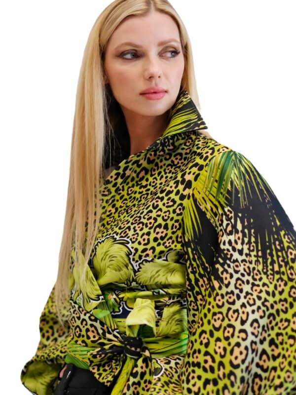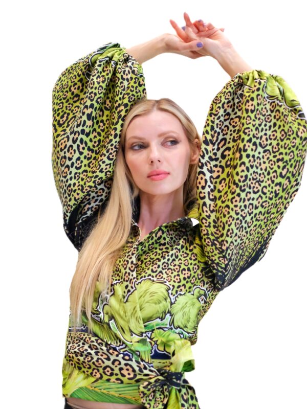 Top je navrhnutý v prepracovanom strihu, kedy kombinuje strohosť pánskeho košeľového prevedenia s eleganciou blúzky s bohémskými rukávmi. Výsledkom je spojenie elegancie a nevtieravého štýlu. Zaujímavým detailom je zaväzovanie v štýle kimona. Top je navrhnutý vo výraznom vzore, ktorý kombinuje prvky džungle so zvieracími vzormi. Kombinujte so zelenými doplnkami pre wau efekt. Top sa hodí rovnako k nohaviciam , ako k sukni.
