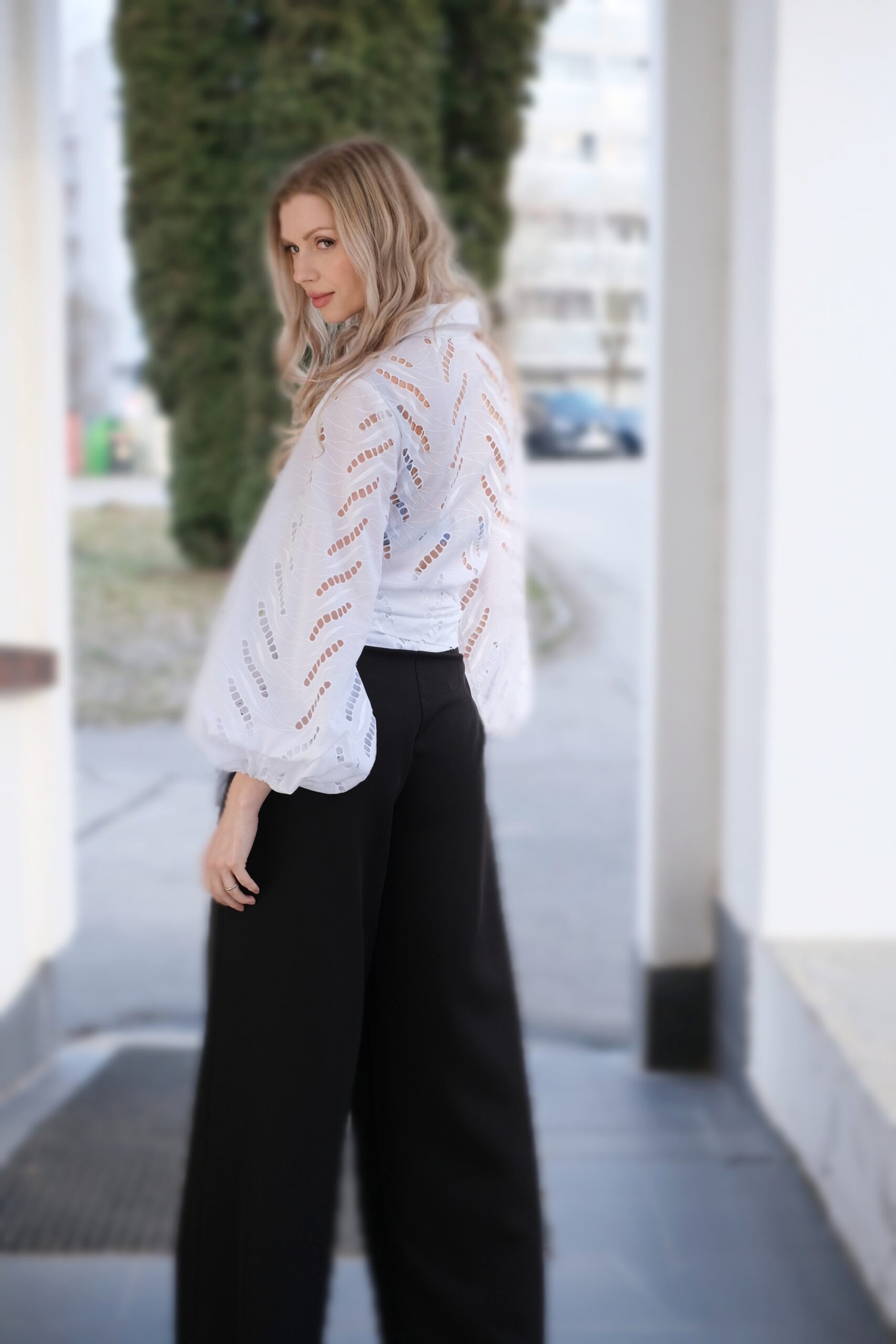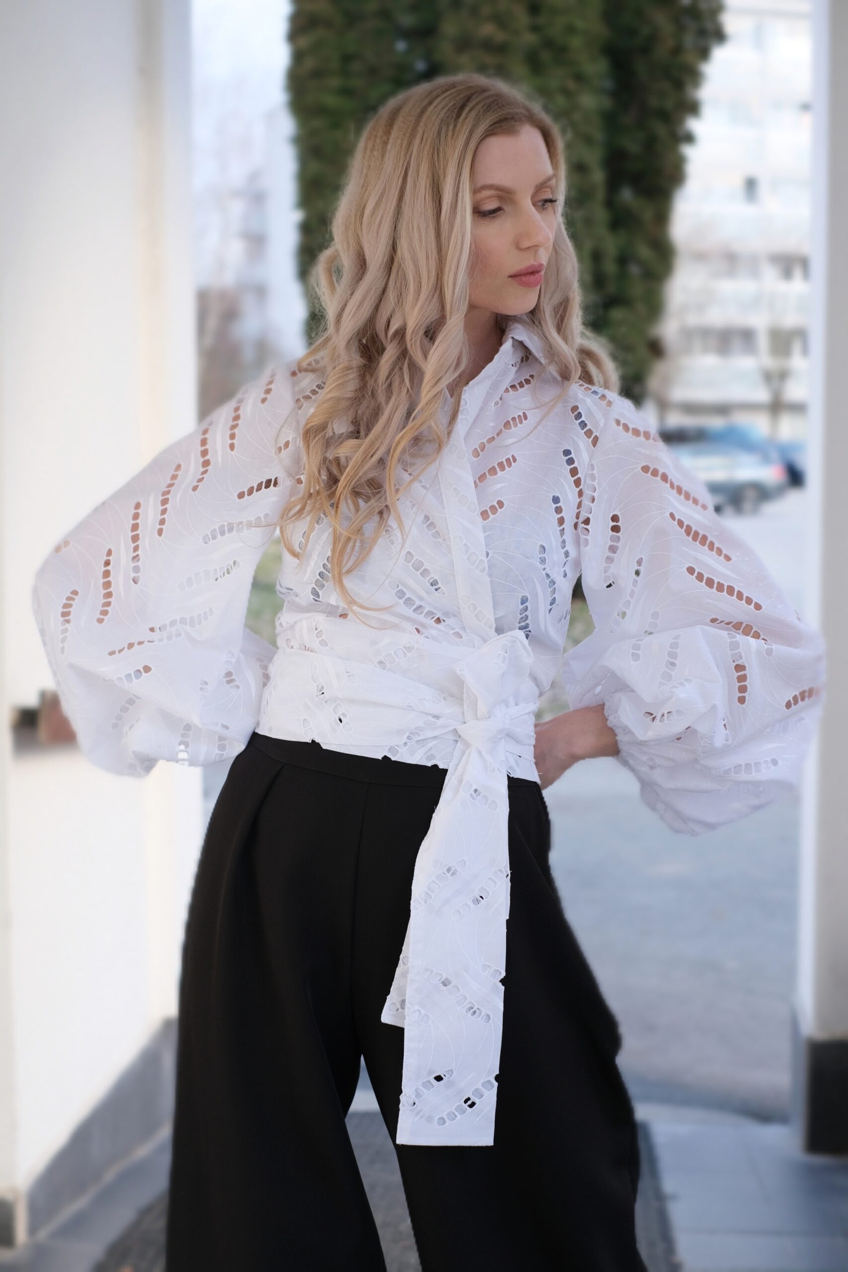 Táto biela madeirová blúzka je stelesnením romantiky a nadčasovej elegancie. Je vyrobená z jemnej bavlny s charakteristickou dierkovanou výšivkou, ktorá modelu dodáva nezameniteľnú vzdušnosť a jemný luxus. Dominantným prvkom sú objemné pufované rukávy zakončené gumičkou, ktoré vytvárajú dramatickú a modernú siluetu.