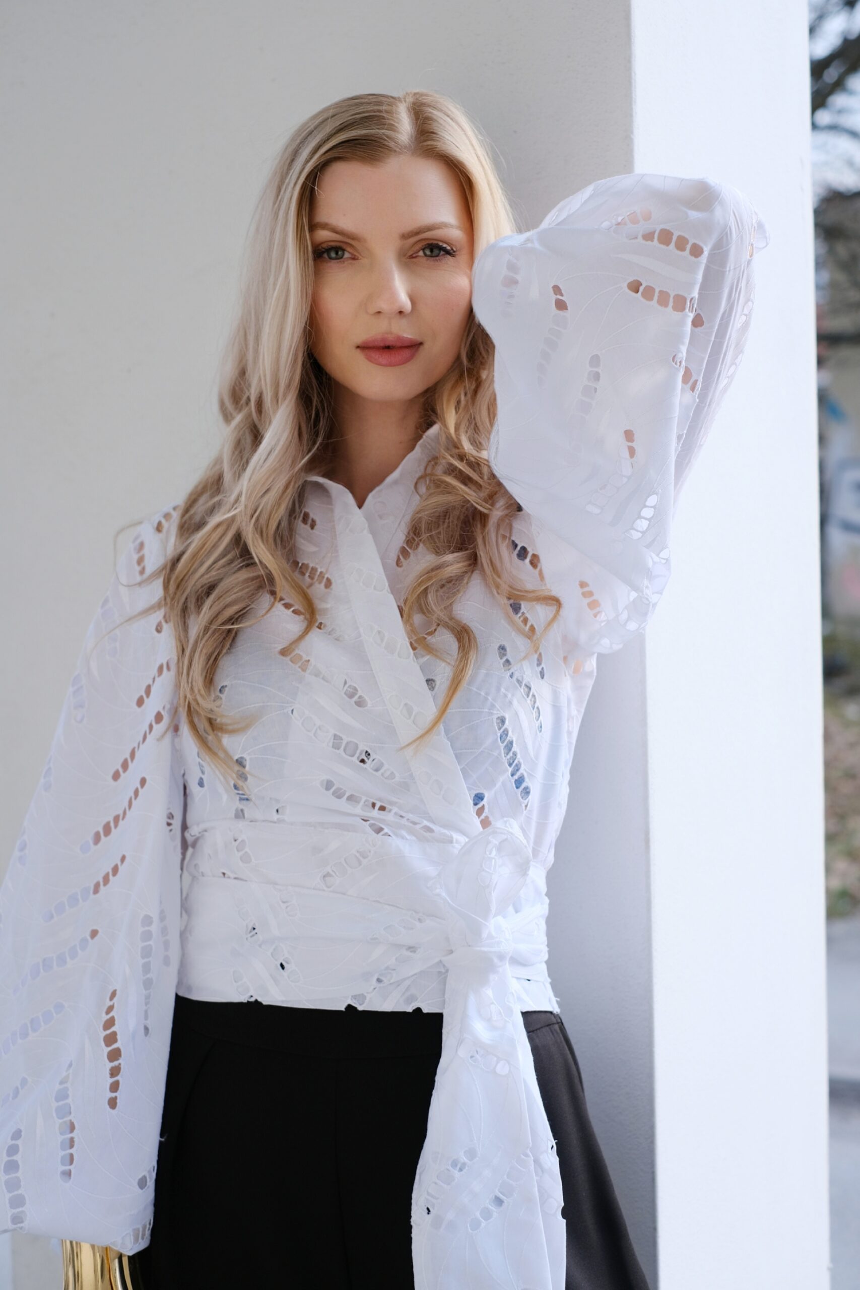 Strih blúzky využíva zavinovací efekt s výrazným viazaním na mašľu v páse, čo krásne definuje postavu a zvýrazňuje ženské krivky. Klasický košeľový golier dodáva celému dizajnu sofistikovaný nádych, vďaka čomu je blúzka ideálnou voľbou nielen na spoločenské udalosti a oslavy, ale aj do práce pre milovníčky vycibrenej módy.