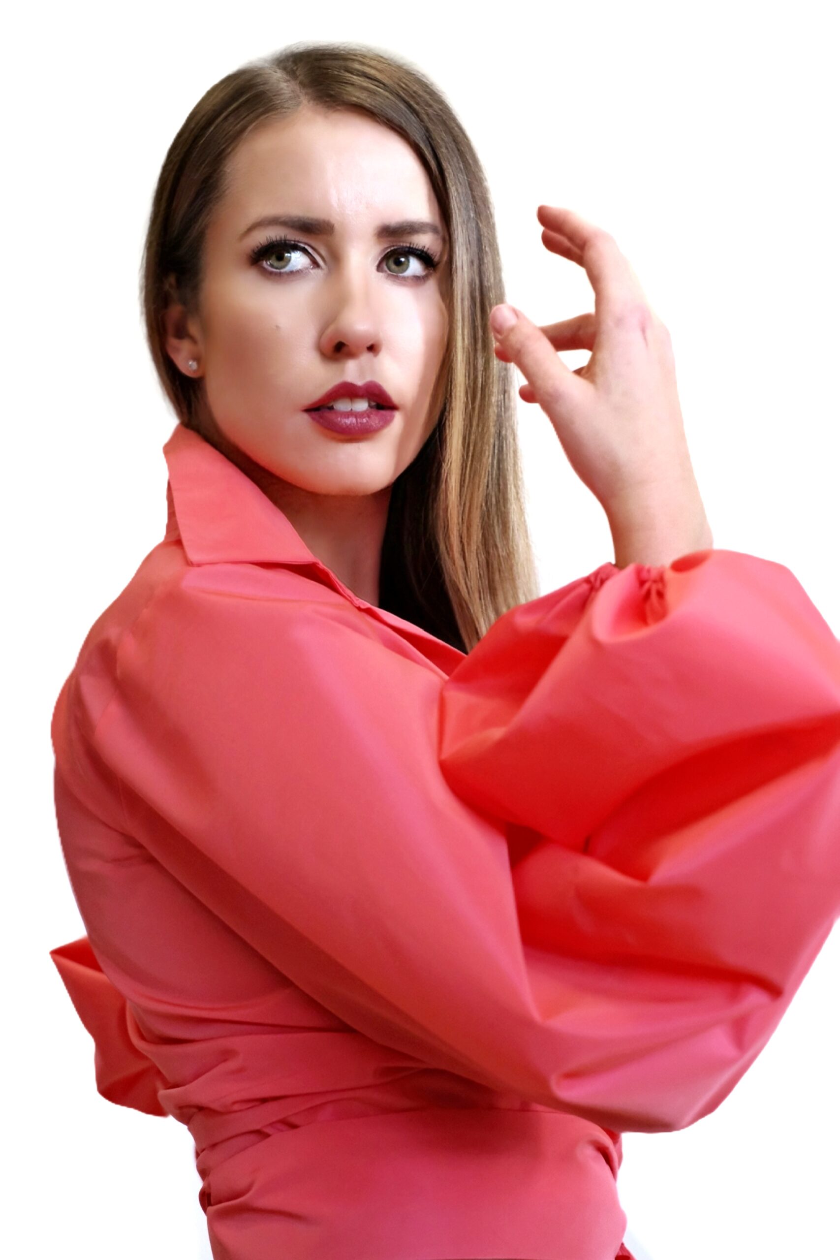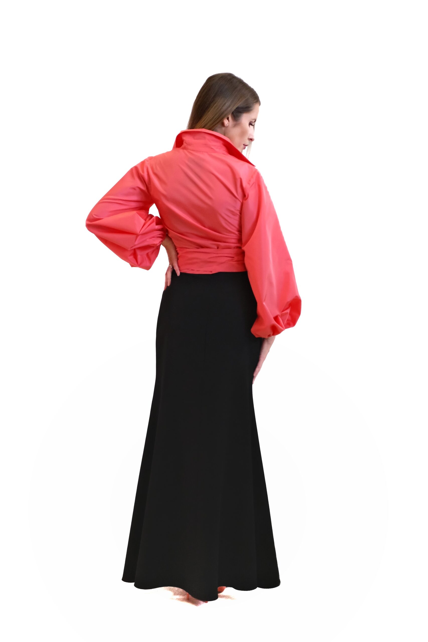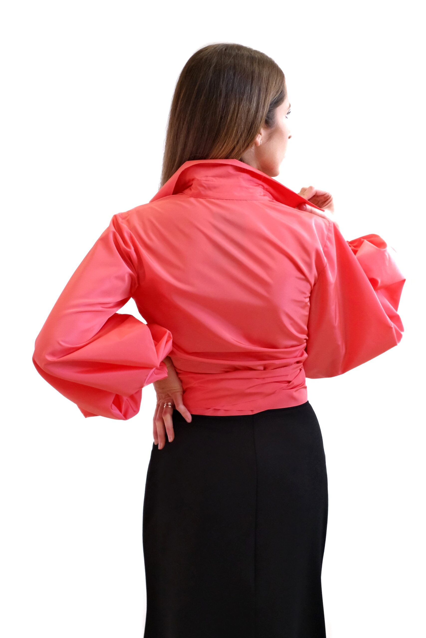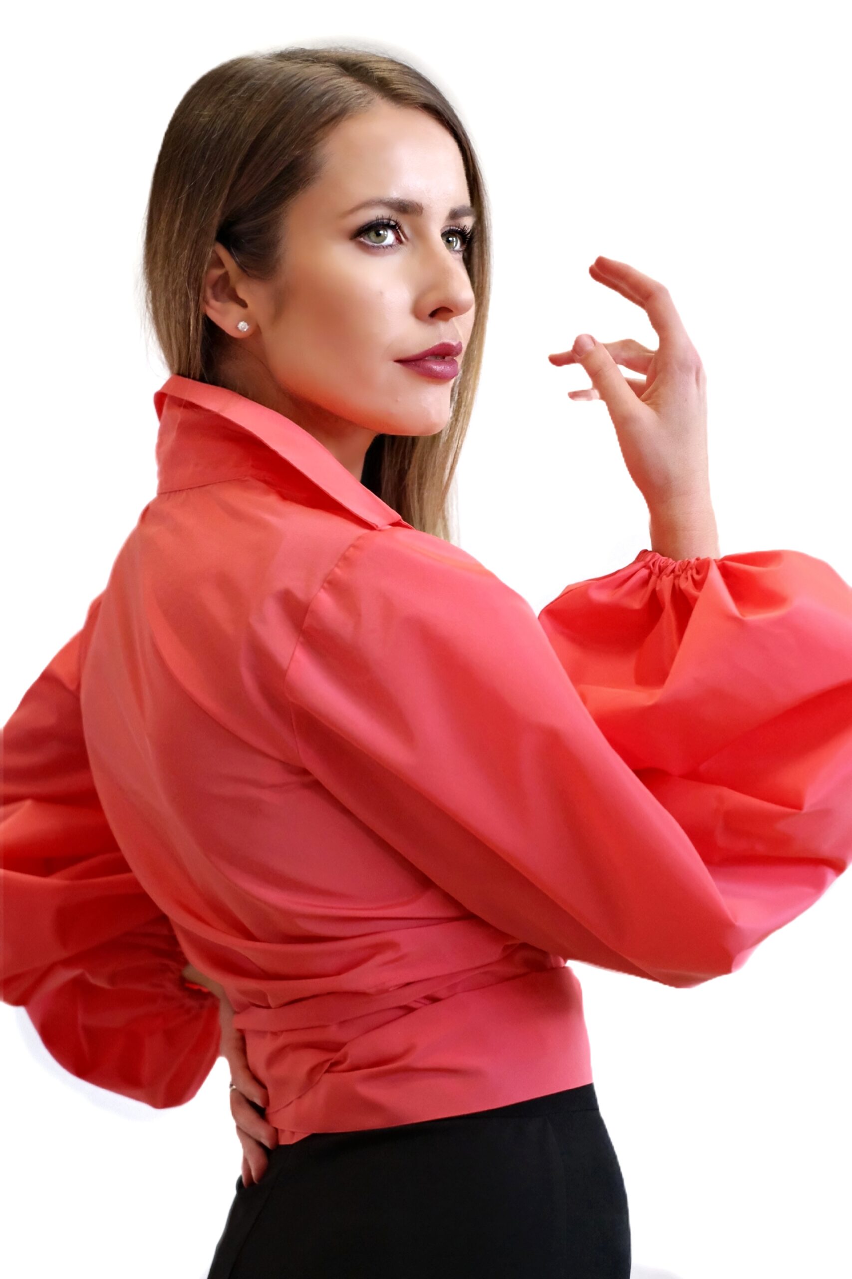 Top je navrhnutý v prepracovanom strihu, kedy kombinuje strohosť pánskeho košeľového prevedenia s eleganciou blúzky s bohémskými rukávmi. Výsledkom je spojenie elegancie a nevtieravého štýlu. Zaujímavým detailom je zaväzovanie v štýle kimona. Top je ušitý v krásnej lososovej farbe, ktorá rozžiari každý Váš outfit. Top sa hodí rovnako k nohaviciam , ako k sukni.