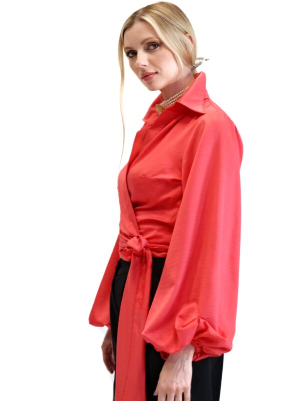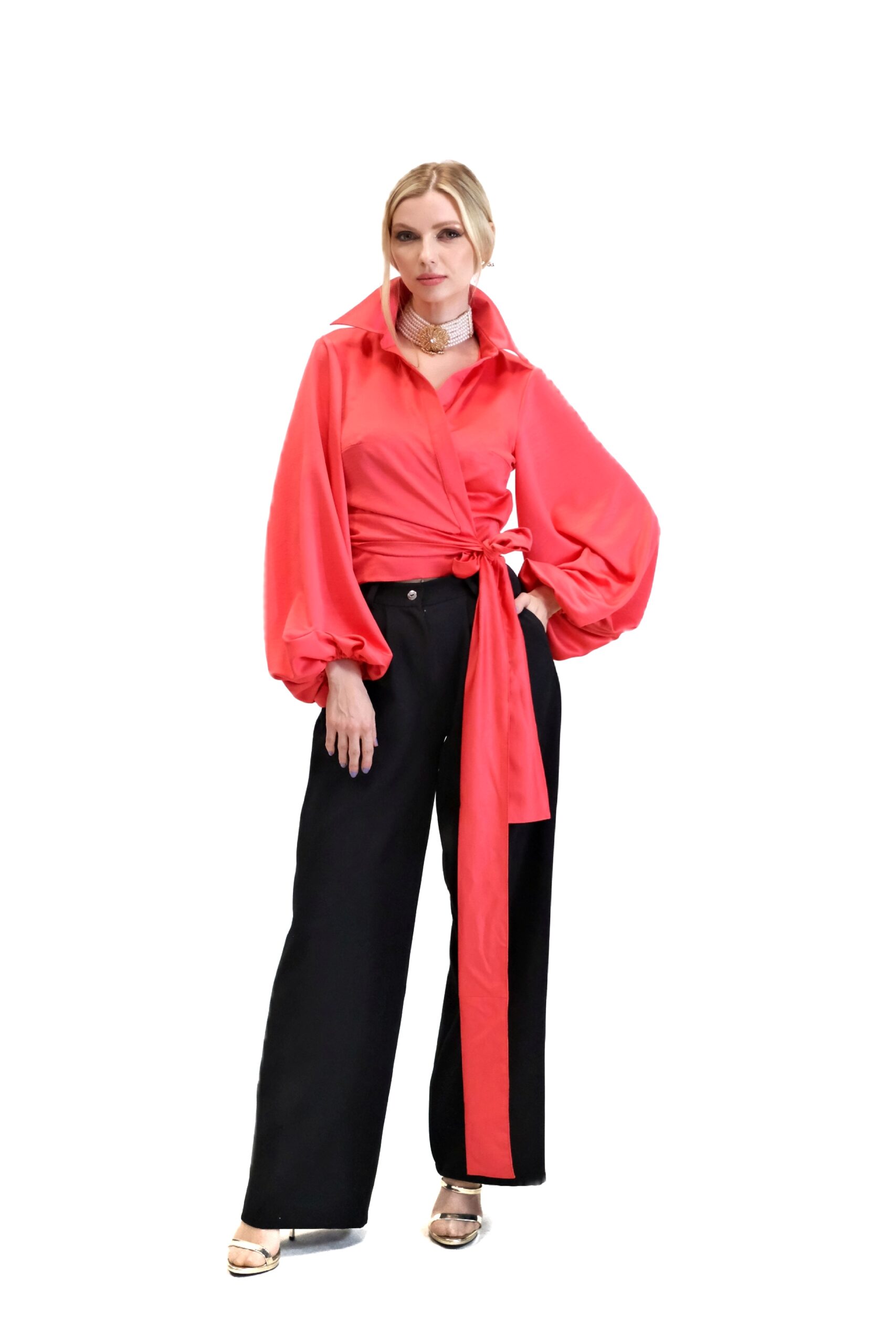 Top je navrhnutý v prepracovanom strihu, kedy kombinuje strohosť pánskeho košeľového prevedenia s eleganciou blúzky s bohémskými rukávmi. Výsledkom je spojenie elegancie a nevtieravého štýlu. Zaujímavým detailom je zaväzovanie v štýle kimona. Top je ušitý v krásnej lososovej farbe, ktorá rozžiari každý Váš outfit. Top sa hodí rovnako k nohaviciam , ako k sukni.