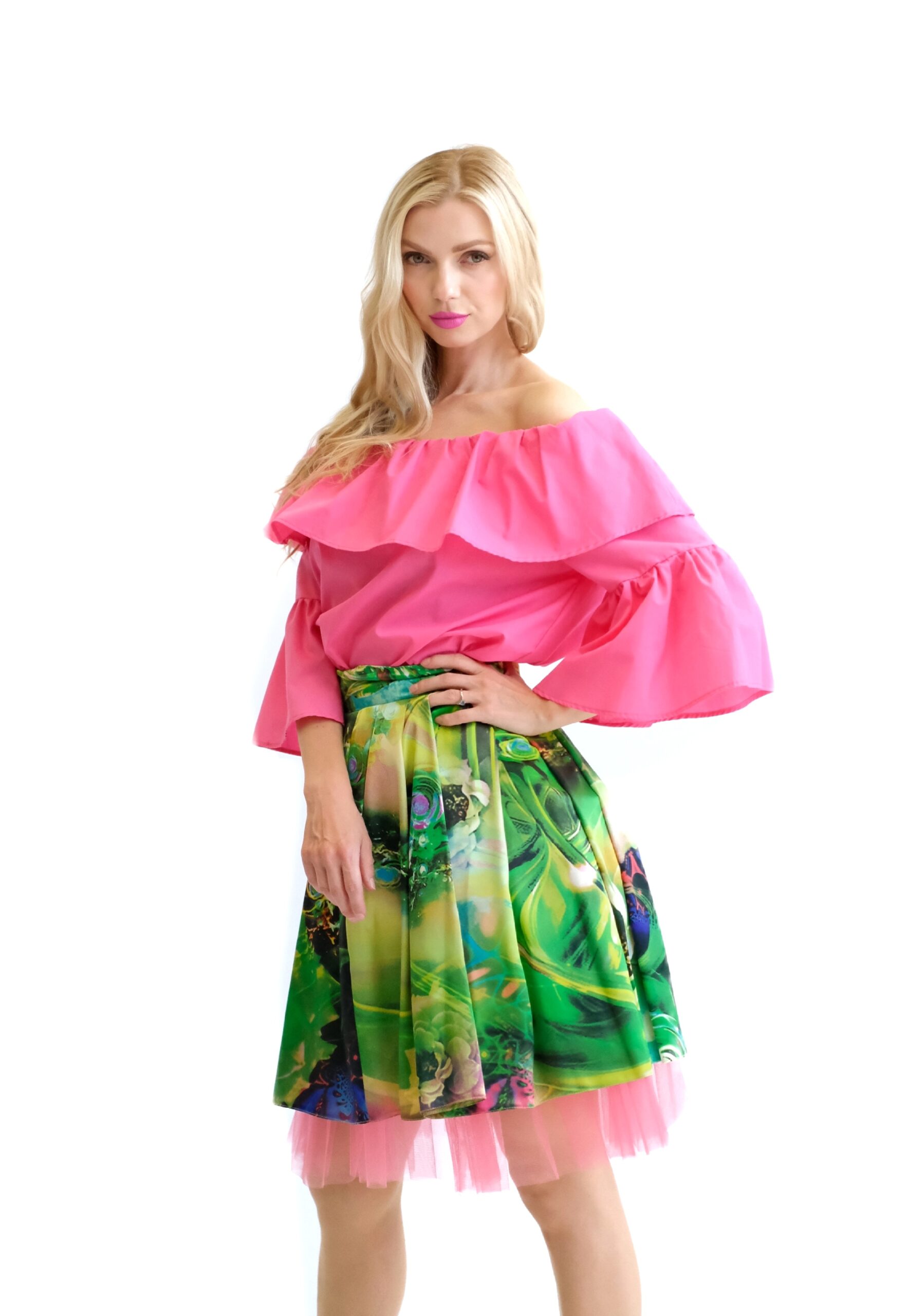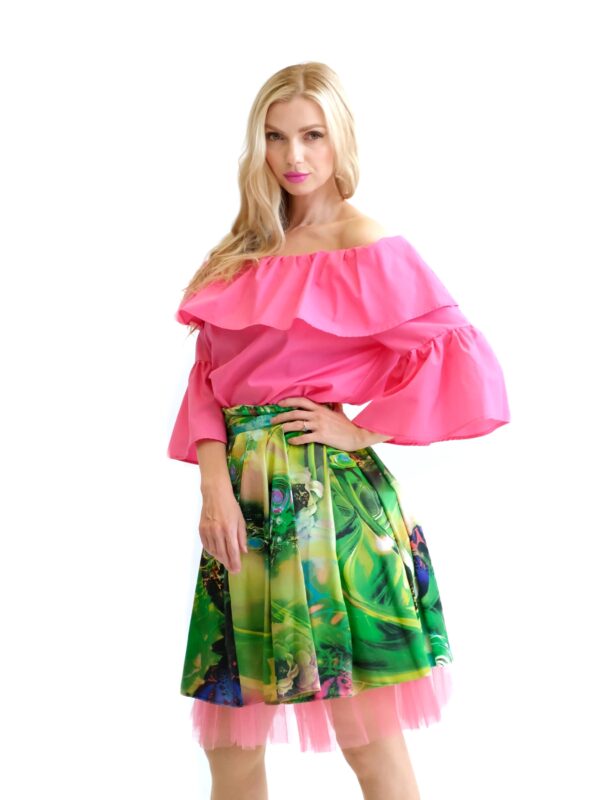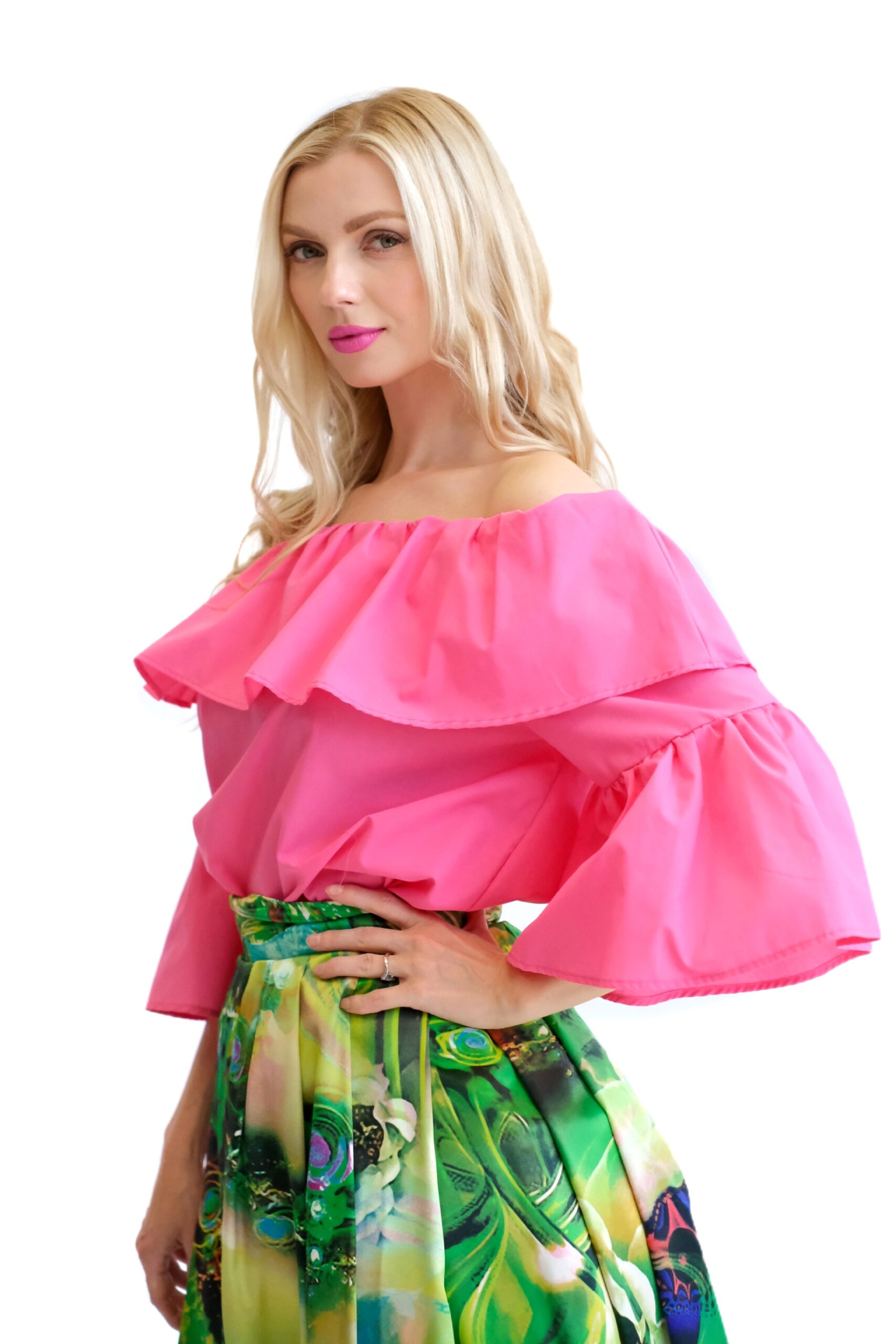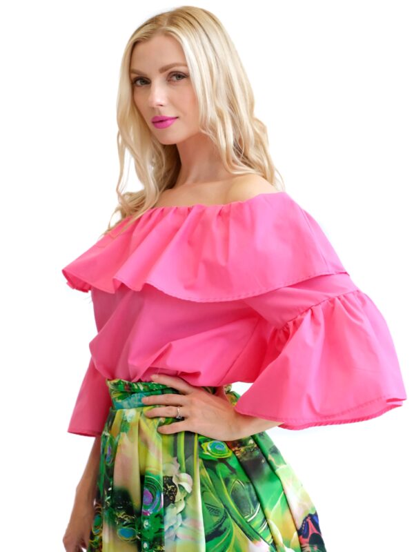 Top je navrhnutý v maximalistickom štýle v ktorom dominujú volány. Volány mu dodávajú na vzdušnosti a romantickosti. Top je ušitý vo výraznej ružovej farbe, ktorá skvele vynikne na opálenej pokožke. Top je navrhnutý zo vzdušnej a pevnej bavlnenej látky, v ktorej sa budete cítiť výborne aj počas horúcich letných dní.