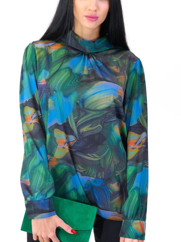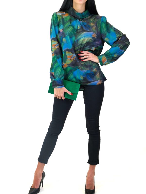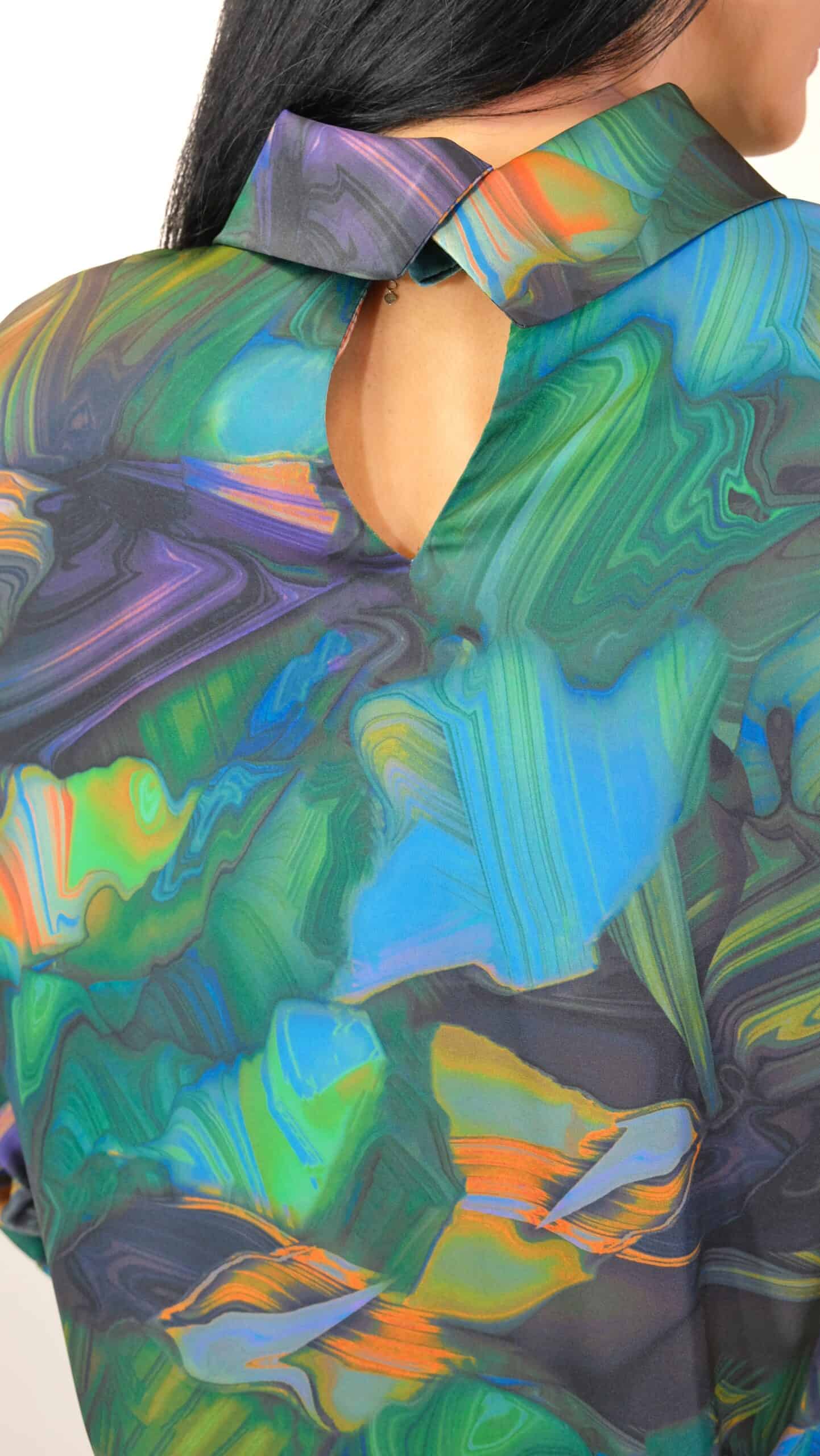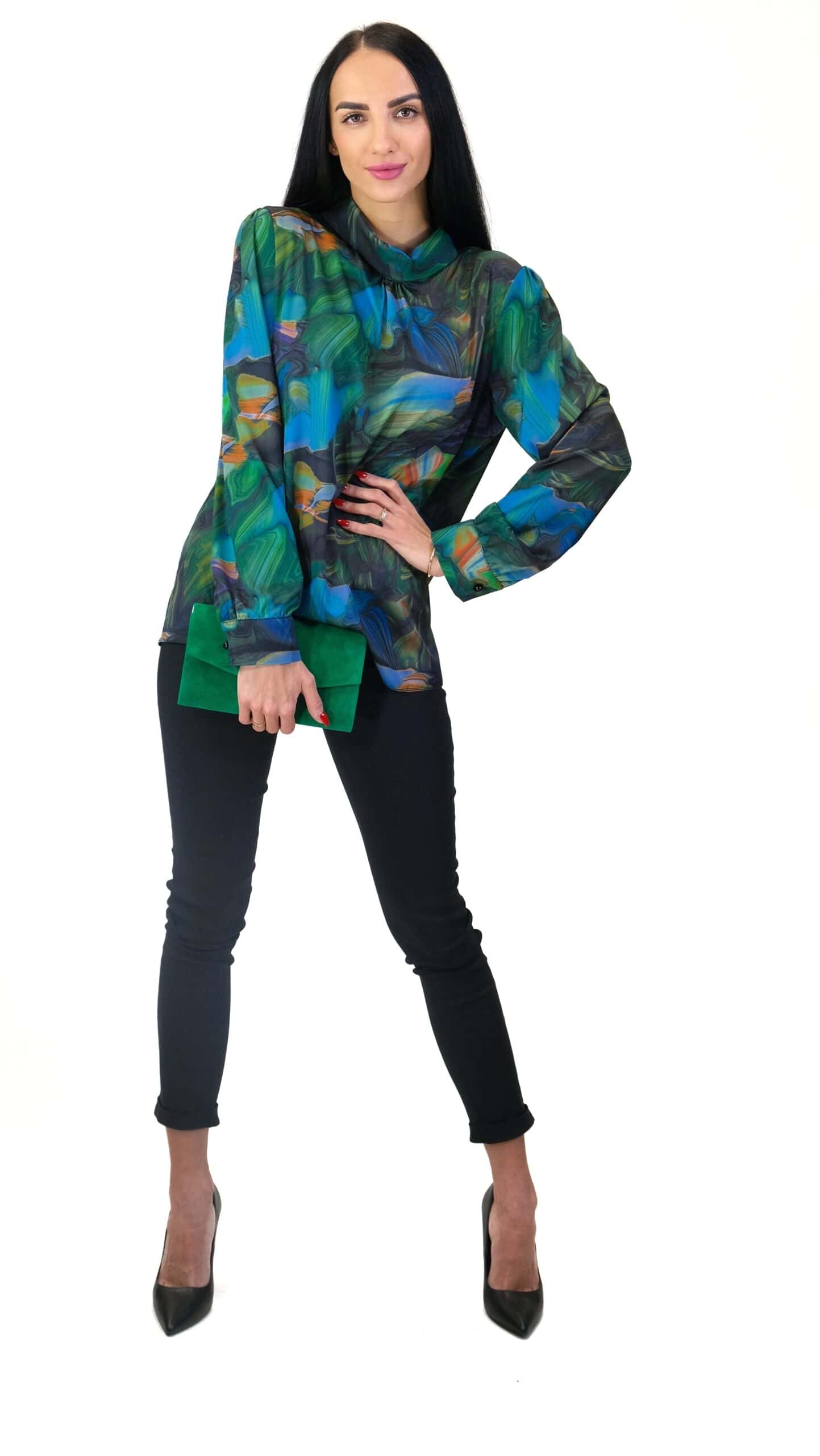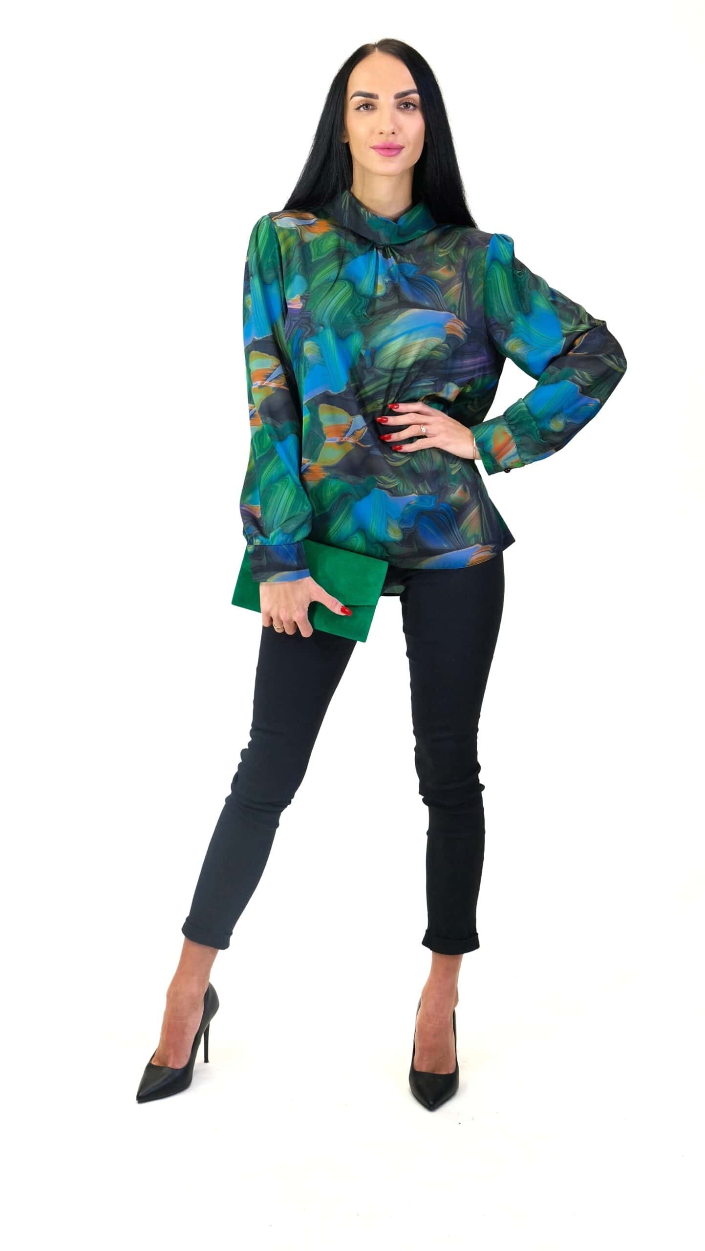 Top je ušitý v jednoduchom užšom strihu, ktorý nechá naplno vyniknúť prekrásnej potlači. Top je navrhnutý v abstraktnom motíve, v ktorom dominujú farby ako zelená, čierna a modrá. Top ľahko skombinujete s úzkymi čiernymi nohavicami. Top ma zaujímavo riešený golier, ktorý mu dodáva na plastickosti.