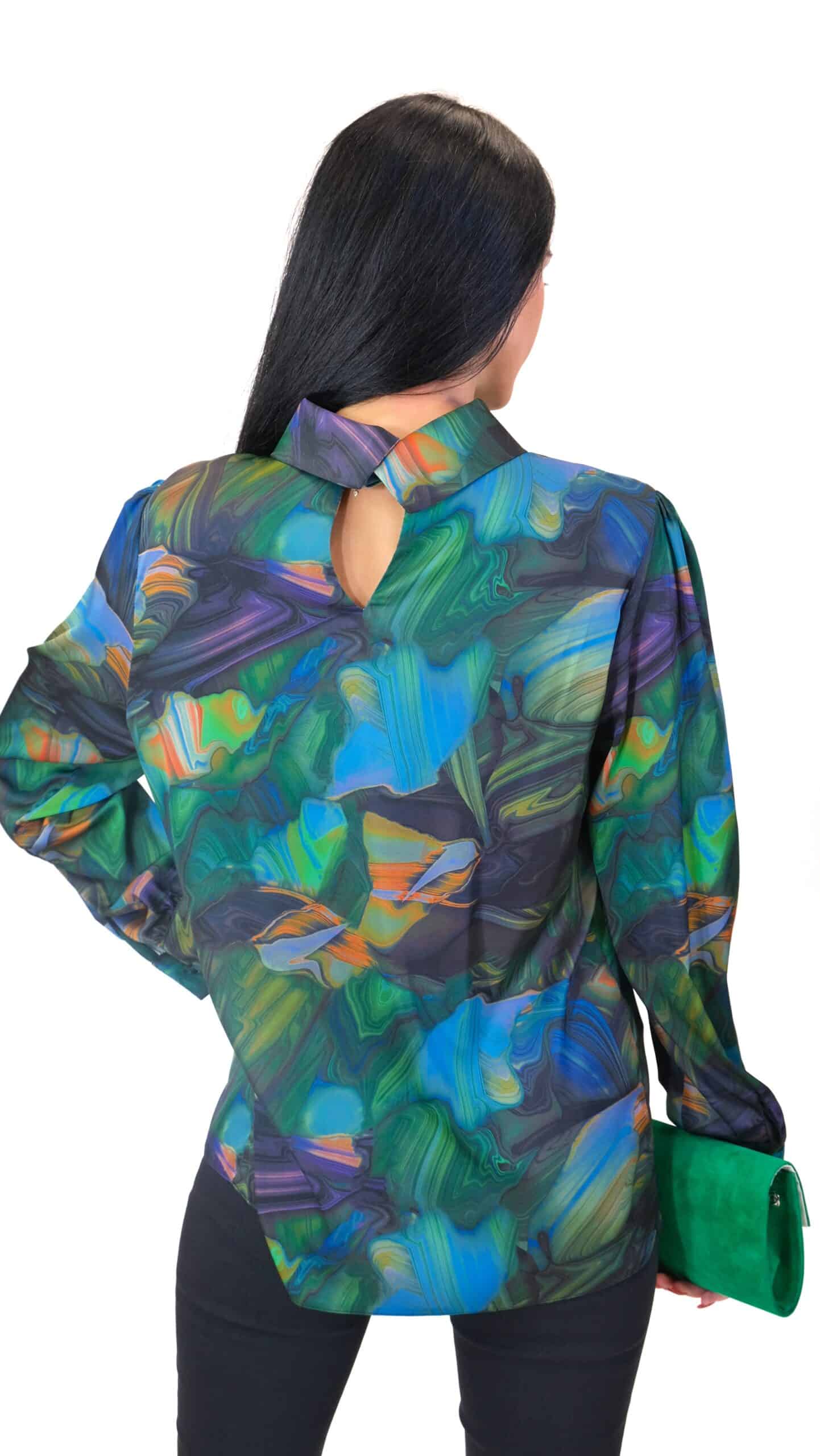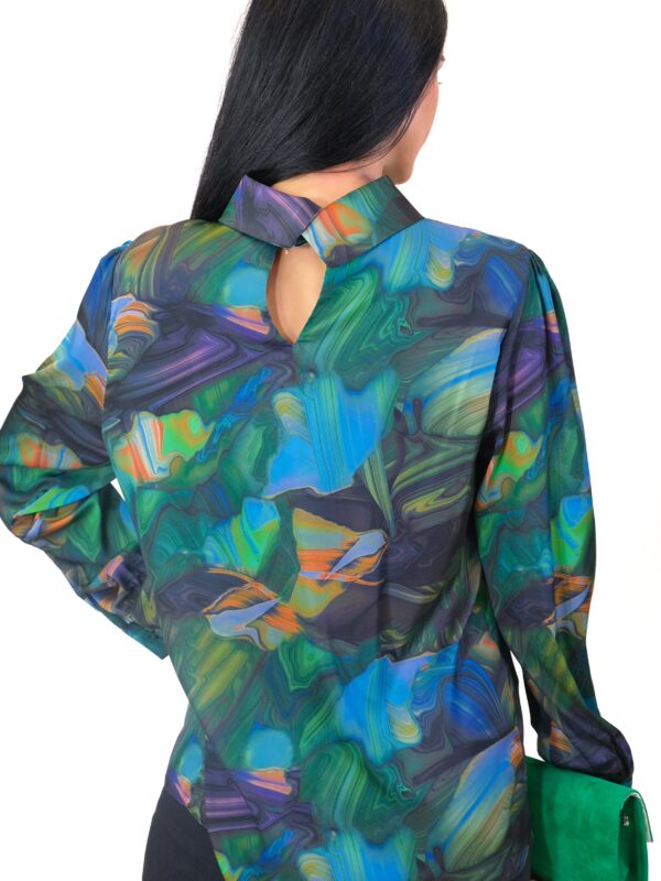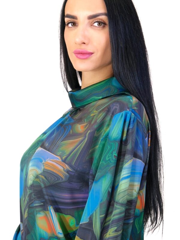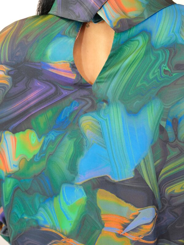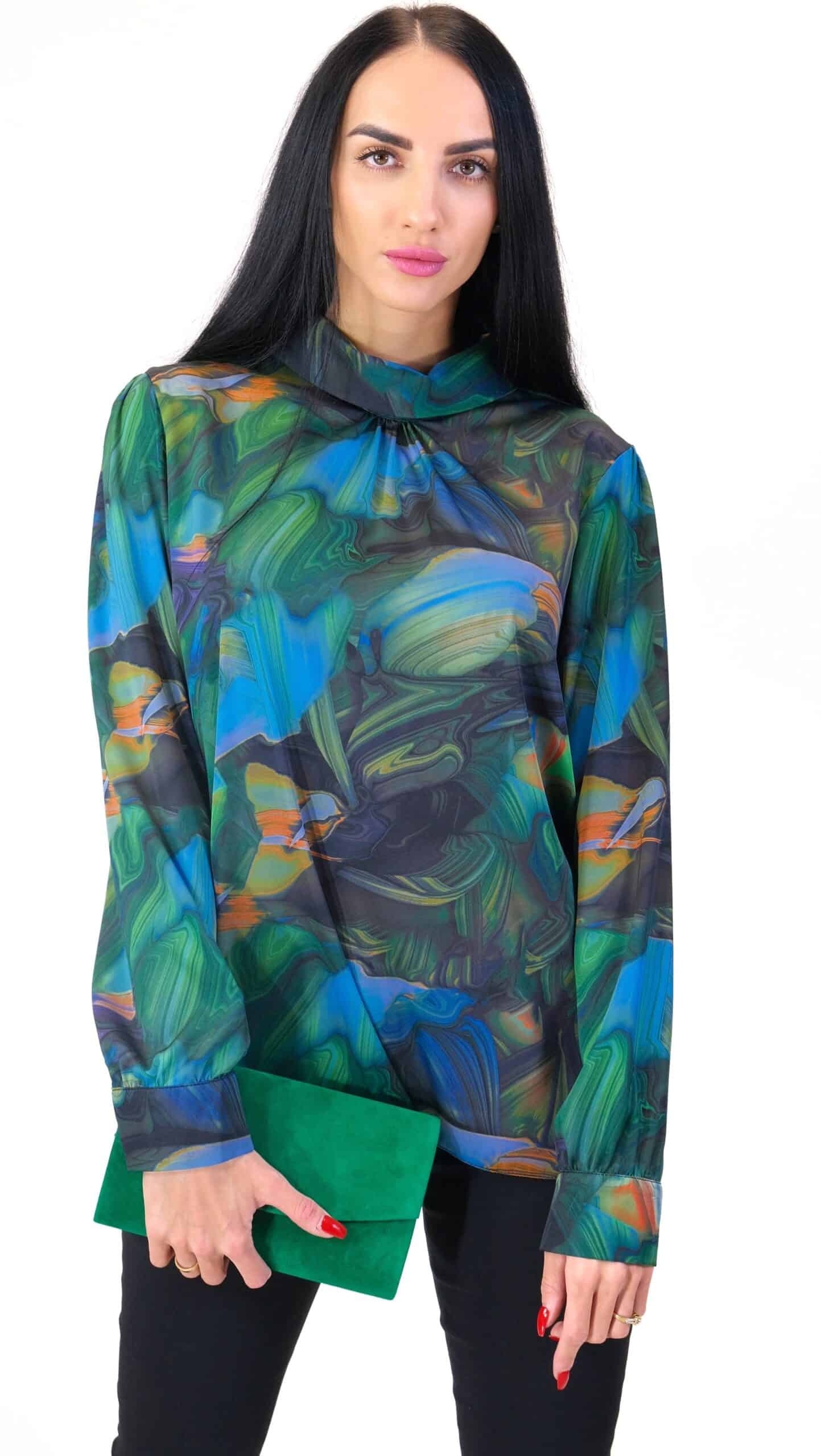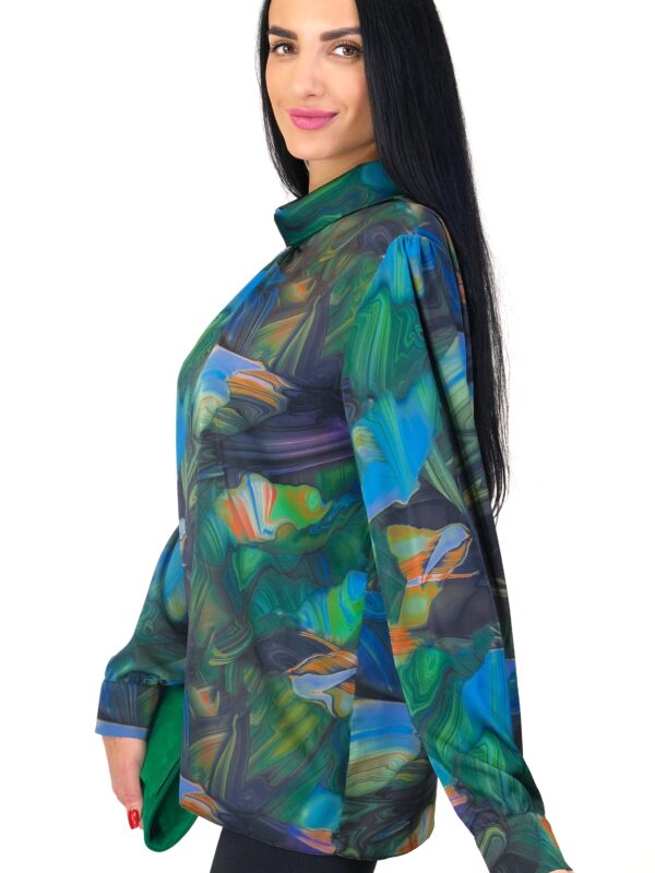 Top je ušitý v jednoduchom užšom strihu, ktorý nechá naplno vyniknúť prekrásnej potlači. Top je navrhnutý v abstraktnom motíve, v ktorom dominujú farby ako zelená, čierna a modrá. Top ľahko skombinujete s úzkymi čiernymi nohavicami. Top ma zaujímavo riešený golier, ktorý mu dodáva na plastickosti.