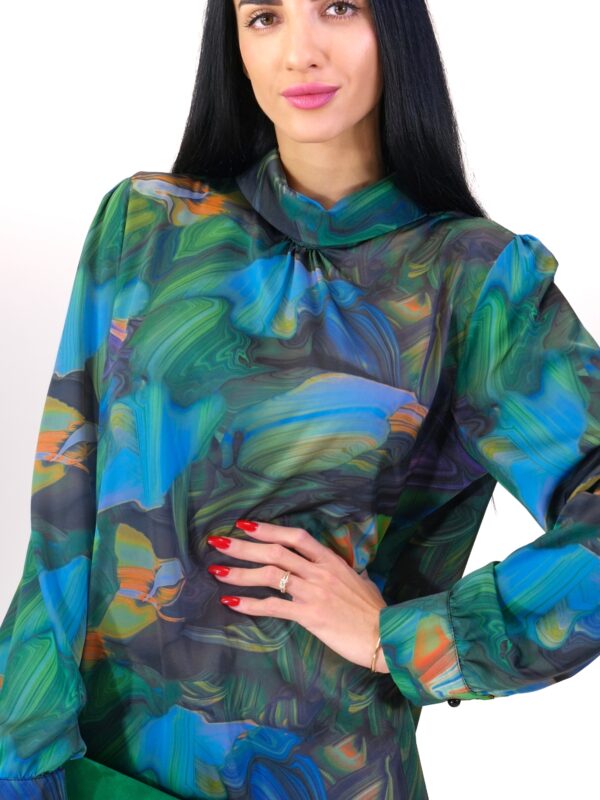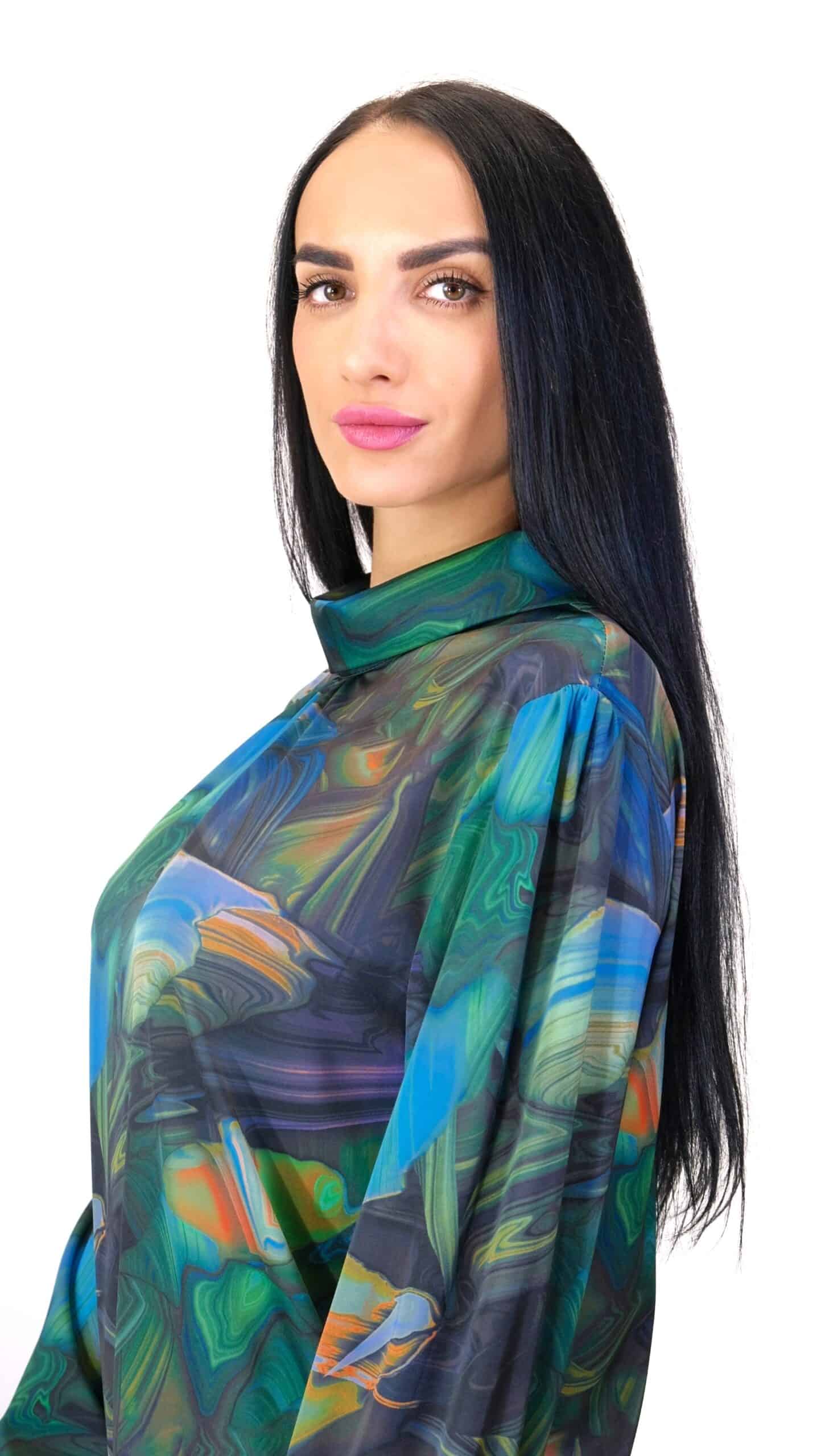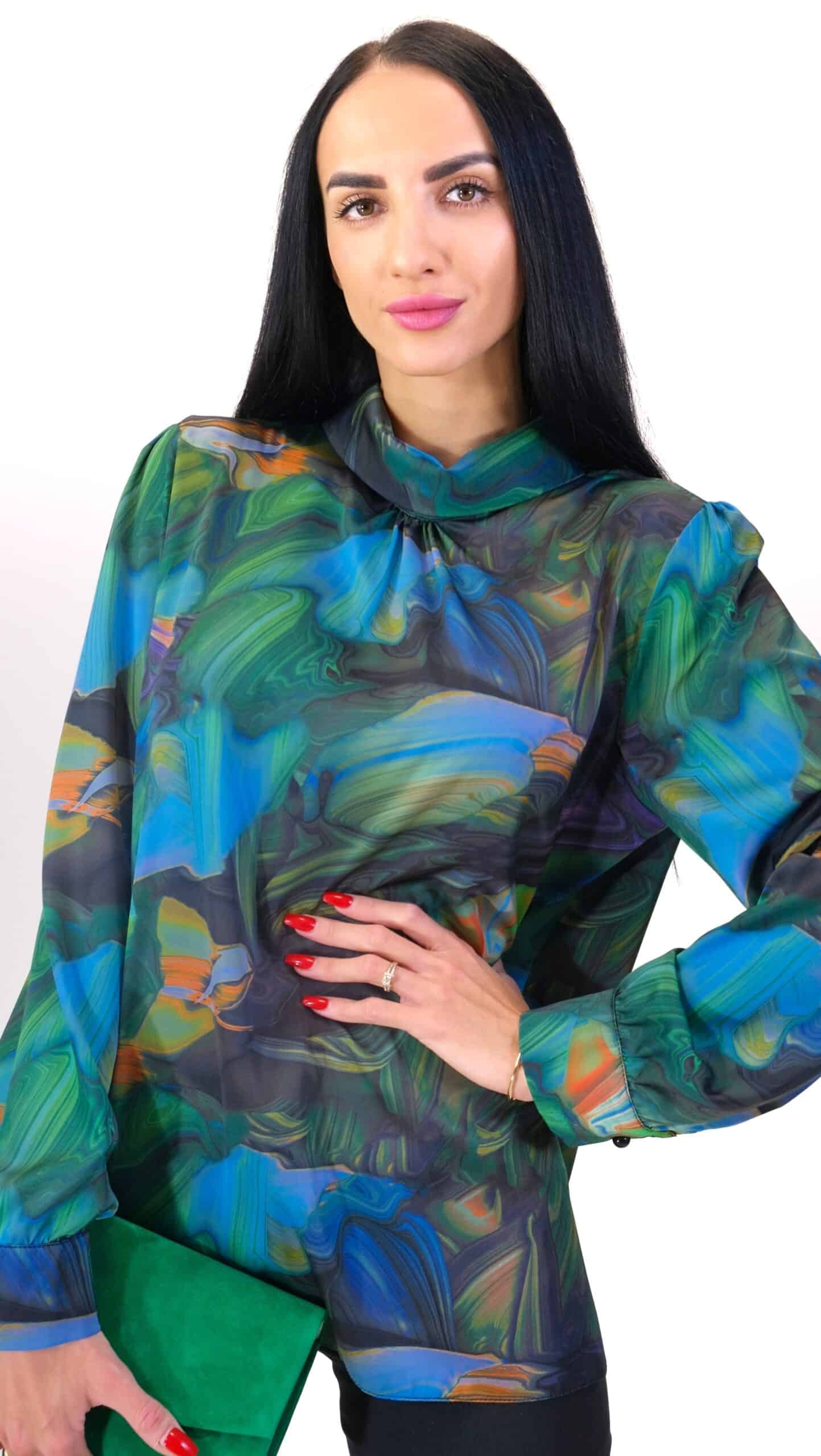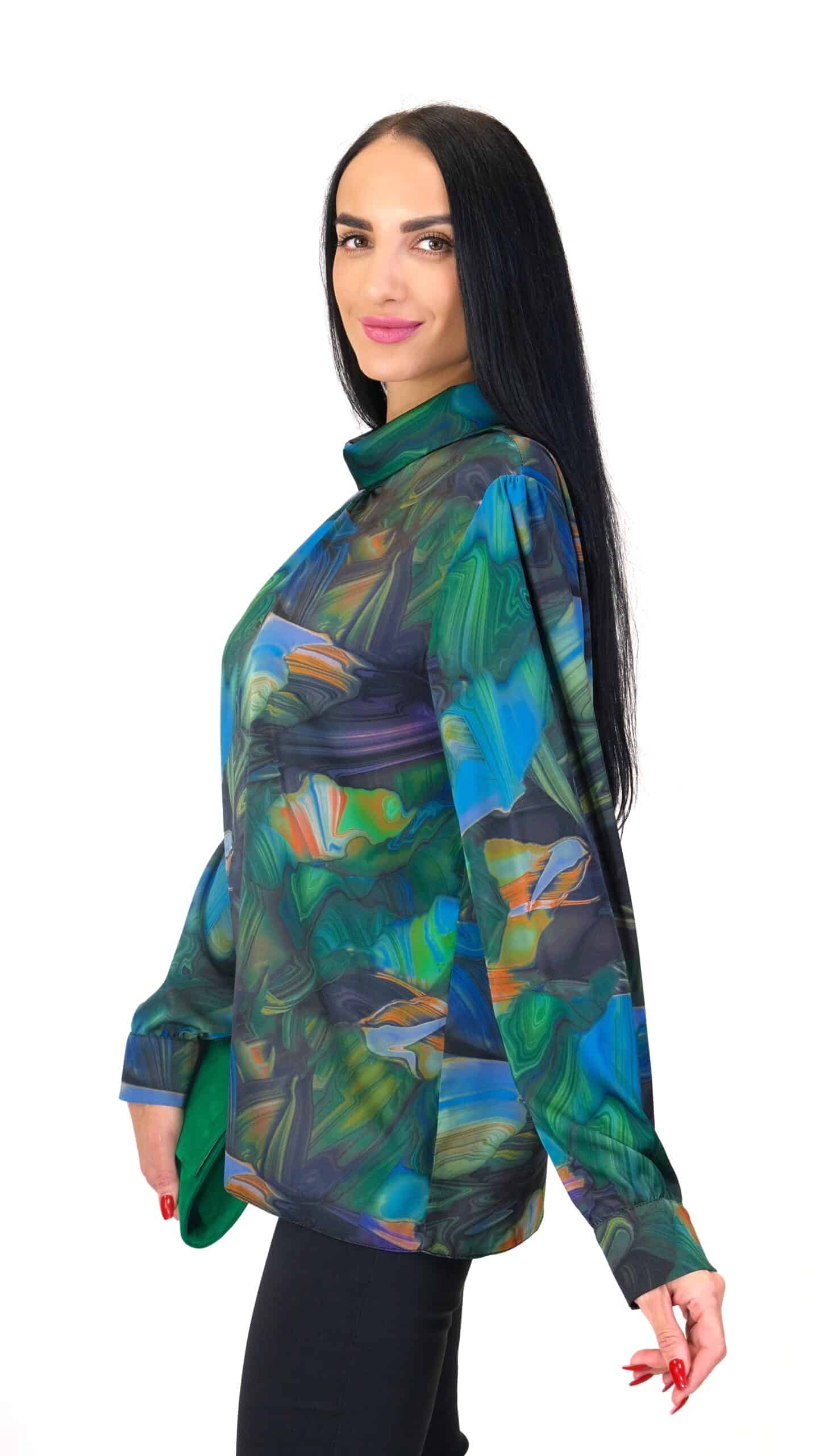 Top je ušitý v jednoduchom užšom strihu, ktorý nechá naplno vyniknúť prekrásnej potlači. Top je navrhnutý v abstraktnom motíve, v ktorom dominujú farby ako zelená, čierna a modrá. Top ľahko skombinujete s úzkymi čiernymi nohavicami. Top ma zaujímavo riešený golier, ktorý mu dodáva na plastickosti.