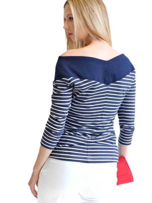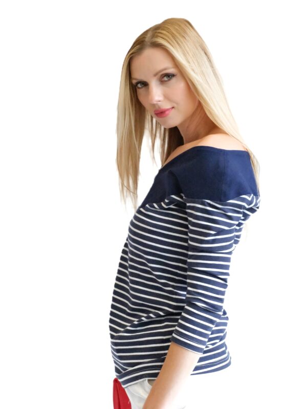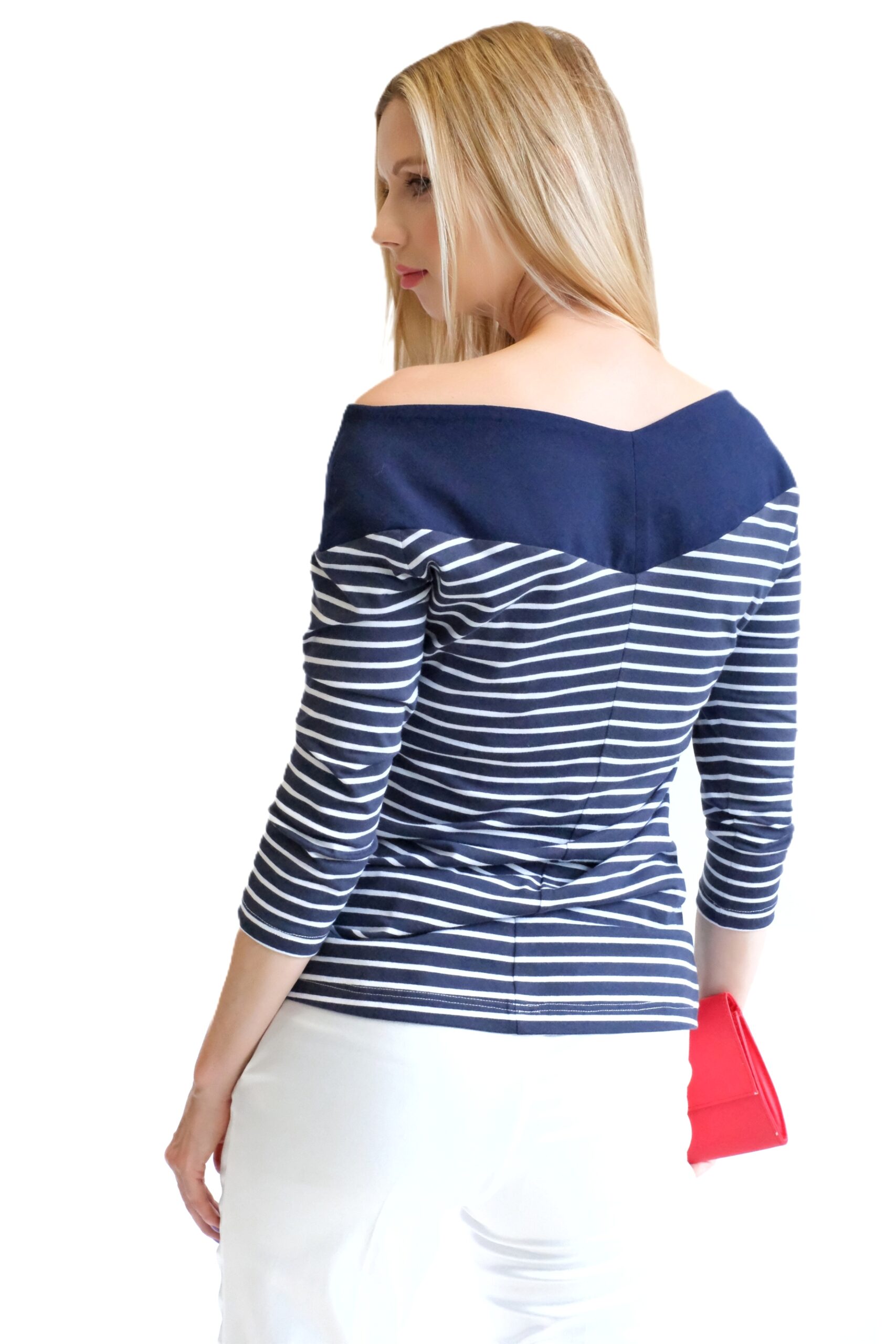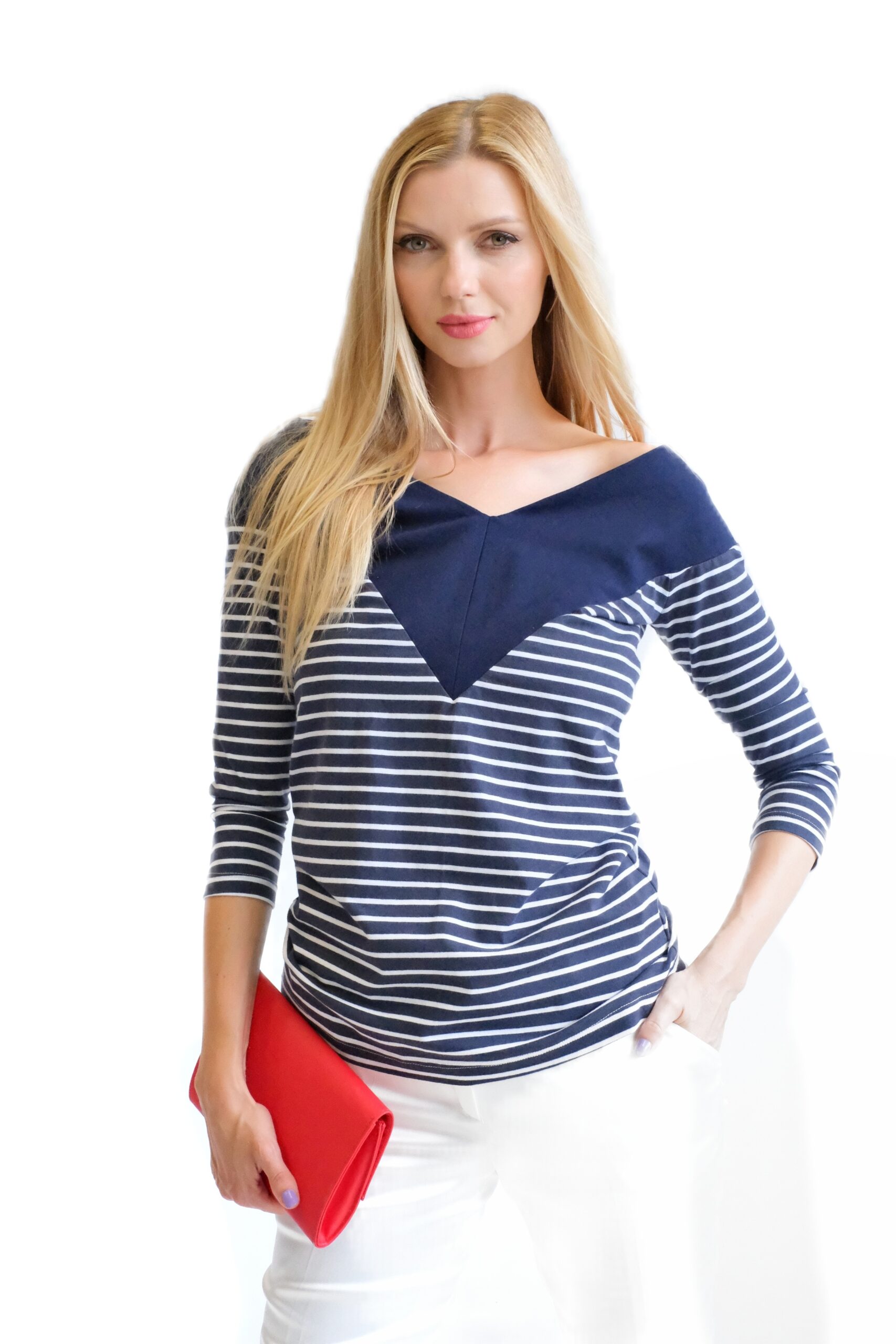 Top je ušitý z príjemného prispôsobivého materiálu, ktorý skvel sadne na postavu. Top je navrhnutý v “námorníckom motíve” v kombinácii s prúžkami. Top poľahky skombinujete so širokou paletou farieb. Kombinujte s úzkymi bielymi nohavicami a červenými doplnkami ako naša stylistka.