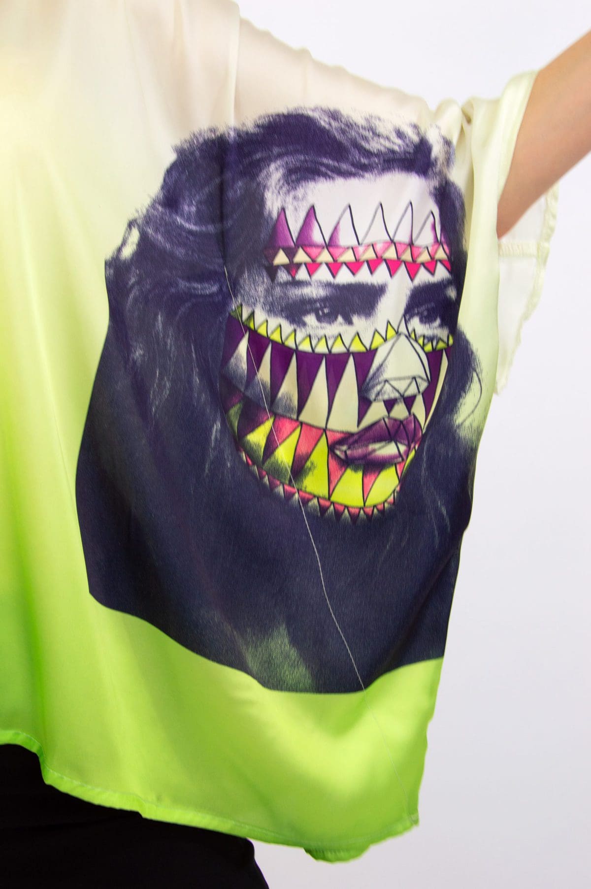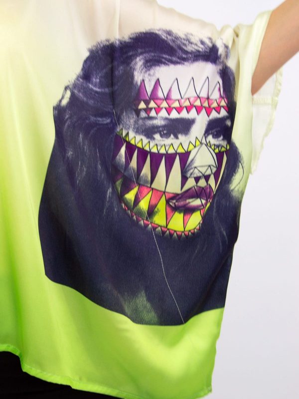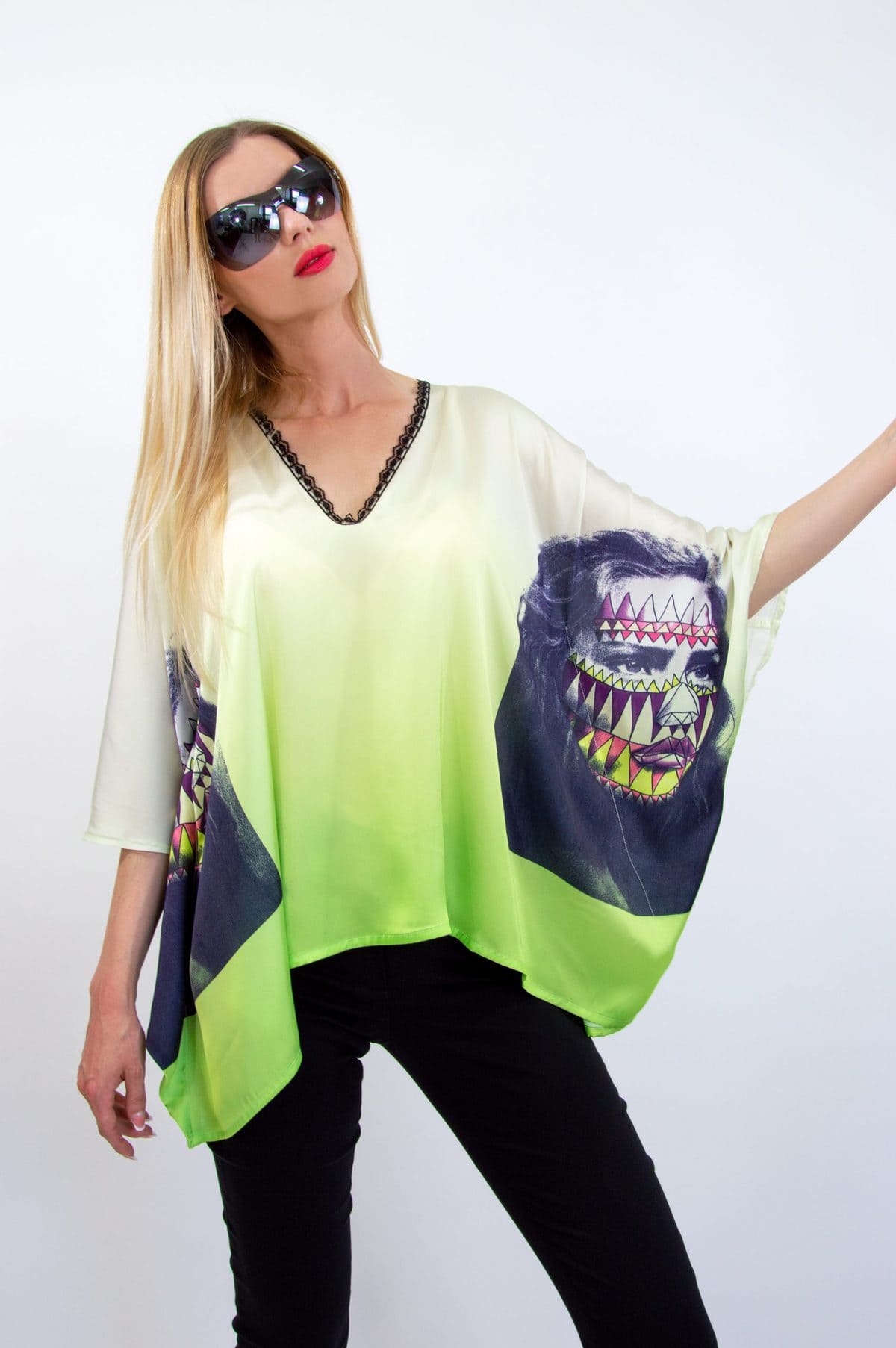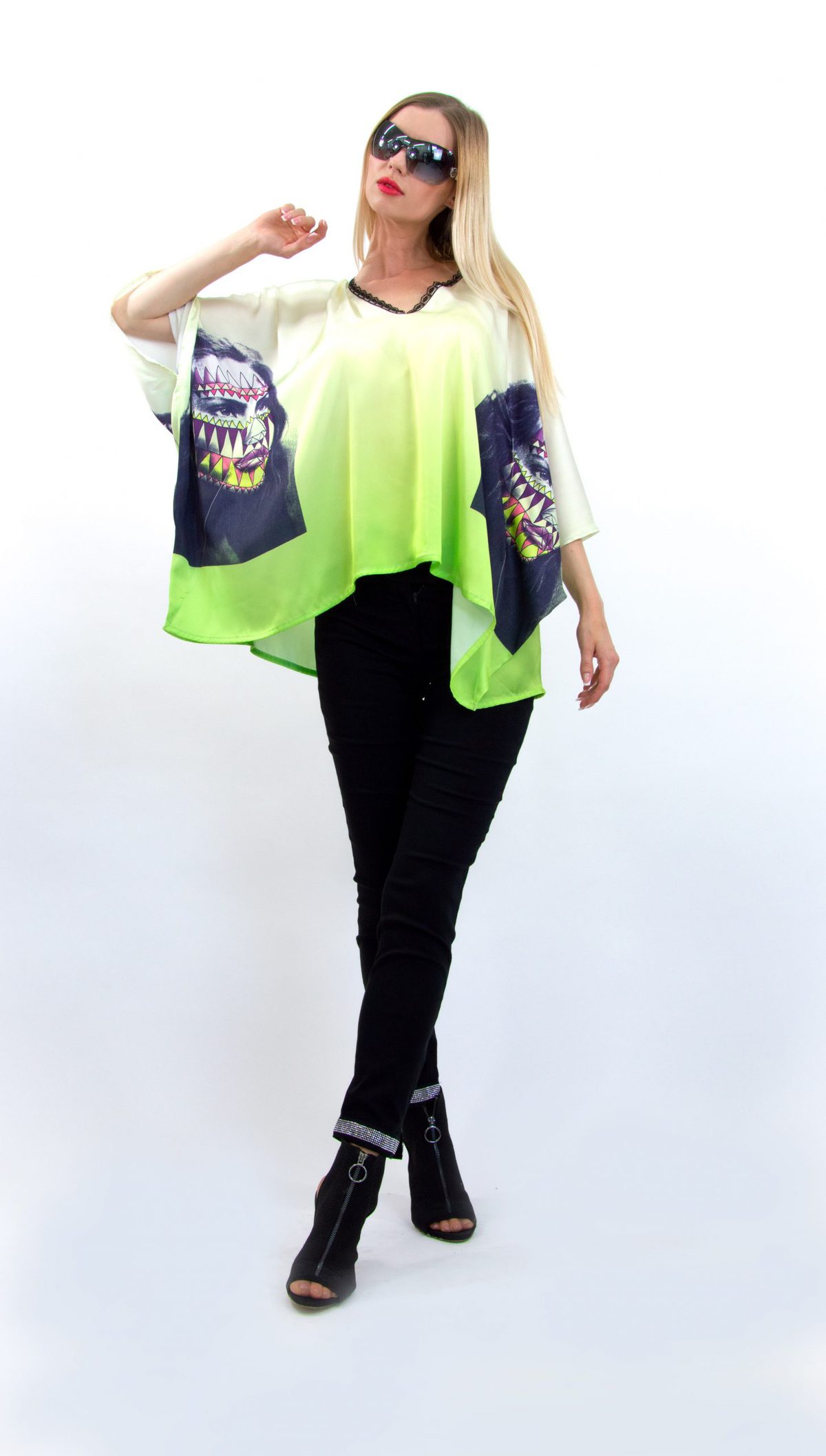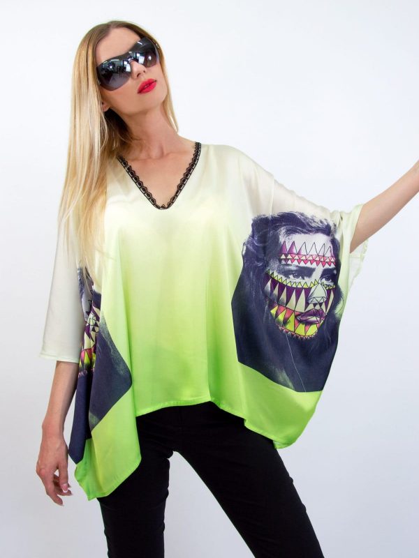 Jednoduchá tunika oversize strihu. Tunika je v letnej pastelovej zelenej s jednoduchým vzorom. Zaujímavým detailom sú netradične riešené rukávy, ktoré sú súčasťou tuniky a dodávajú jej éterický vzhľad.