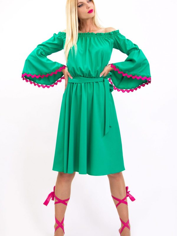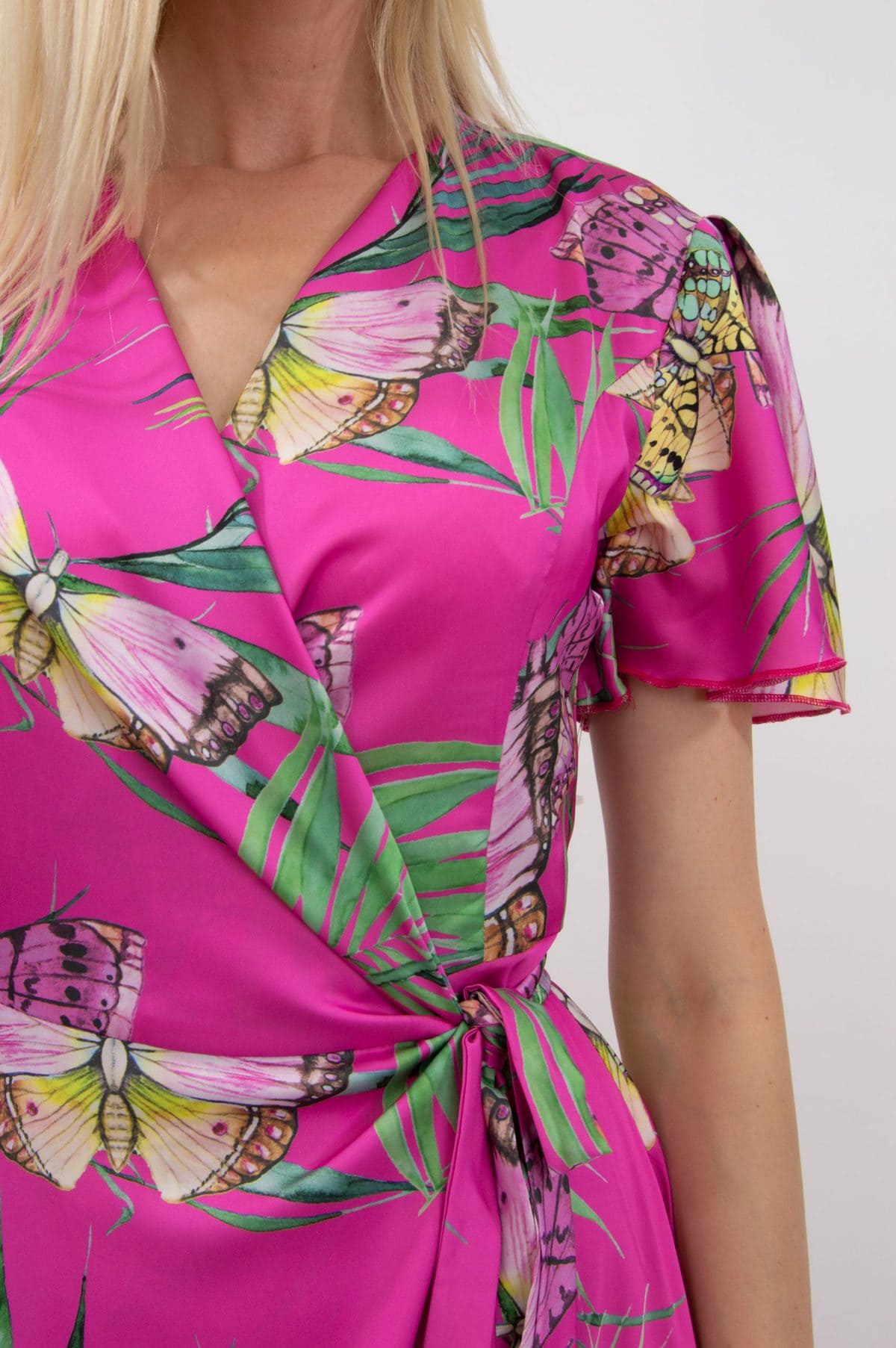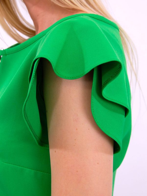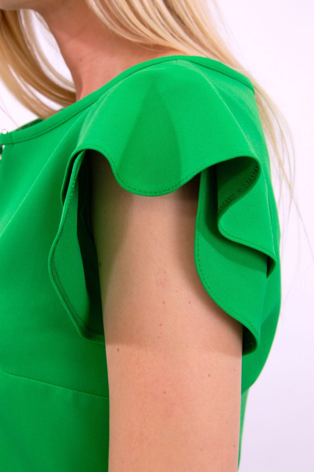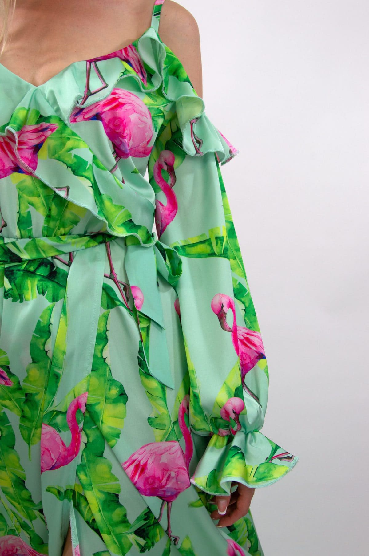 Jednoduchá tunika oversize strihu. Tunika je v letnej pastelovej zelenej s jednoduchým vzorom. Zaujímavým detailom sú netradične riešené rukávy, ktoré sú súčasťou tuniky a dodávajú jej éterický vzhľad.