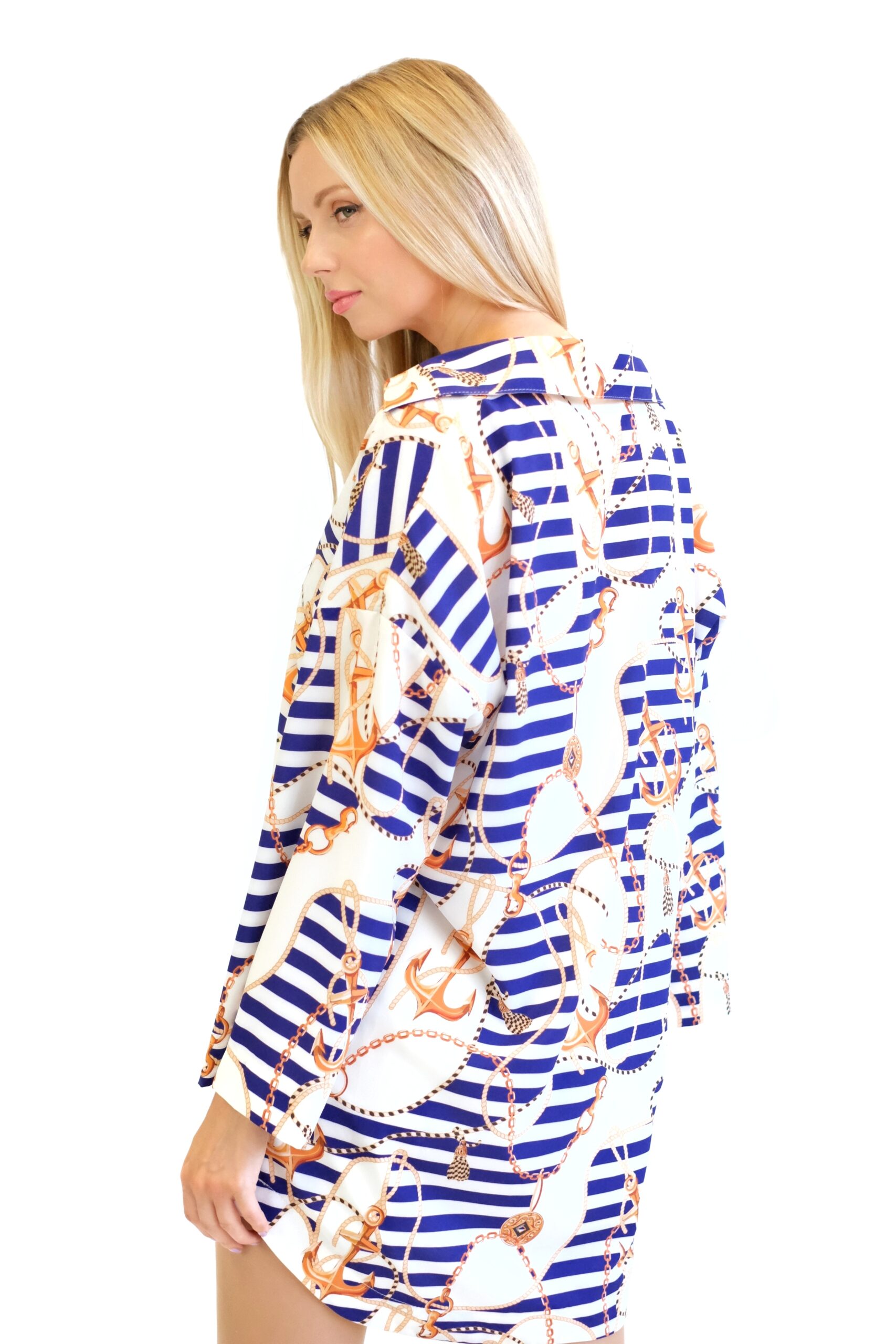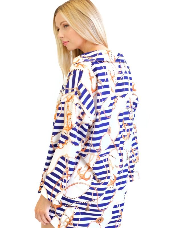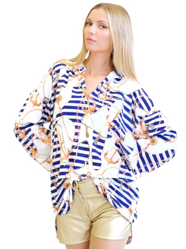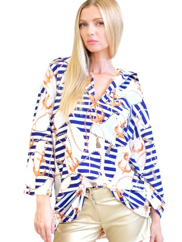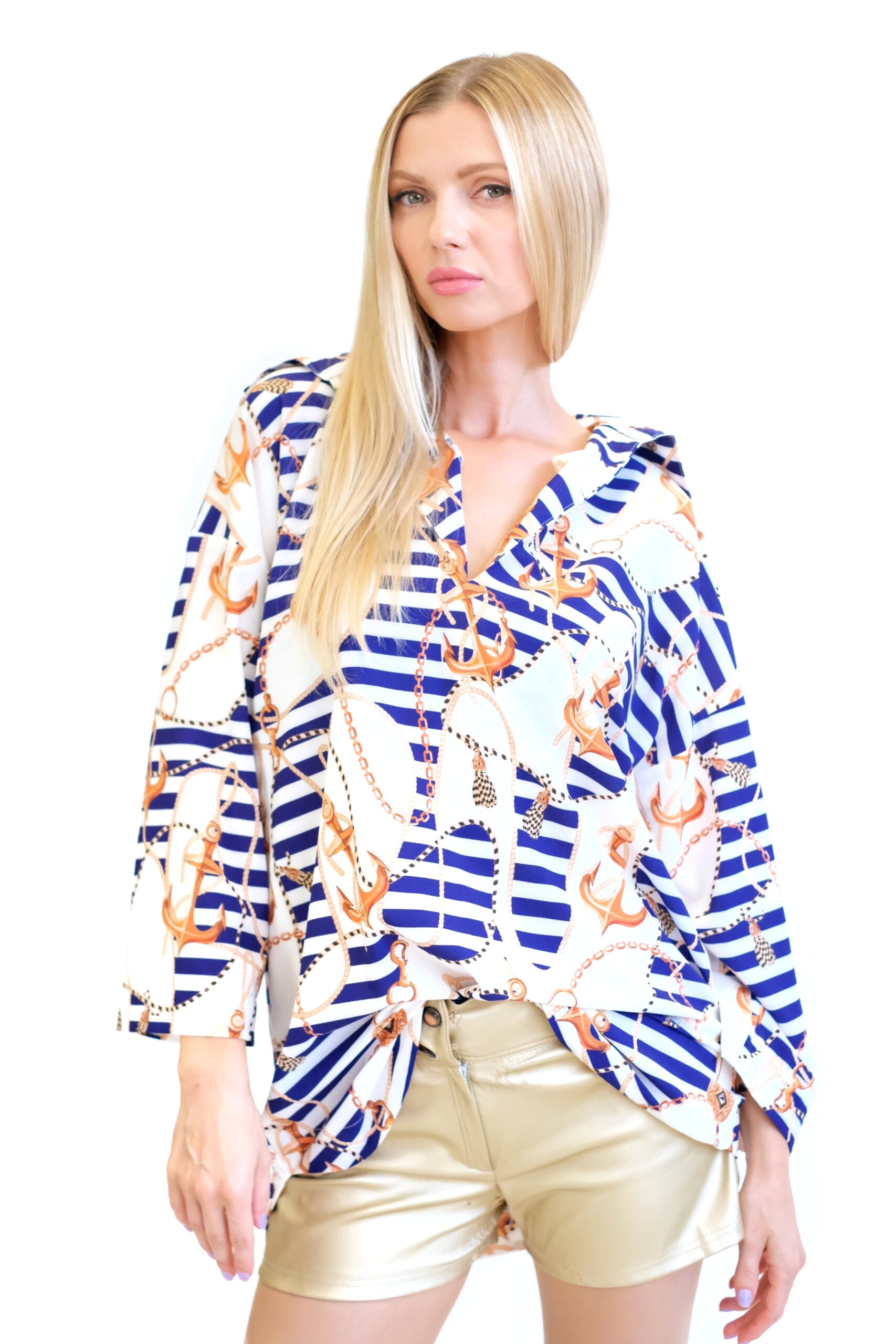 Tunika je navrhnutá v pohodlnom áčkovom strihu, ktorý výborne sadne na každý typ postavy. Vrchná čast tuniky je inšpirovaná košeľovým strihom. Tunika má silný námornícky motív v typicky letnej kombinácii modrého prúžku a zlatých lán. Tunika je ušitá z ľahkého materiálu, v ktorom sa budete cítiť skvele aj počas horúcich dní.
